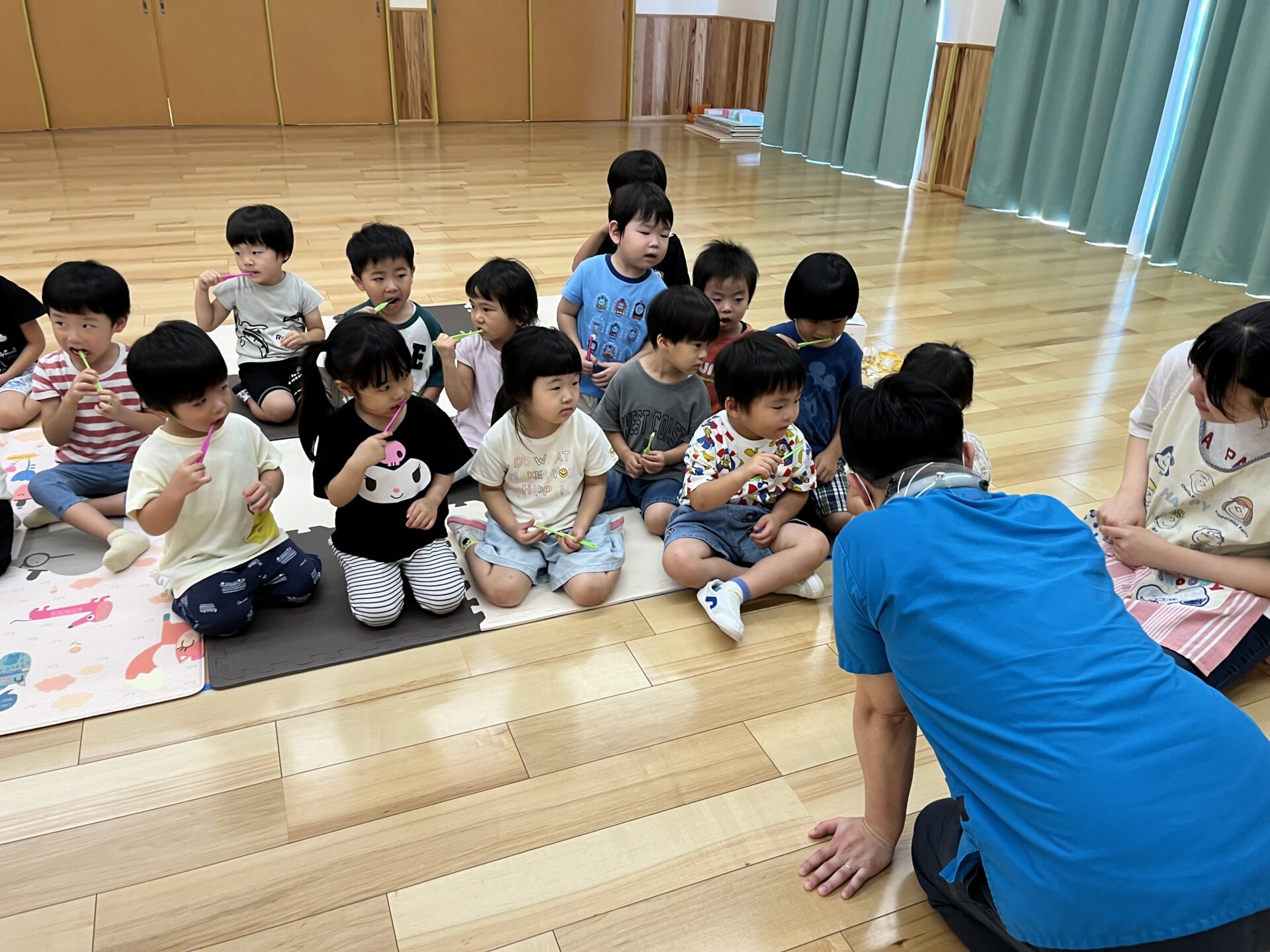 「朝、お家でも磨いてきたんだよ。」「歯、きれいになってる?」と、子どもたちは、見てもらうのがうれしくてたまらない様子です。