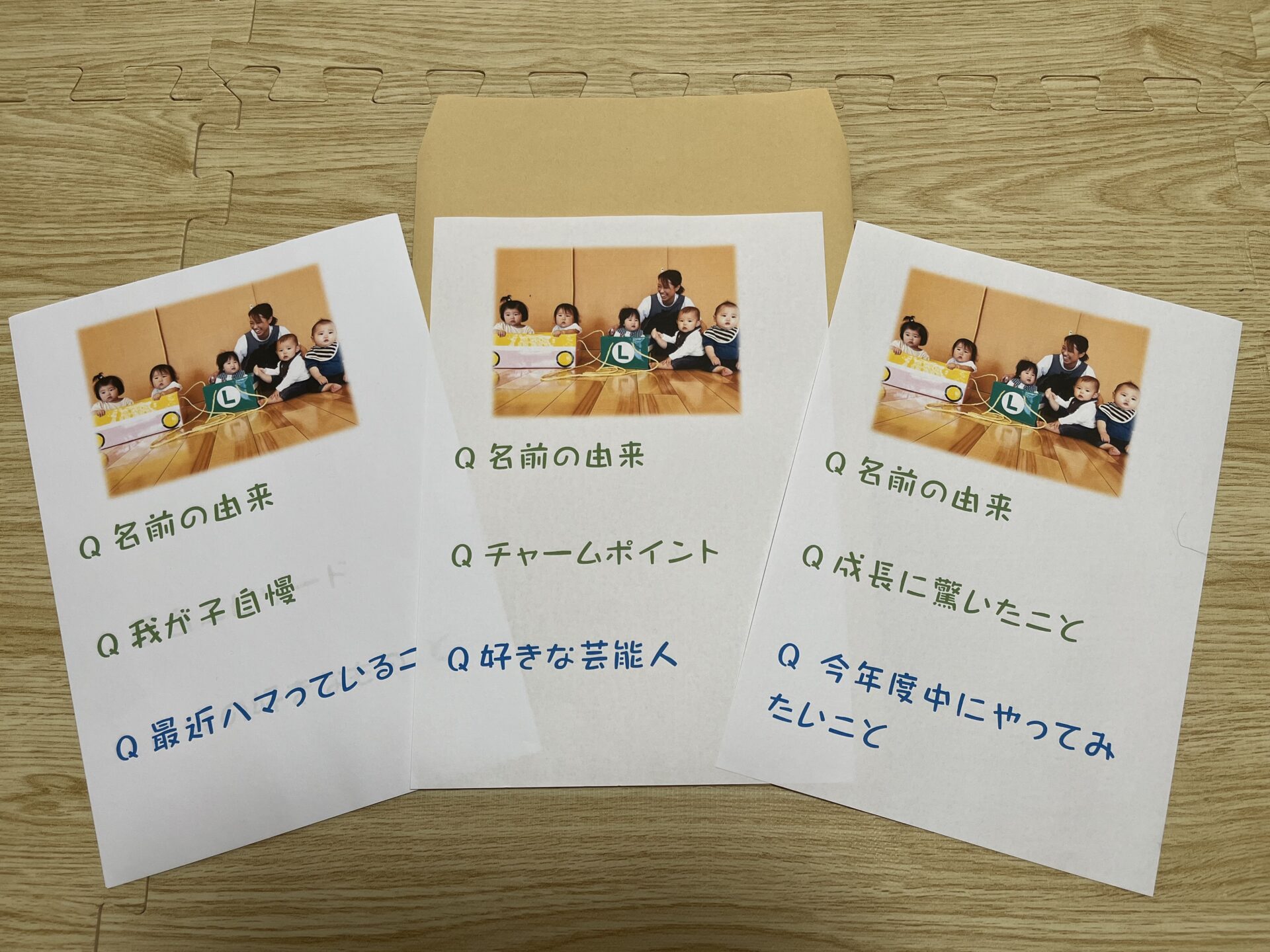 『名前の由来』は共通の質問、もうひとつは、別々の質問をさせていただきました。願いがたくさんこめられた名前の由来や、ご家庭での可愛らしい様子や成長の姿など、愛の溢れるお話しを聞かせていただきました。