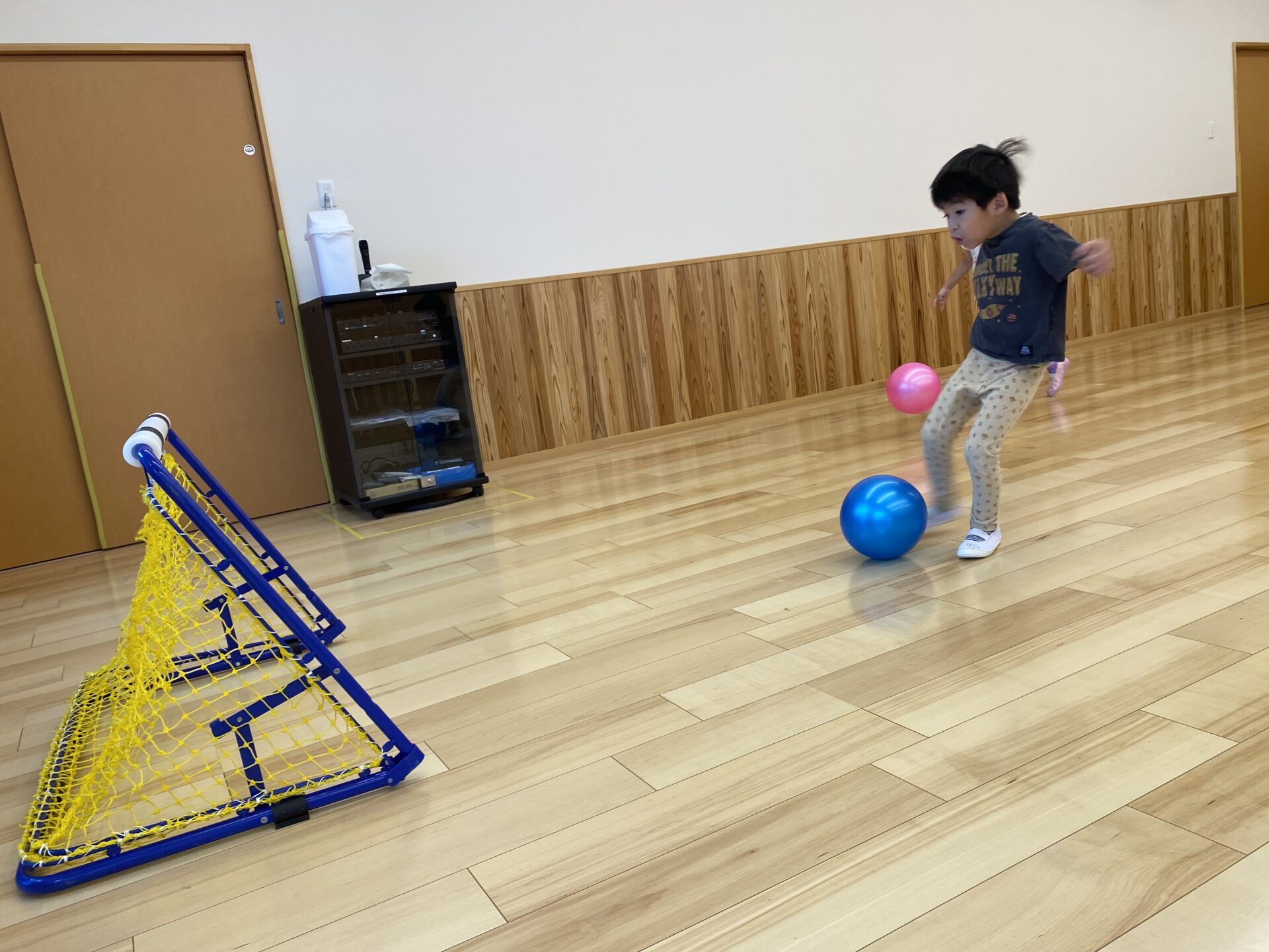 日頃から運動あそびを楽しんでいるそら・つき組です。今年から始まったアルビレックスサッカー教室では、ボールを使っていろいろな動きを楽しんでいます。ゴールが決まると「やったー!」「先生見て!」と嬉しそうにしています。
