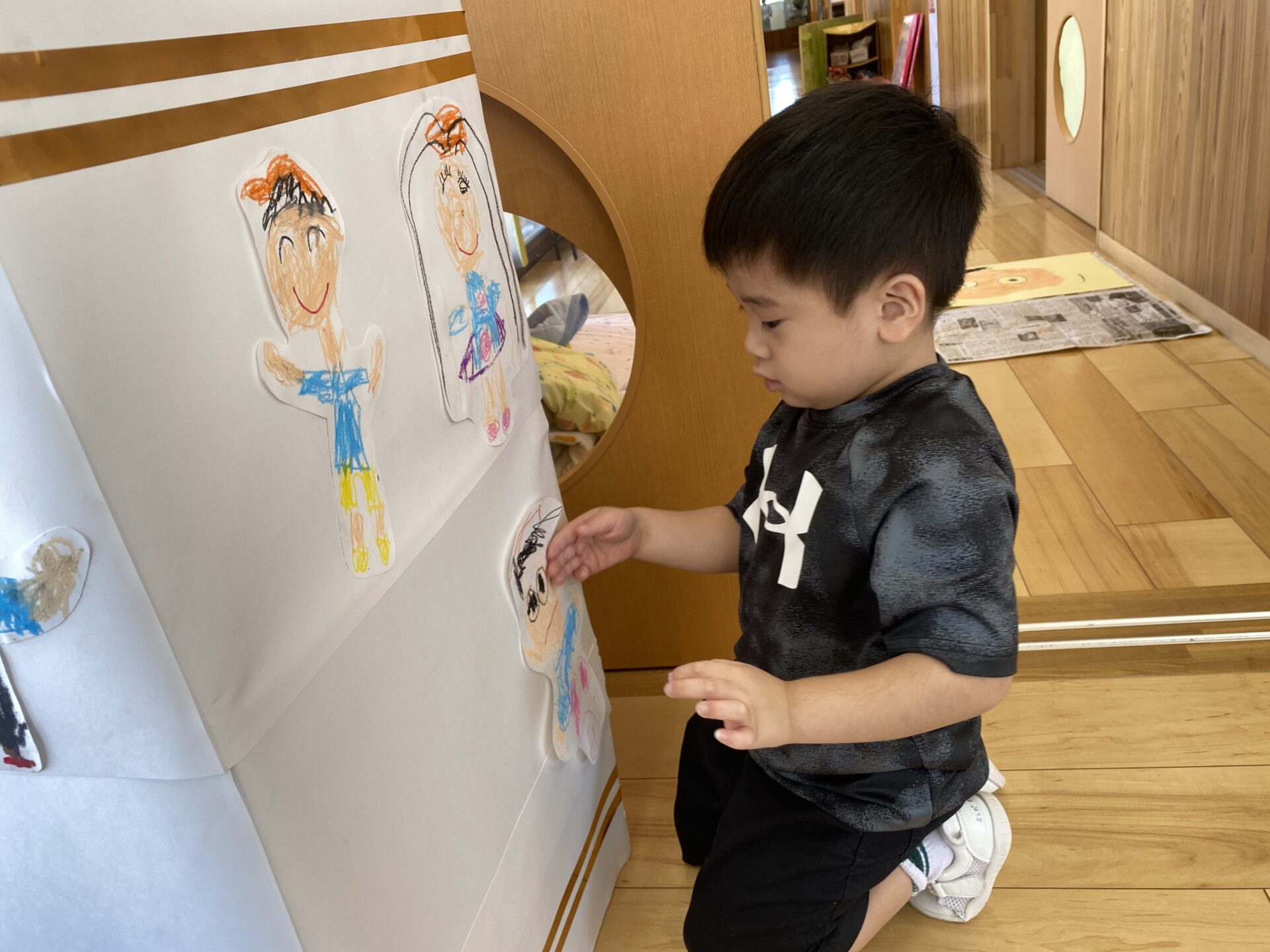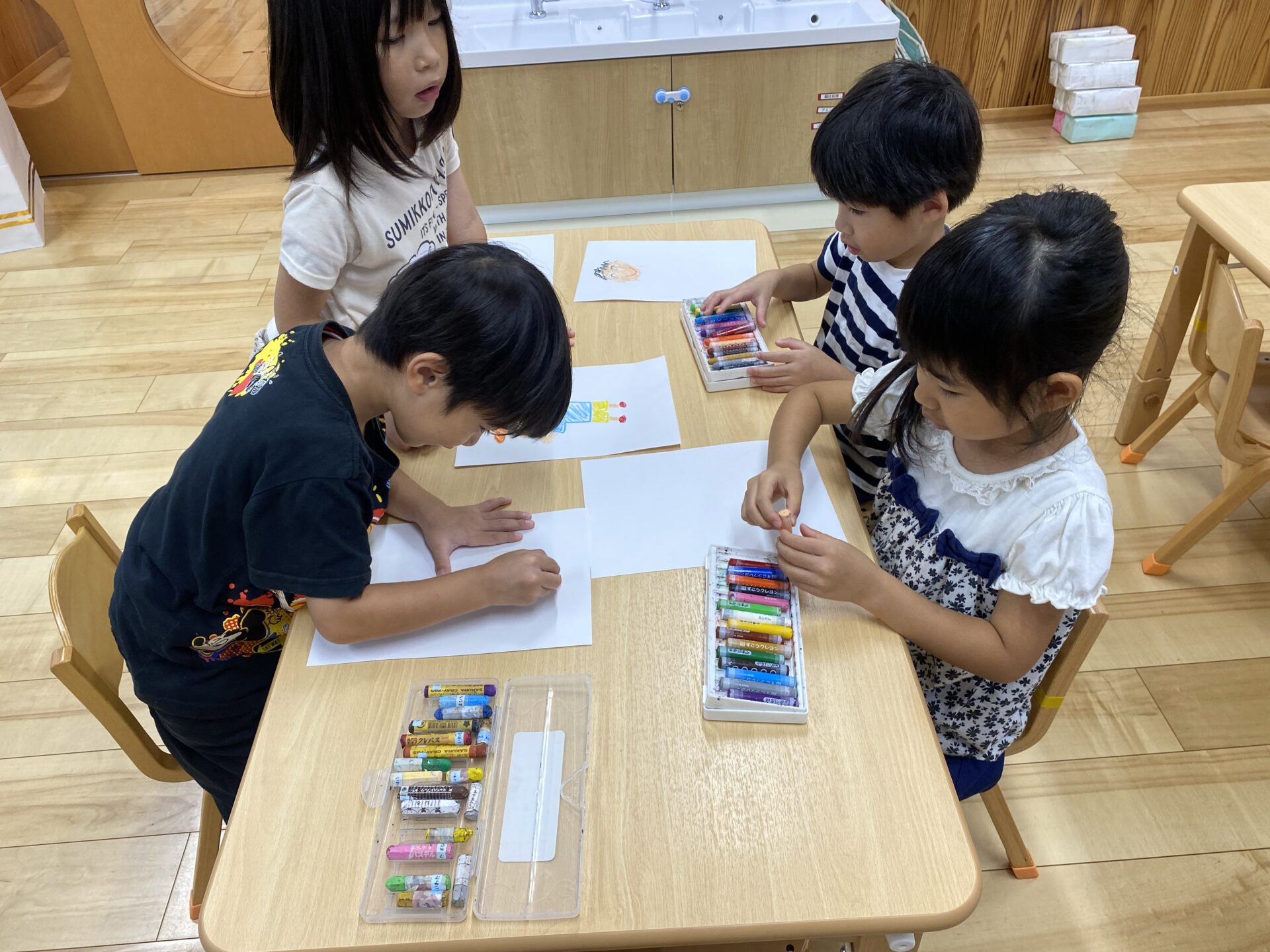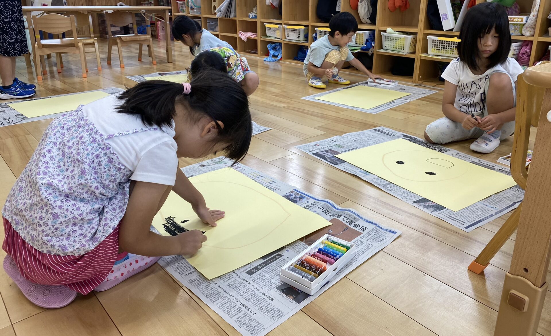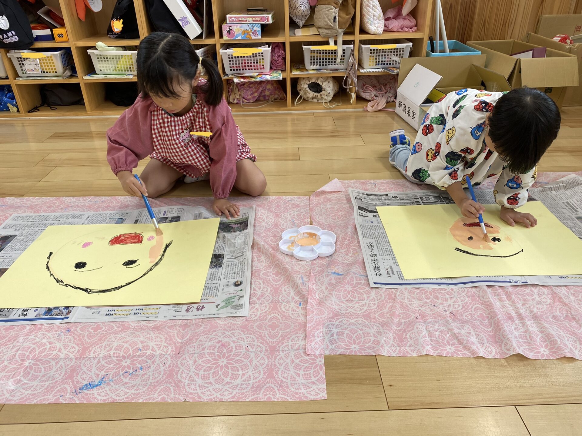 大きな画用紙いっぱいに「自分のかお」を描きました。「大きく描くと見えるよね!」「ほっぺ描くとかわいい」「〇〇ちゃんの絵上手だね!」と会話もはずんでいました。クレヨンで描き終えたら、絵の具で色を塗ります。真剣な表情で筆を握り、はみ出してしまわないように丁寧に塗っていました。みんなの絵がどのように飾られるか楽しみです✨