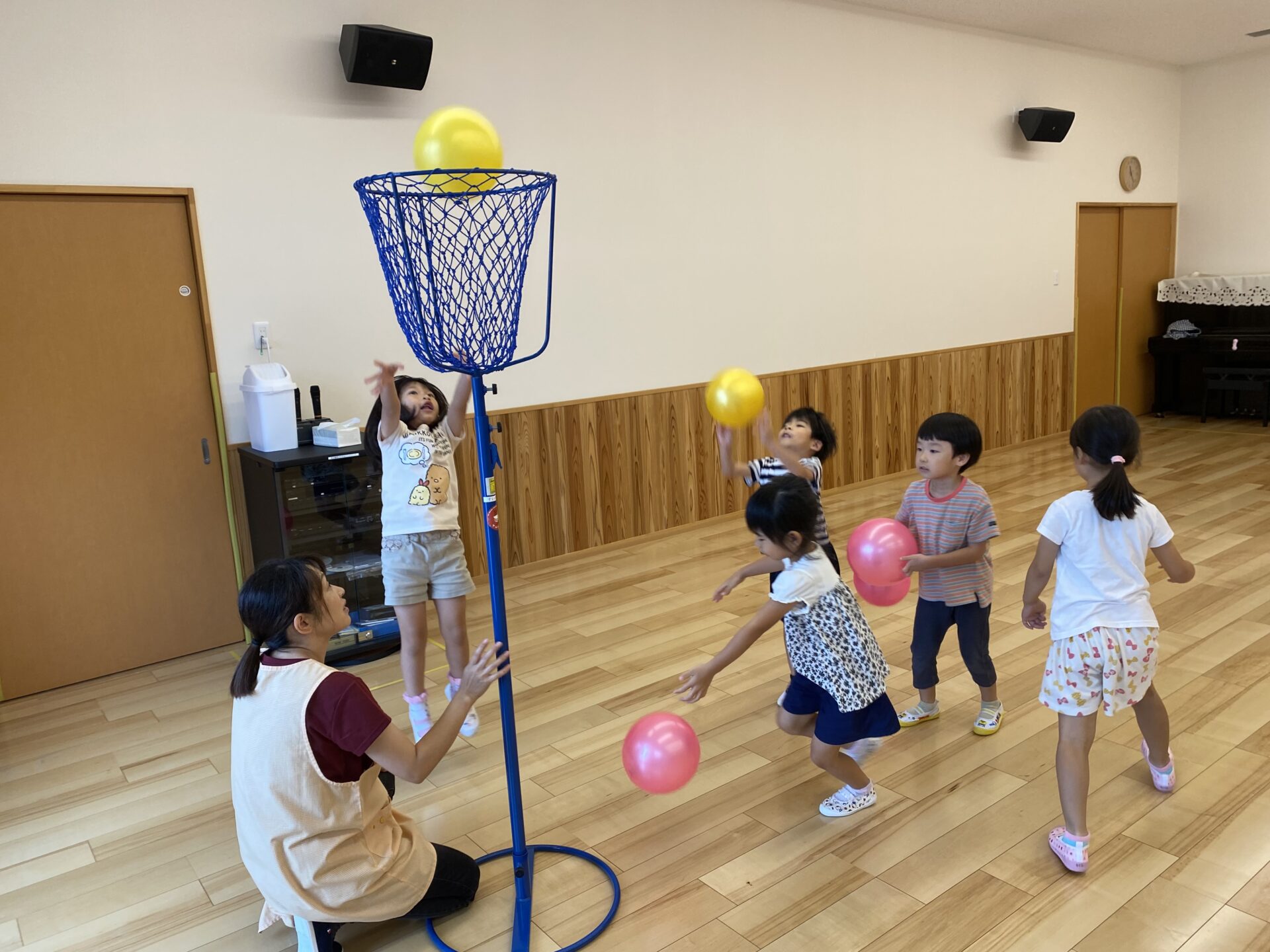玉入れのカゴをゴールに見立て、バスケットボールも楽しんでいます。ゴールが高いので、なかなか入らず「難しい…」と悔しがっていましたが、あきらめず練習を重ね、入る回数が増えてくると目がキラキラ✨「今日は3回入った!」と誇らしげに教えてくれ、自信につながったようです。
