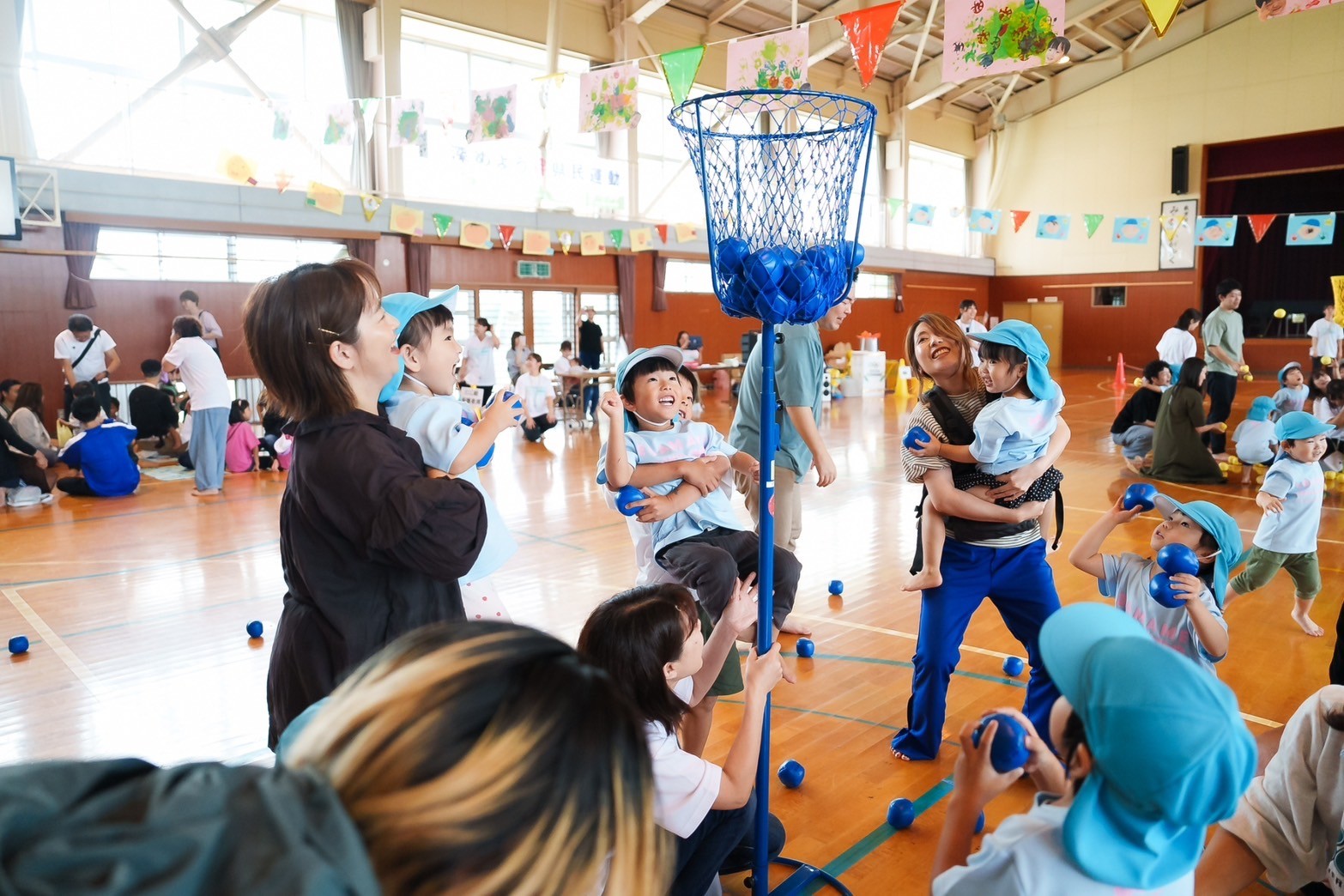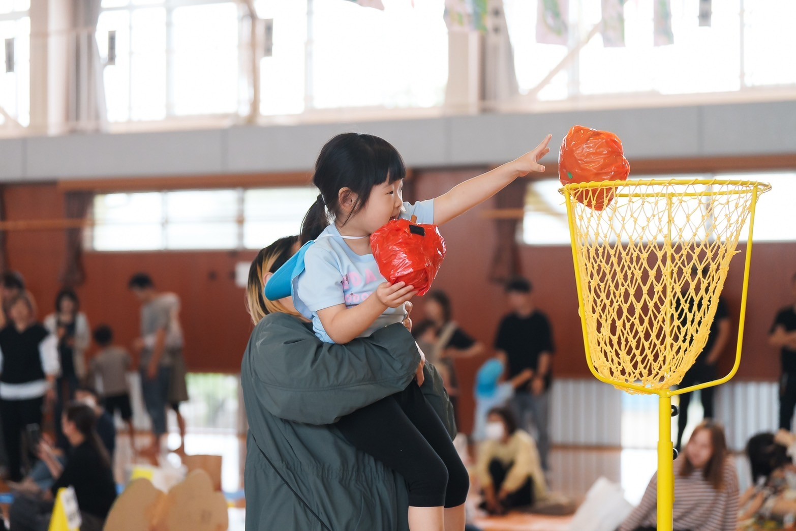 曲が止まると白熱した玉入れのスタートです!