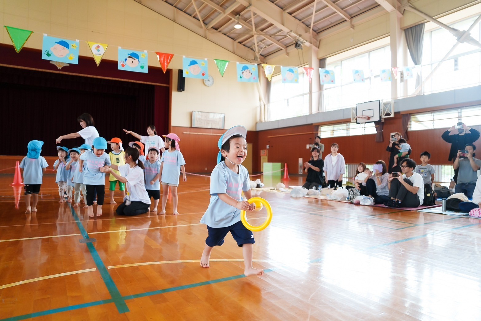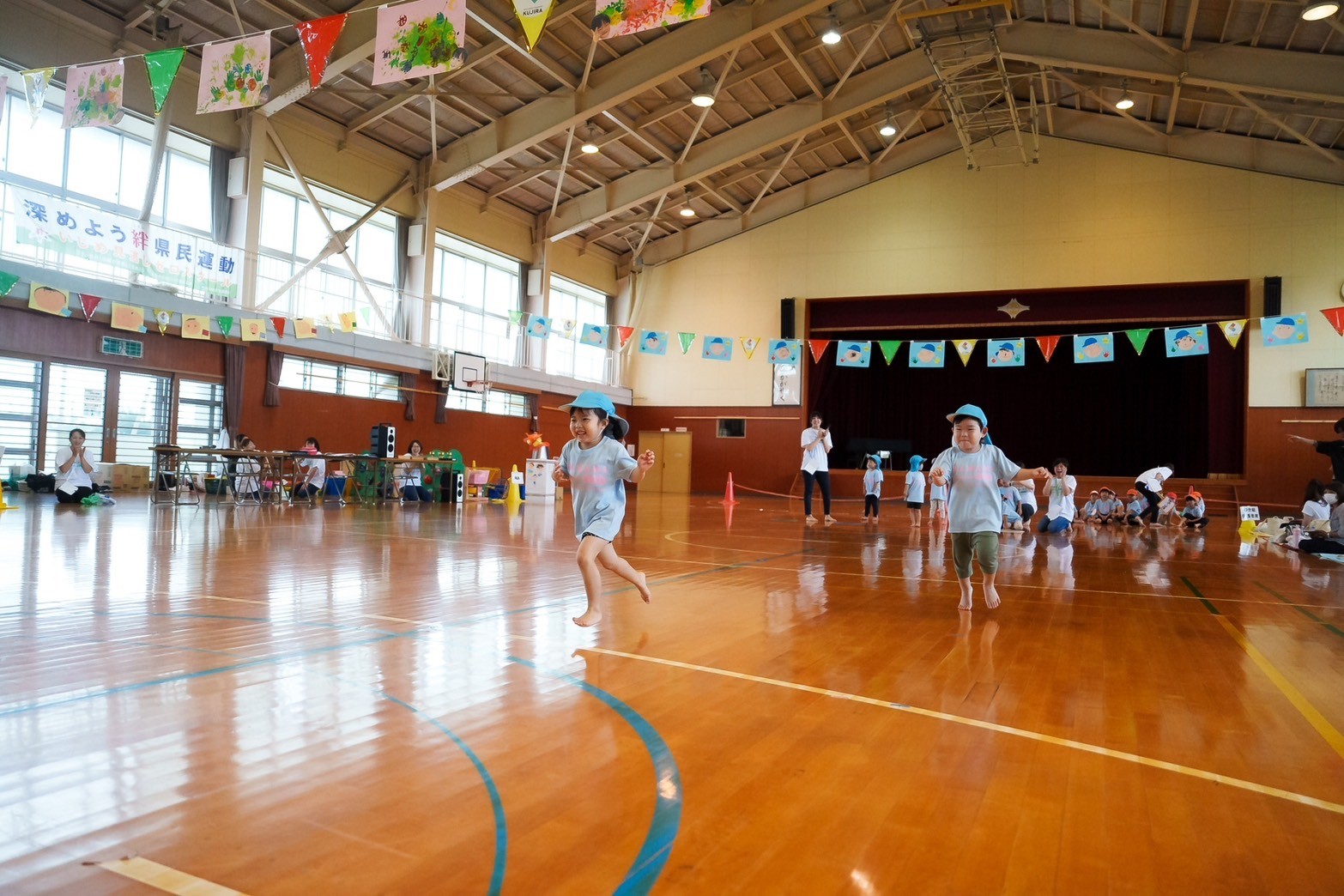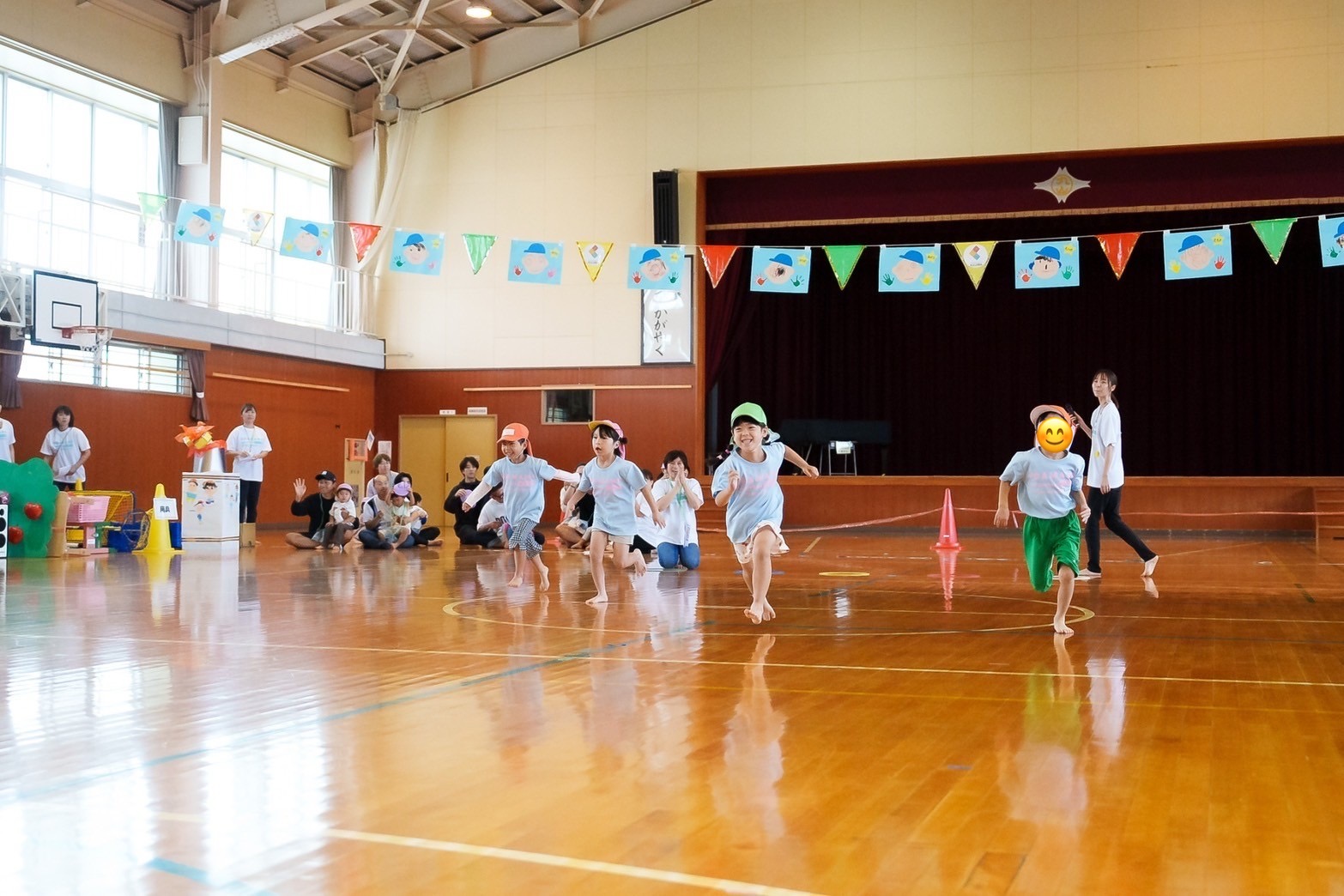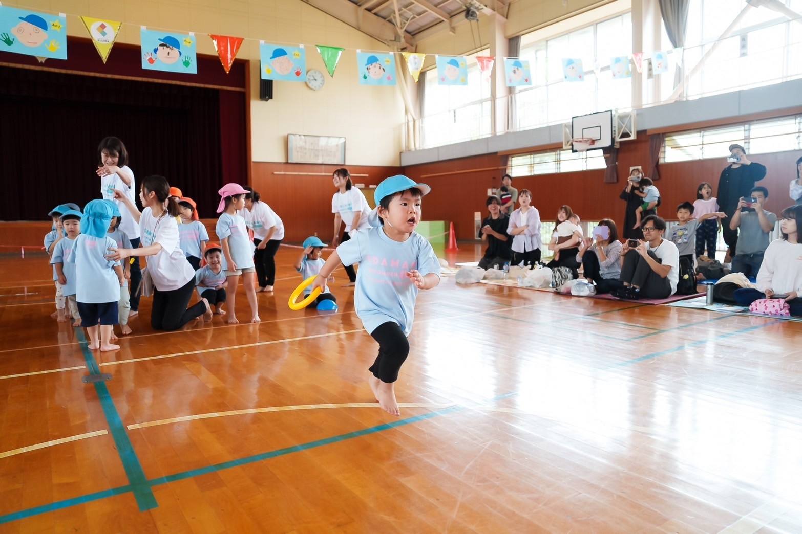 園のホールから飛び出して、小学校の体育館で行いました。
