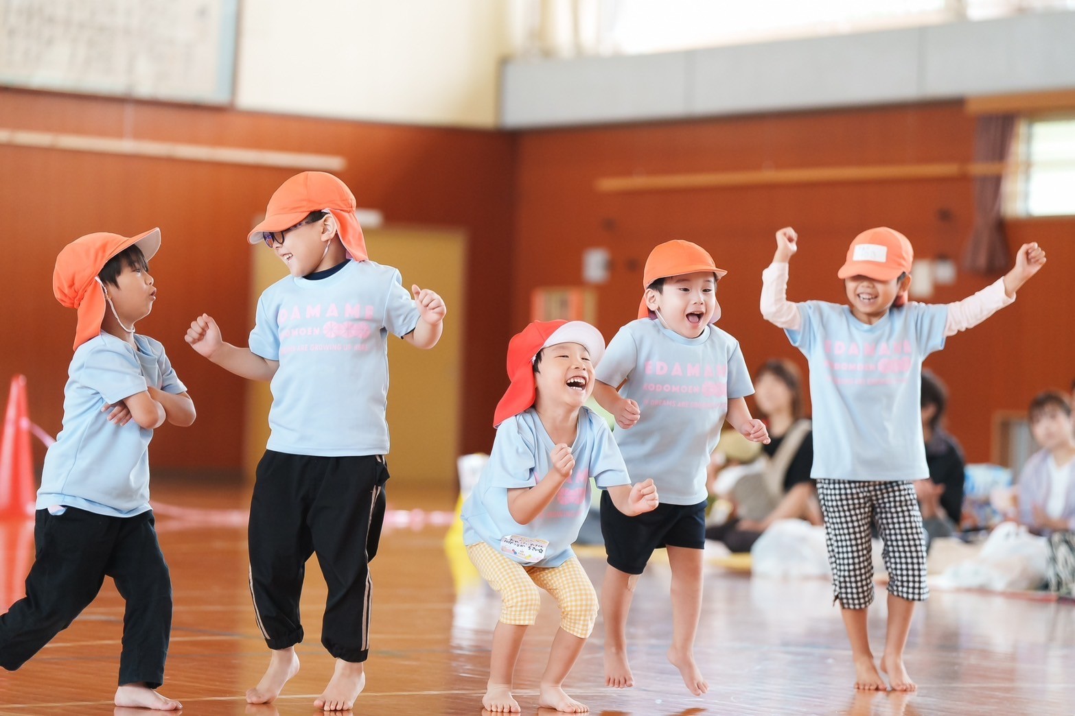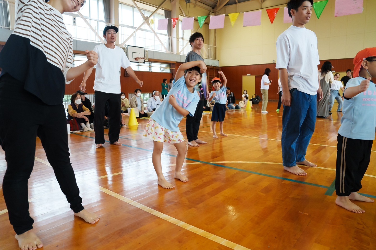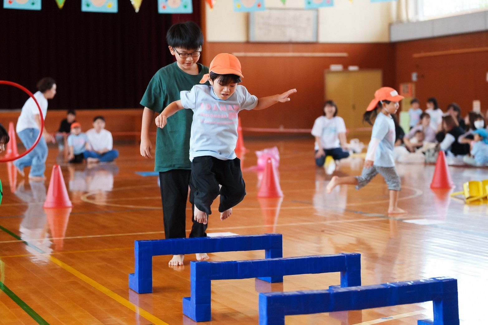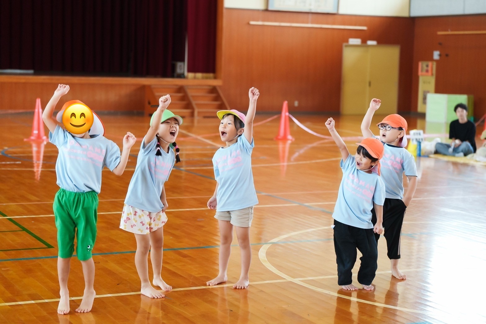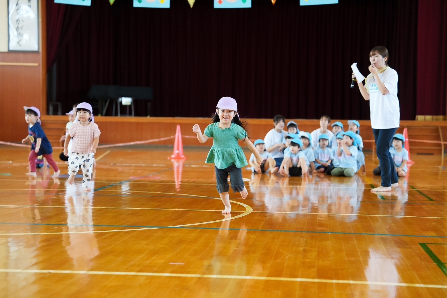 園のホールから飛び出して、小学校の体育館で行いました。