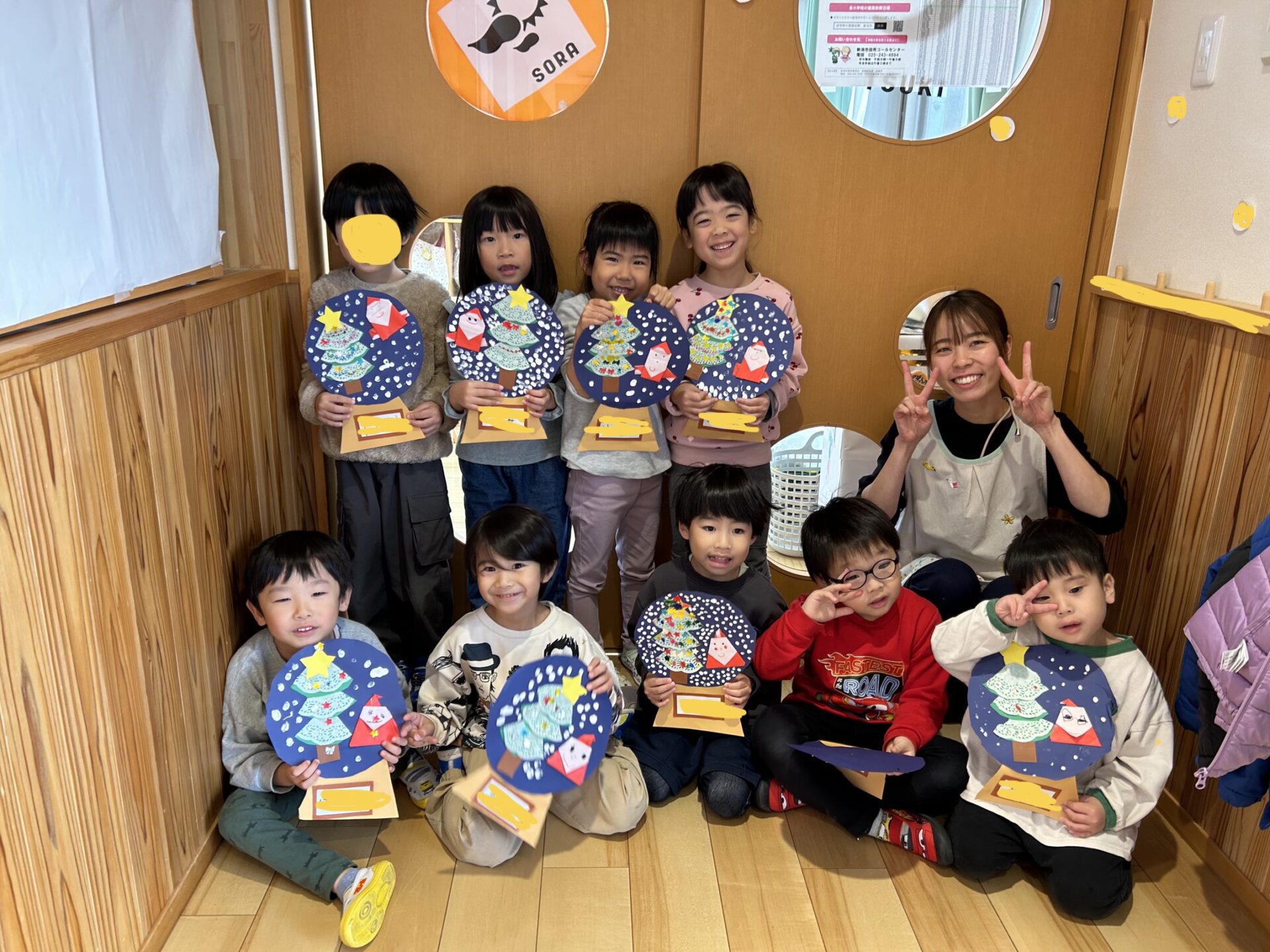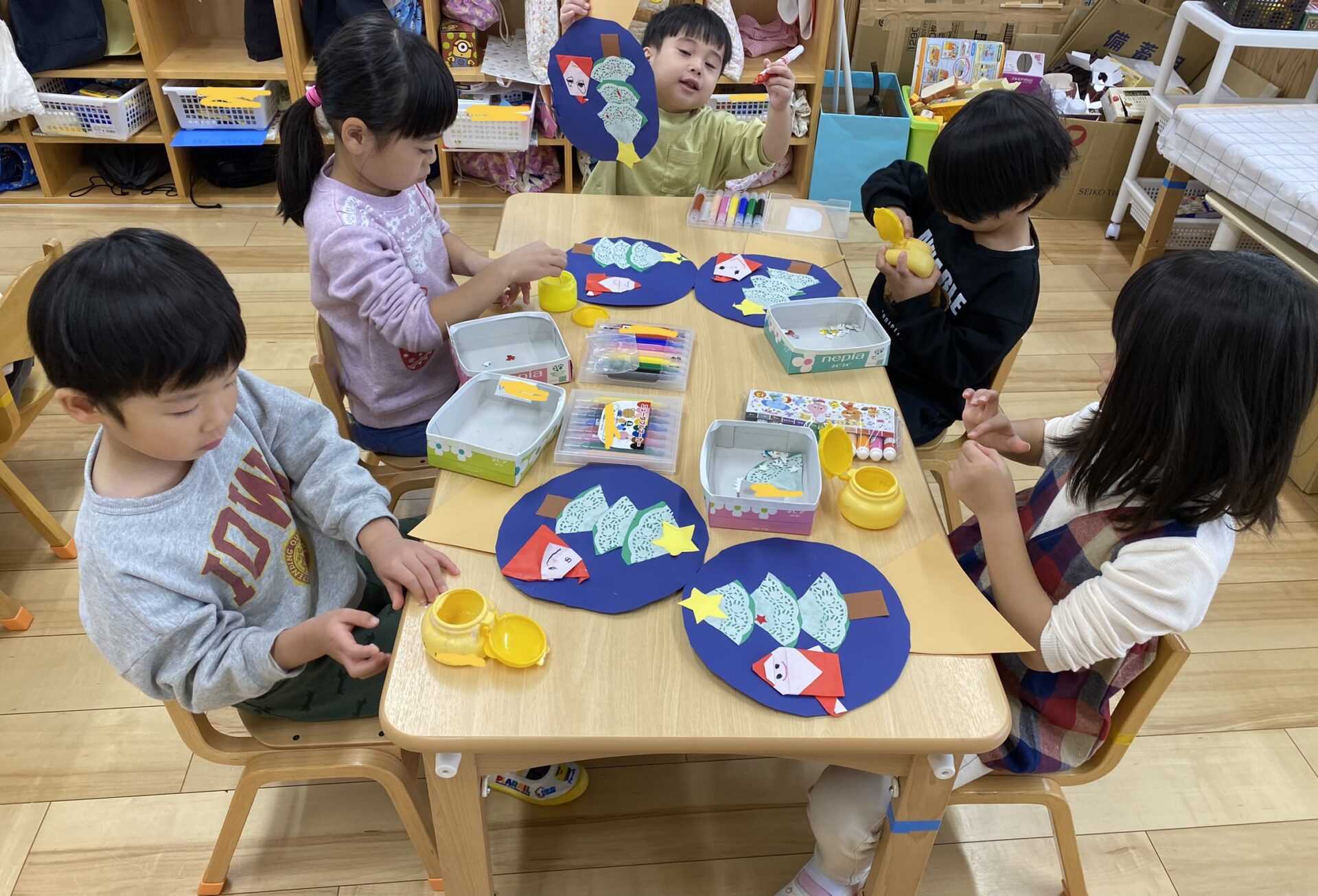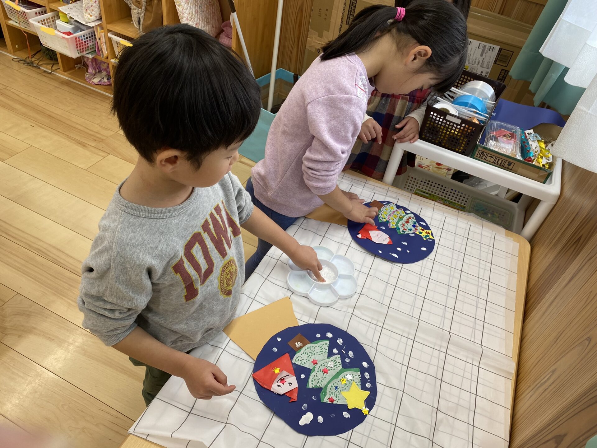 「スノードームって、きれいだよね」「キラキラを付けたいな」とはりきってスノードーム作りをしました。園内に飾りましたのでぜひ、ご覧ください。