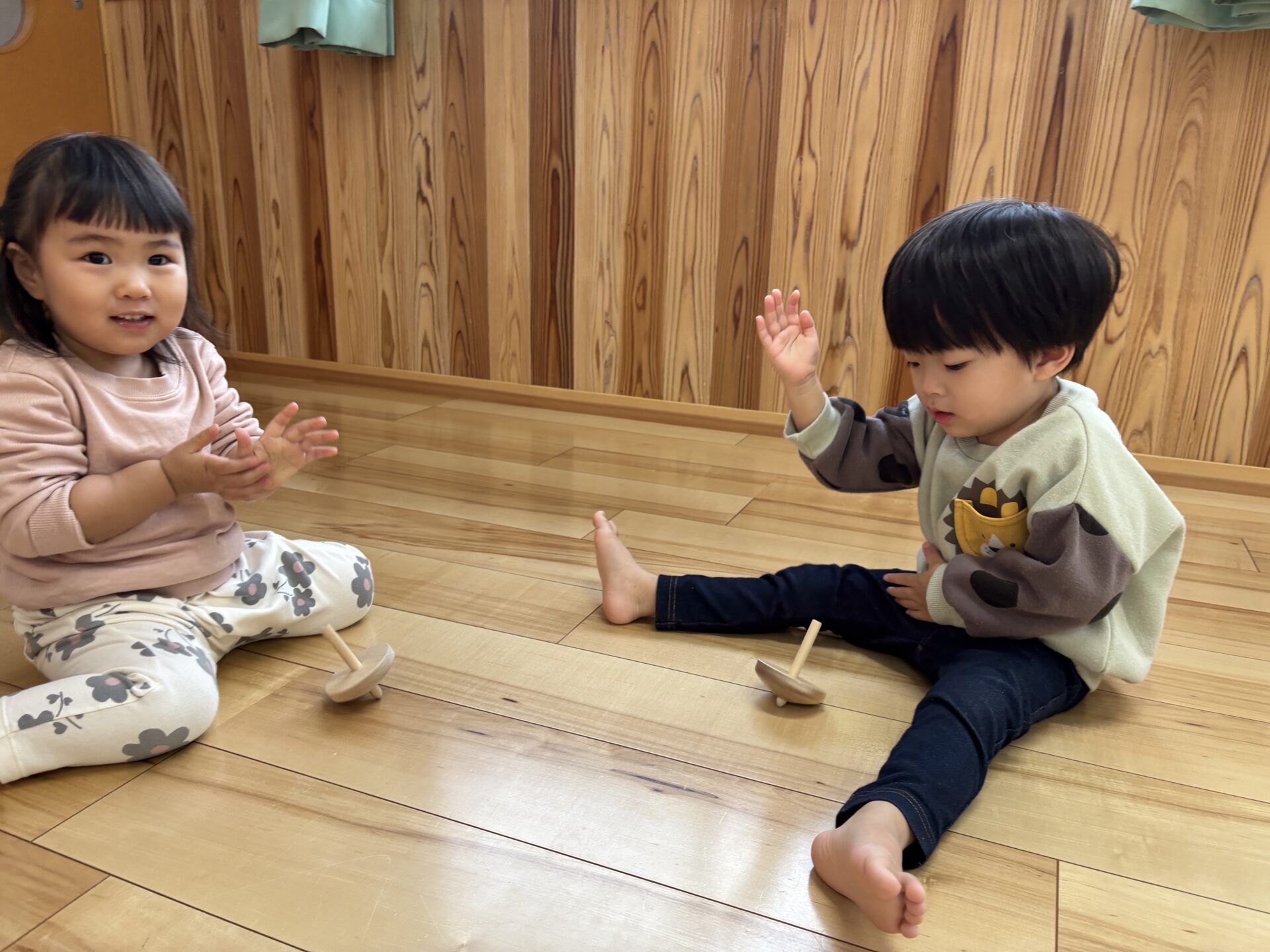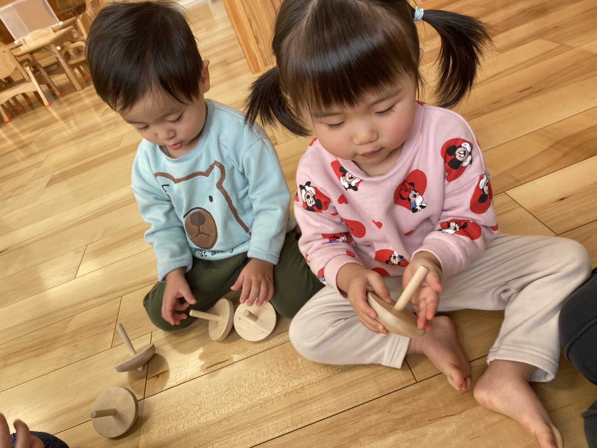 保育者が回して見せると、クルクル回る様子に興味津々です♪