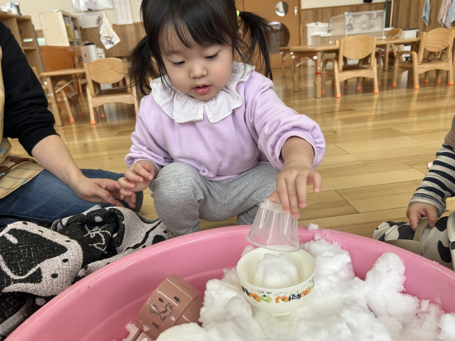 タライに雪を入れて、お部屋で雪あそびをしています。