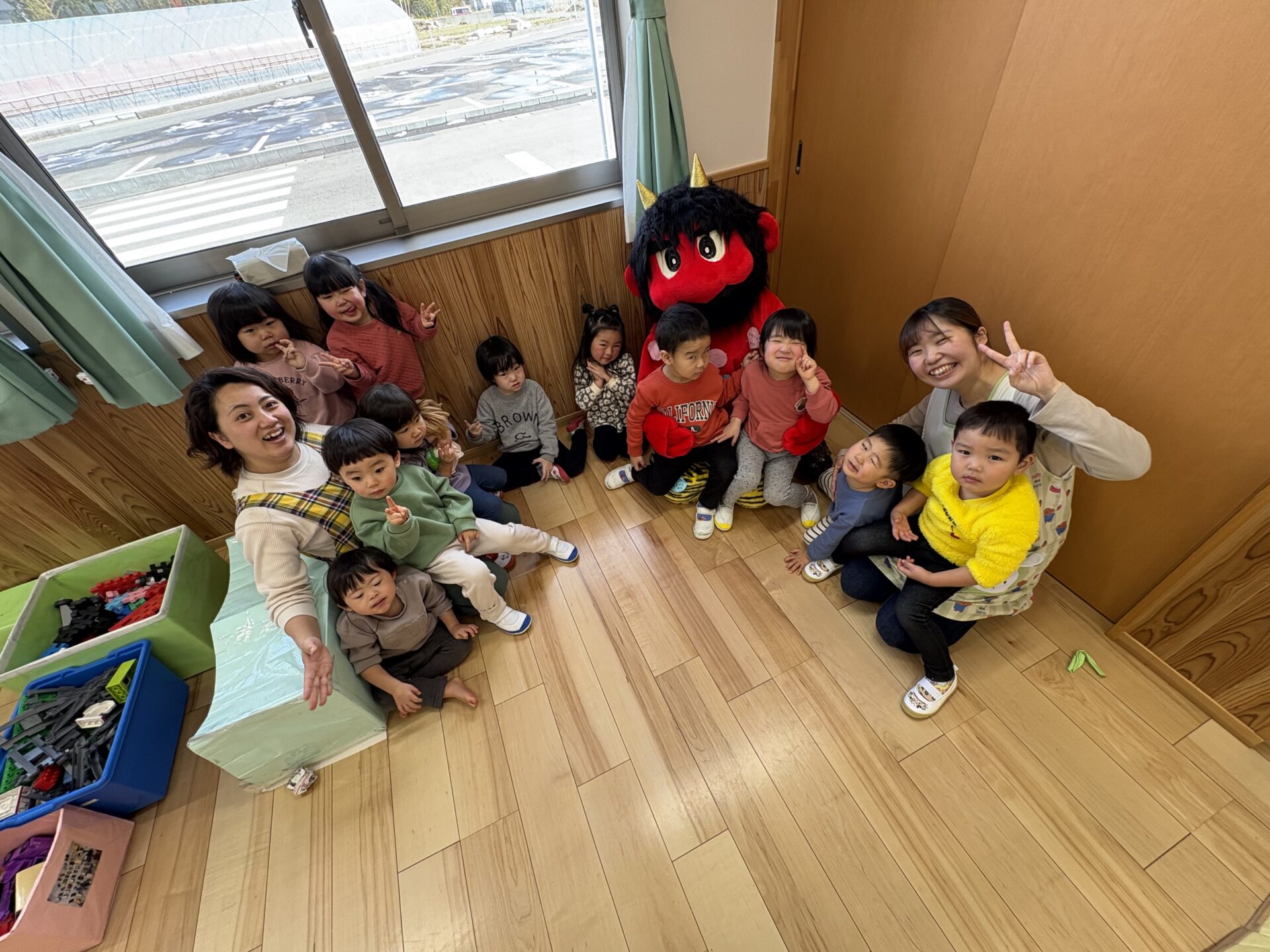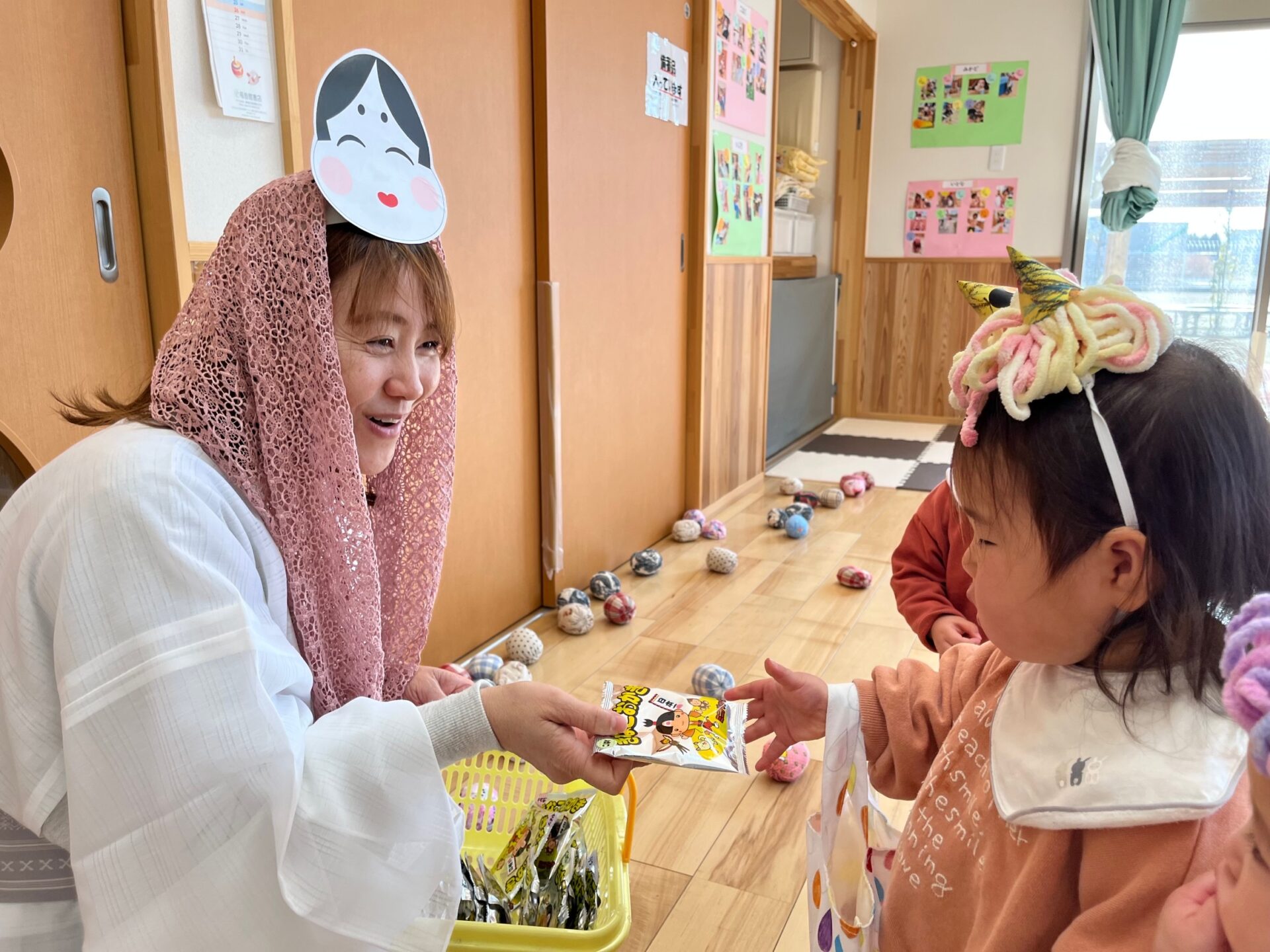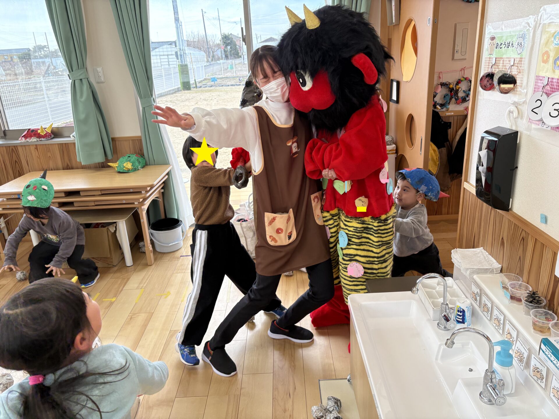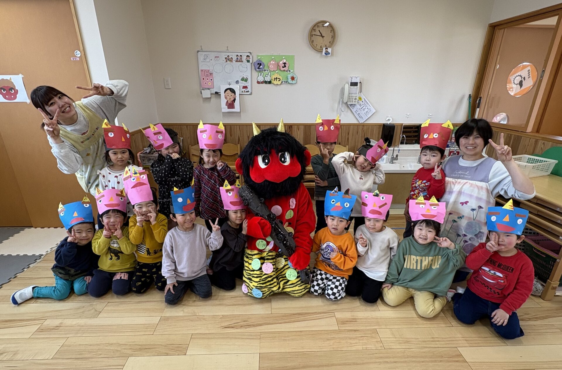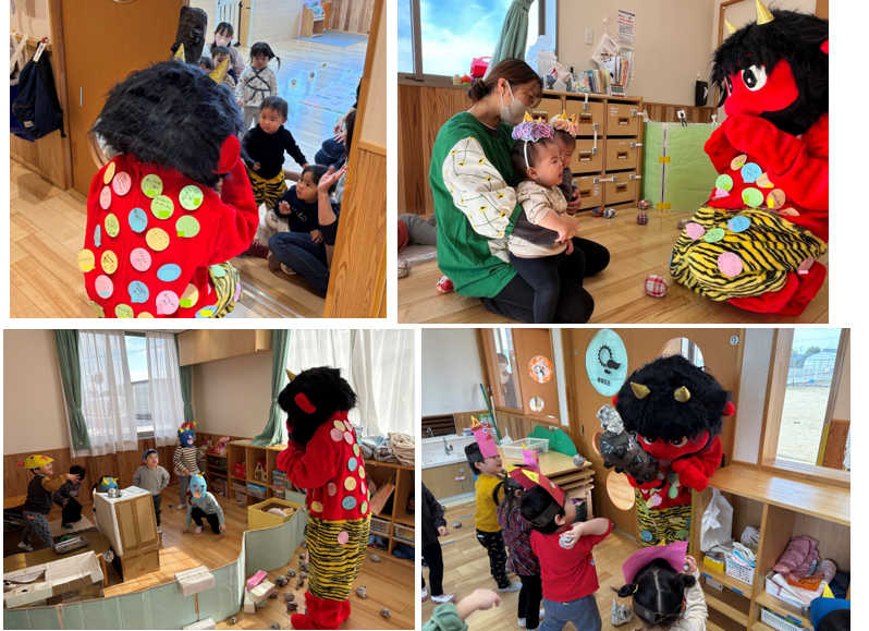 おにのお面を着けたり、“豆まきごっこ”を楽しんだりする子どもたちの声を聞きつけてか、えだまめこども園にお客様が・・・!!