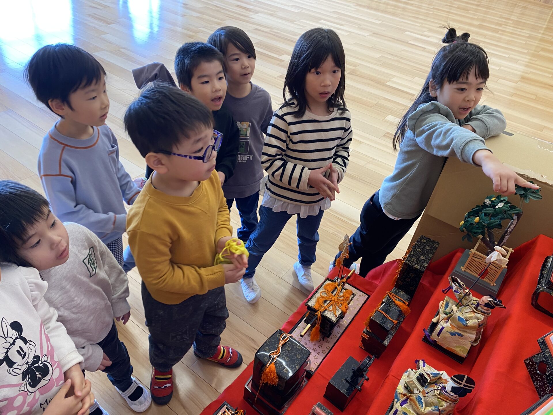 ひな人形を見ながら「ごにんばやし、笛と太鼓もってる!」「き~んの屏風にうつるひを~」と、歌詞に出てくる人を探して楽しんでいました。