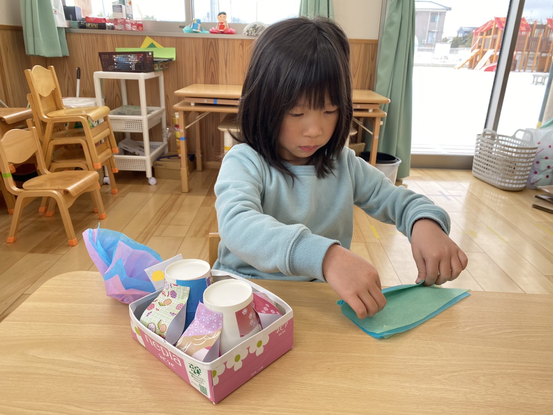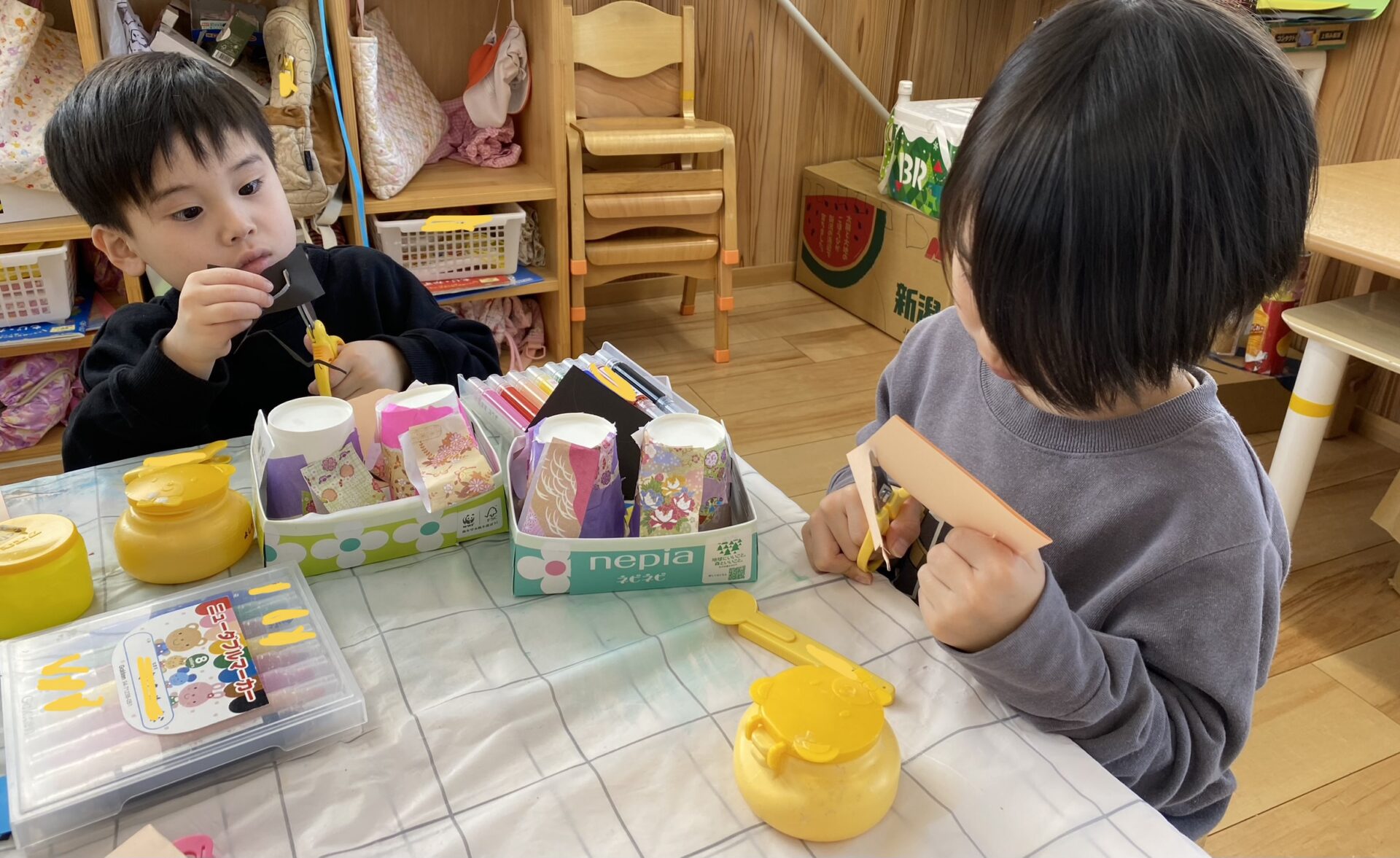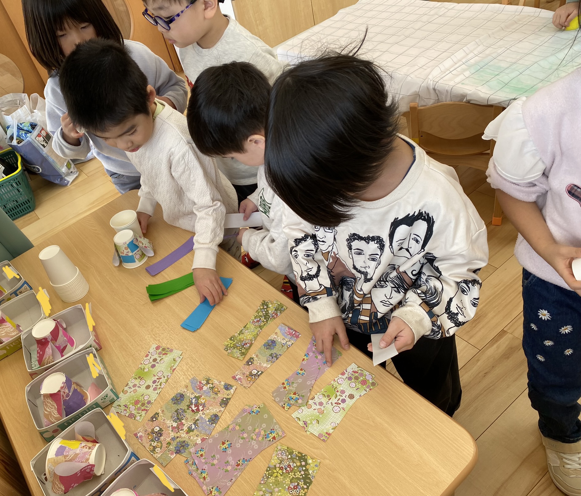 好きな柄の千代紙を選び、紙コップに貼ります。「どの色にしようかな~!」「本物の着物の模様みたい!」とわくわくしながら選んでいました。千代紙を貼った時に、着物の袖に見えるように工夫して貼りました。