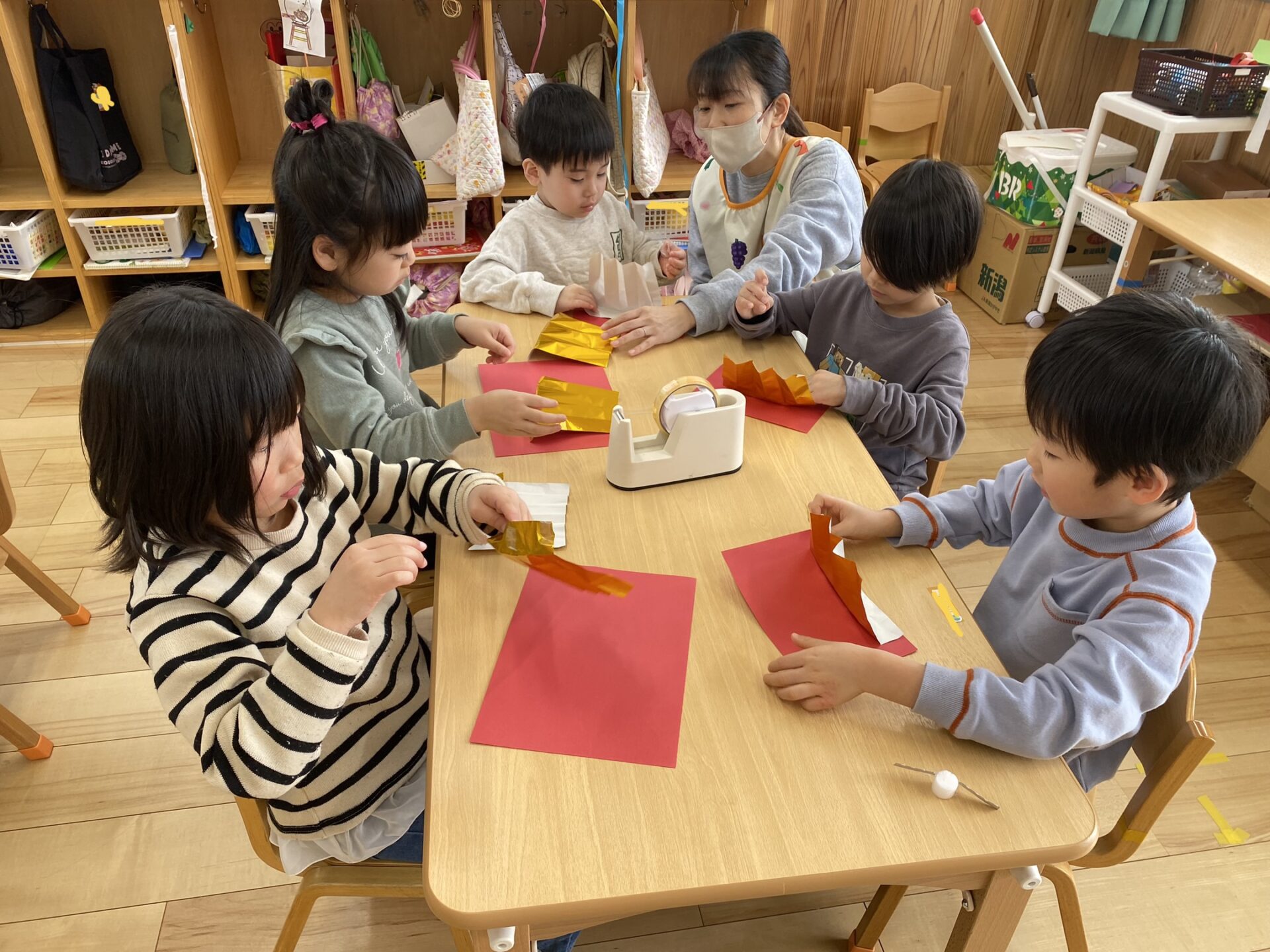 金の屏風は、蛇腹折りをしました。折り方は、何度も経験しているので「もうできたよ!」と、あっという間に完成!屏風をどうやって台座に立てようか、みんなで相談しながら貼りました🤔