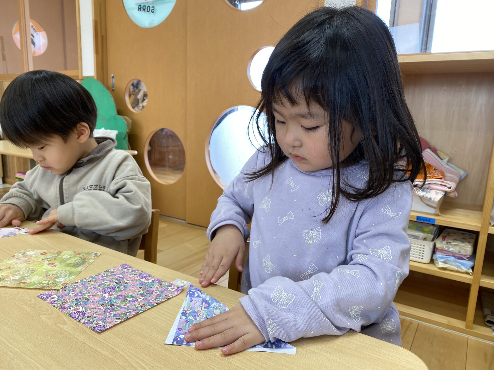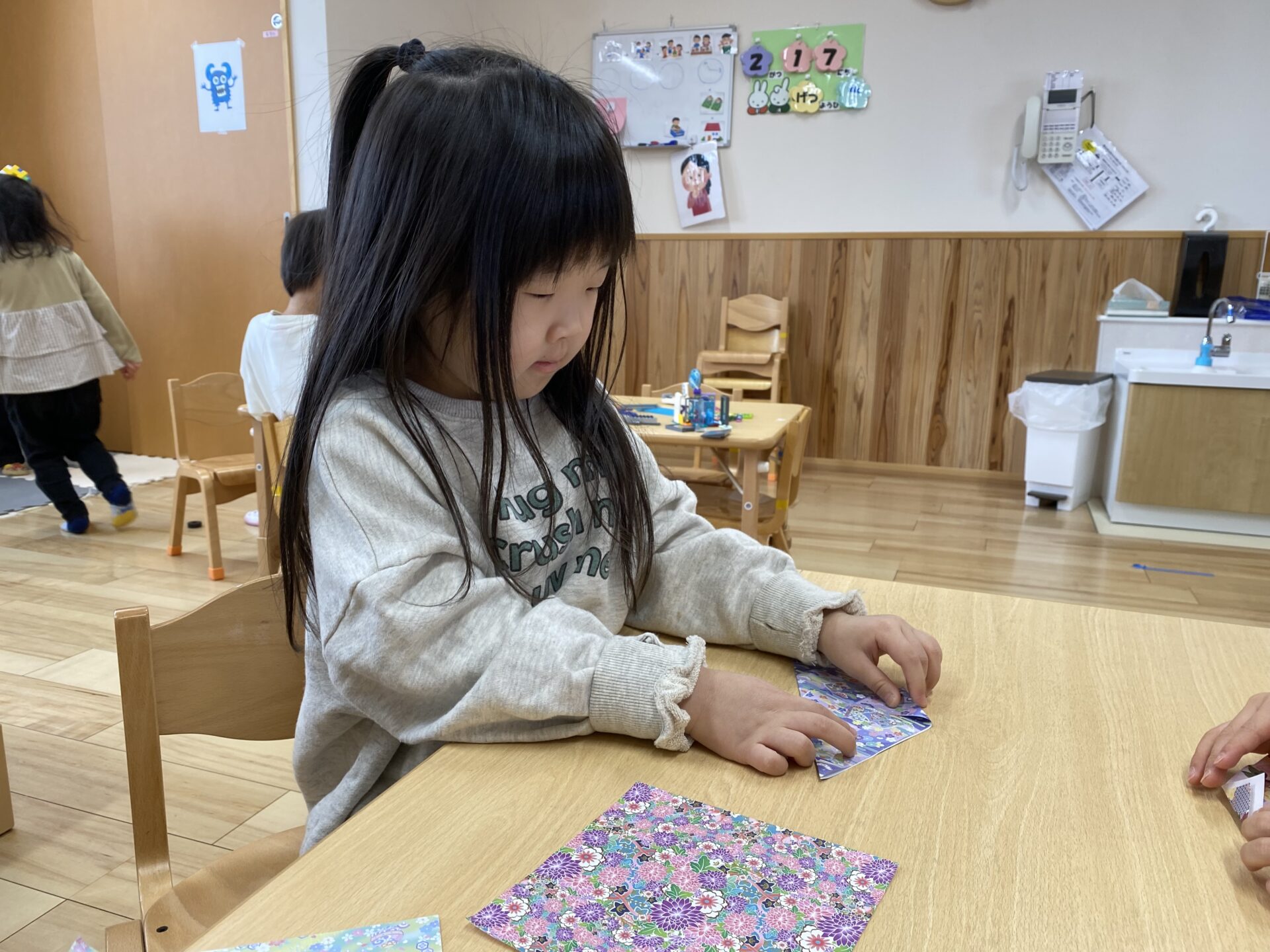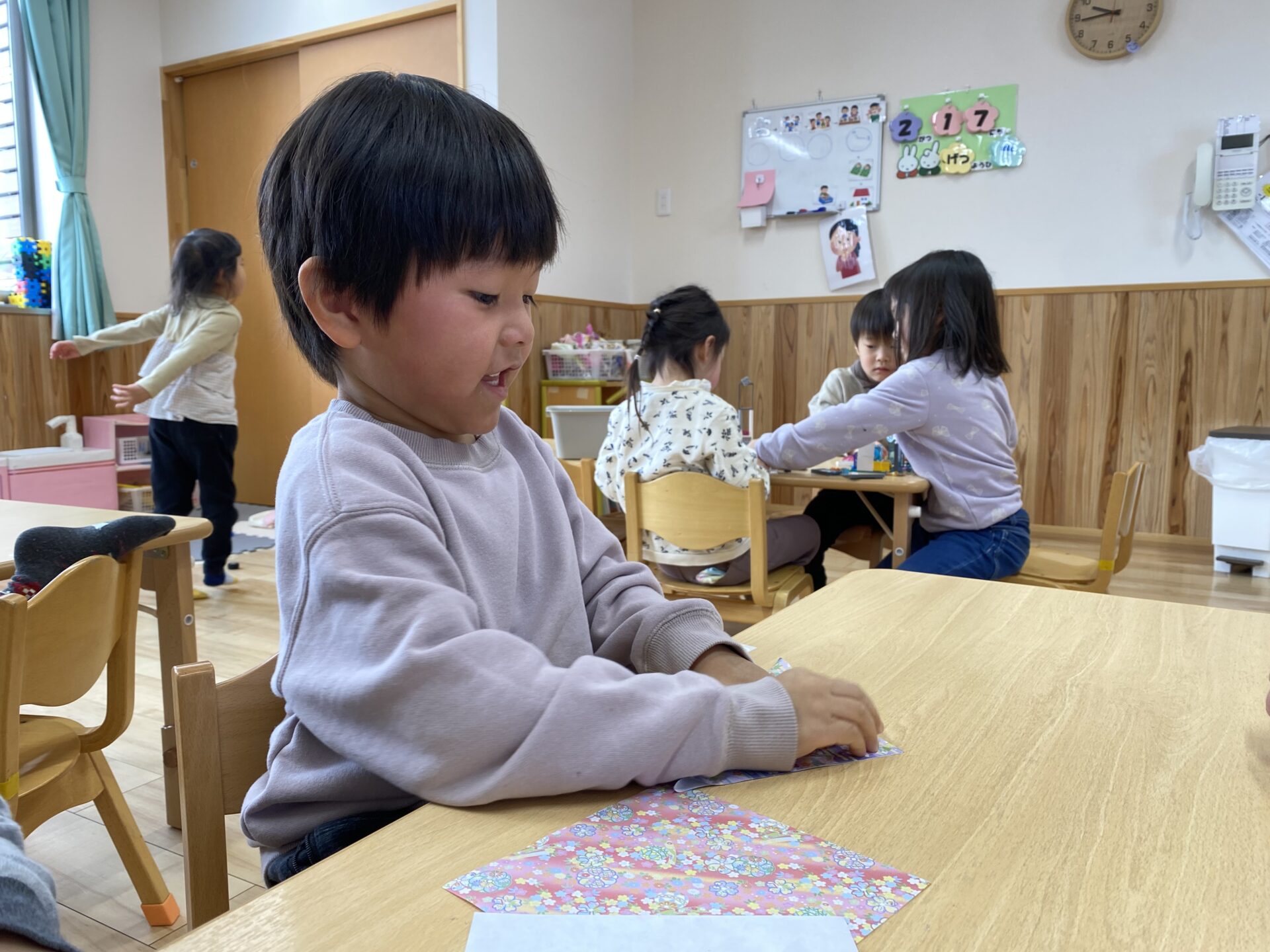 千代紙で着物を、金色の折り紙で金の屏風を折りました。お手本を見ながら、丁寧に折っていました✨金の屏風は、じゃばら折りで作ります。何度かしたことがあり、「じゃばら折り知ってるよ!」「順番に折るんだよね。」と、お手本を見ずに折ることができる子もいて、驚きました😲