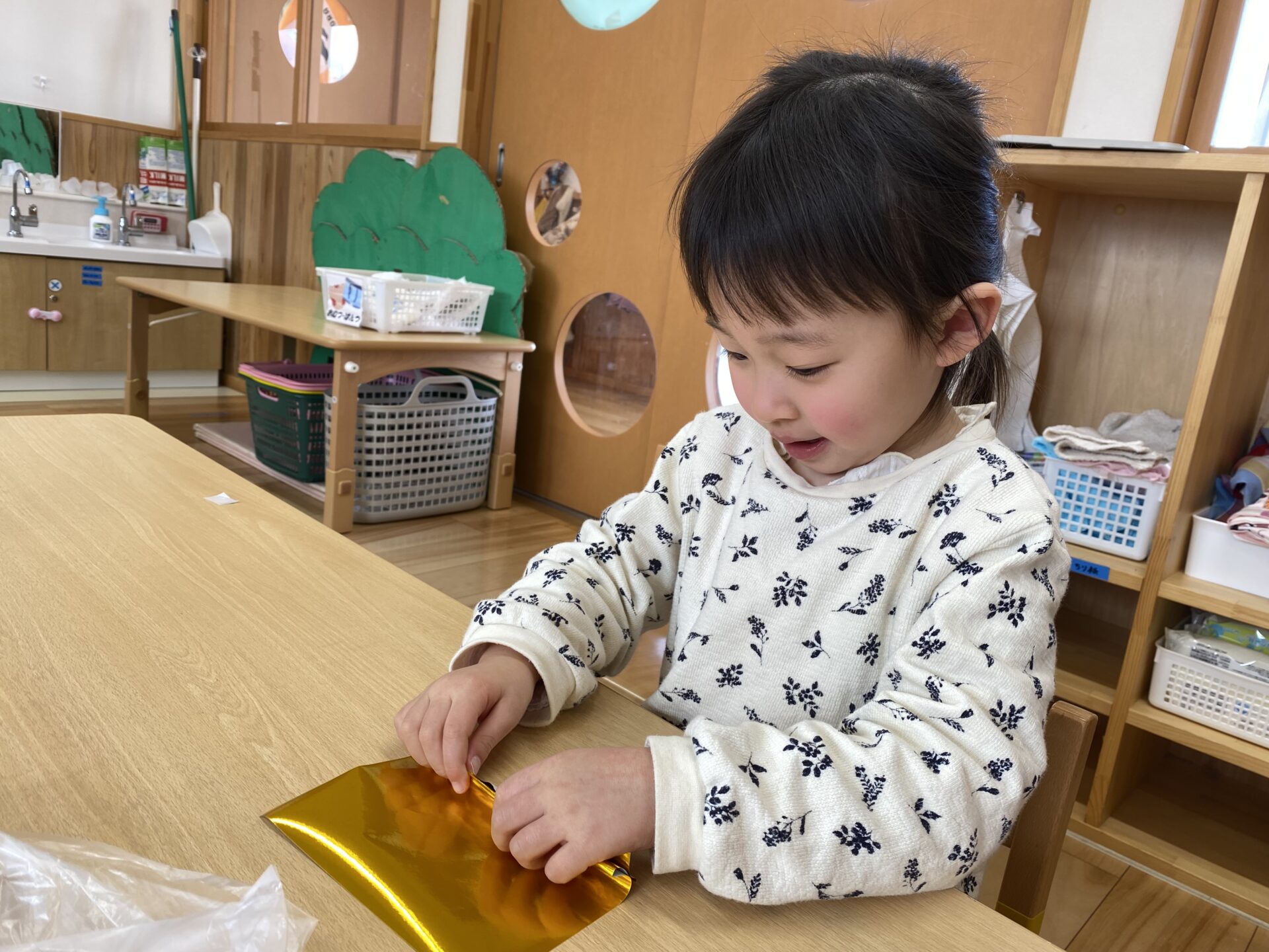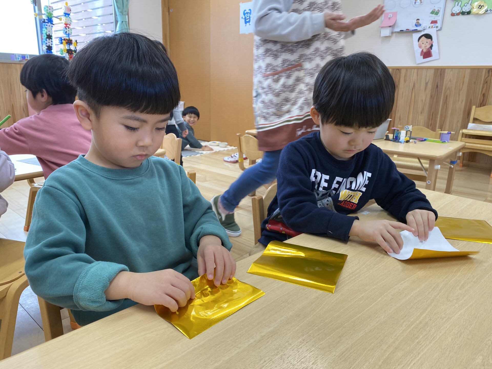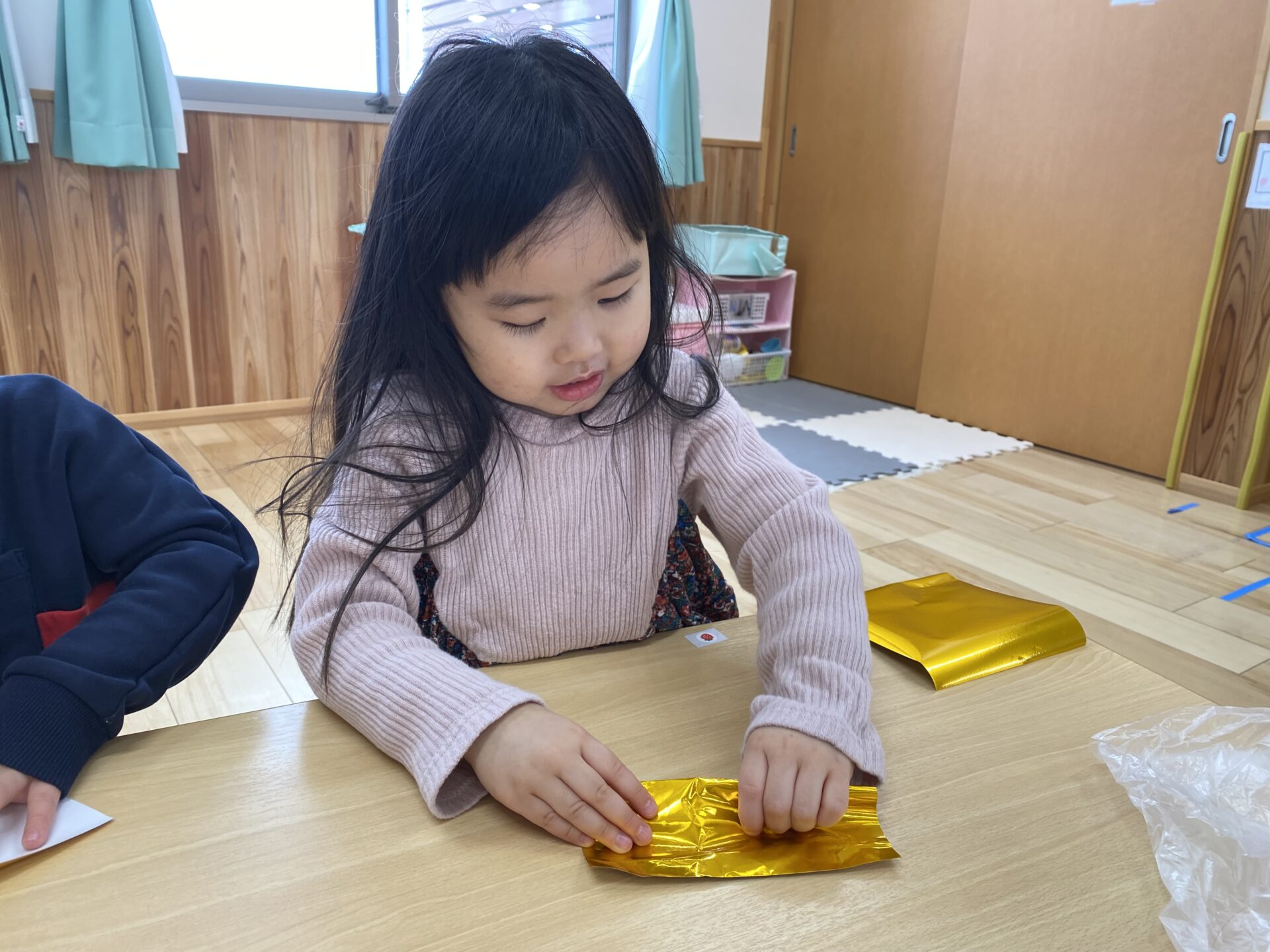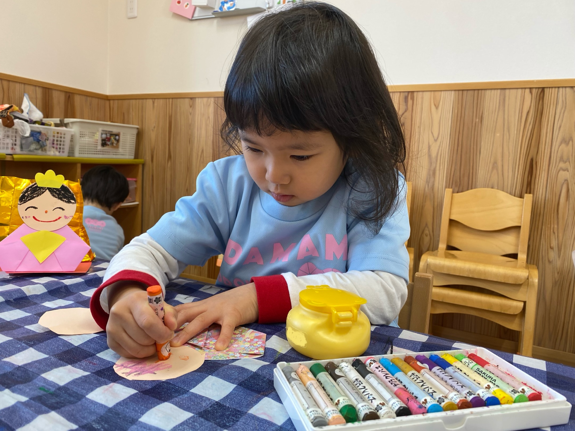 千代紙で着物を、金色の折り紙で金の屏風を折りました。お手本を見ながら、丁寧に折っていました✨金の屏風は、じゃばら折りで作ります。何度かしたことがあり、「じゃばら折り知ってるよ!」「順番に折るんだよね。」と、お手本を見ずに折ることができる子もいて、驚きました😲