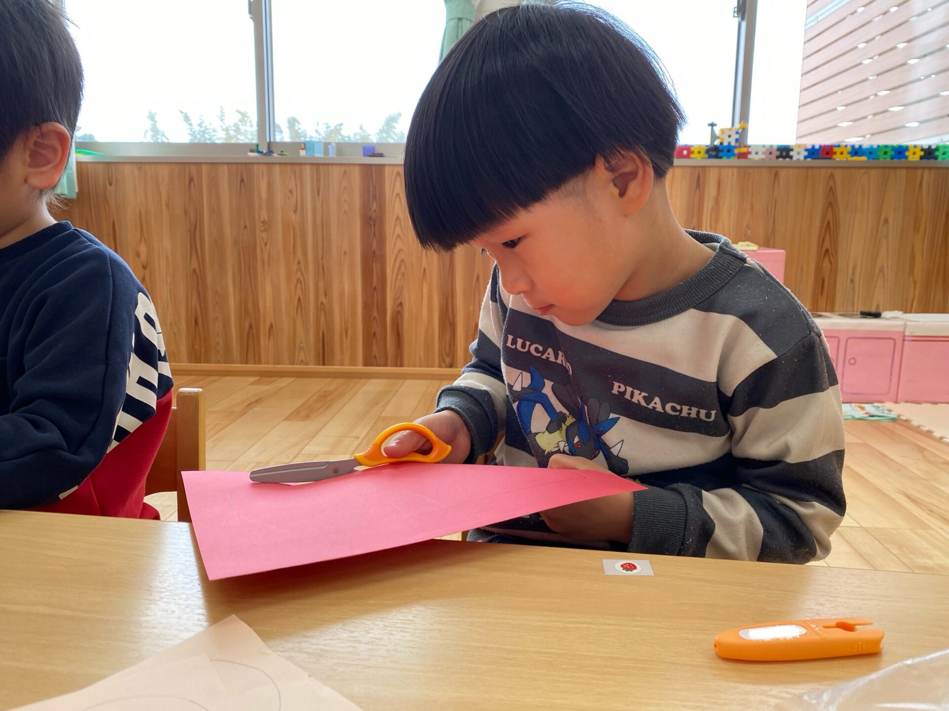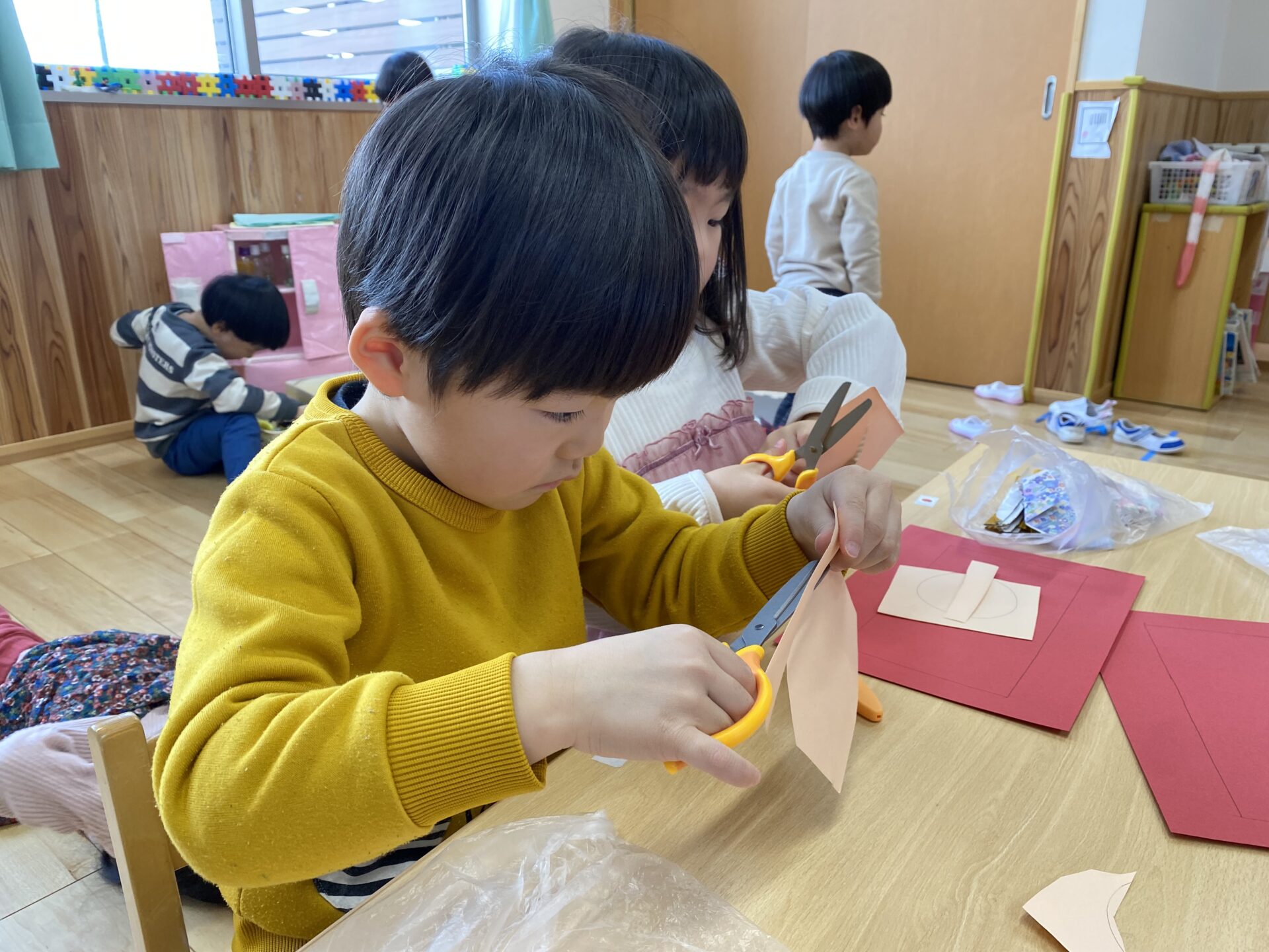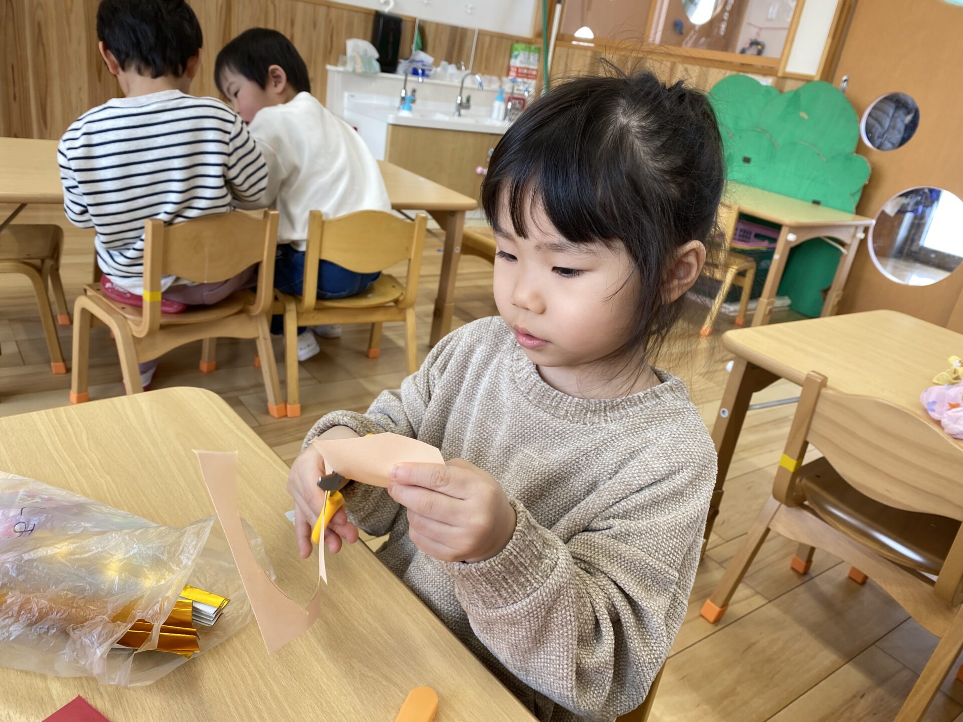 春の頃は、ハサミの持ち方に苦戦する子も多かったのですが、すっかり指先が器用になり、連続切りができるようになりました!
