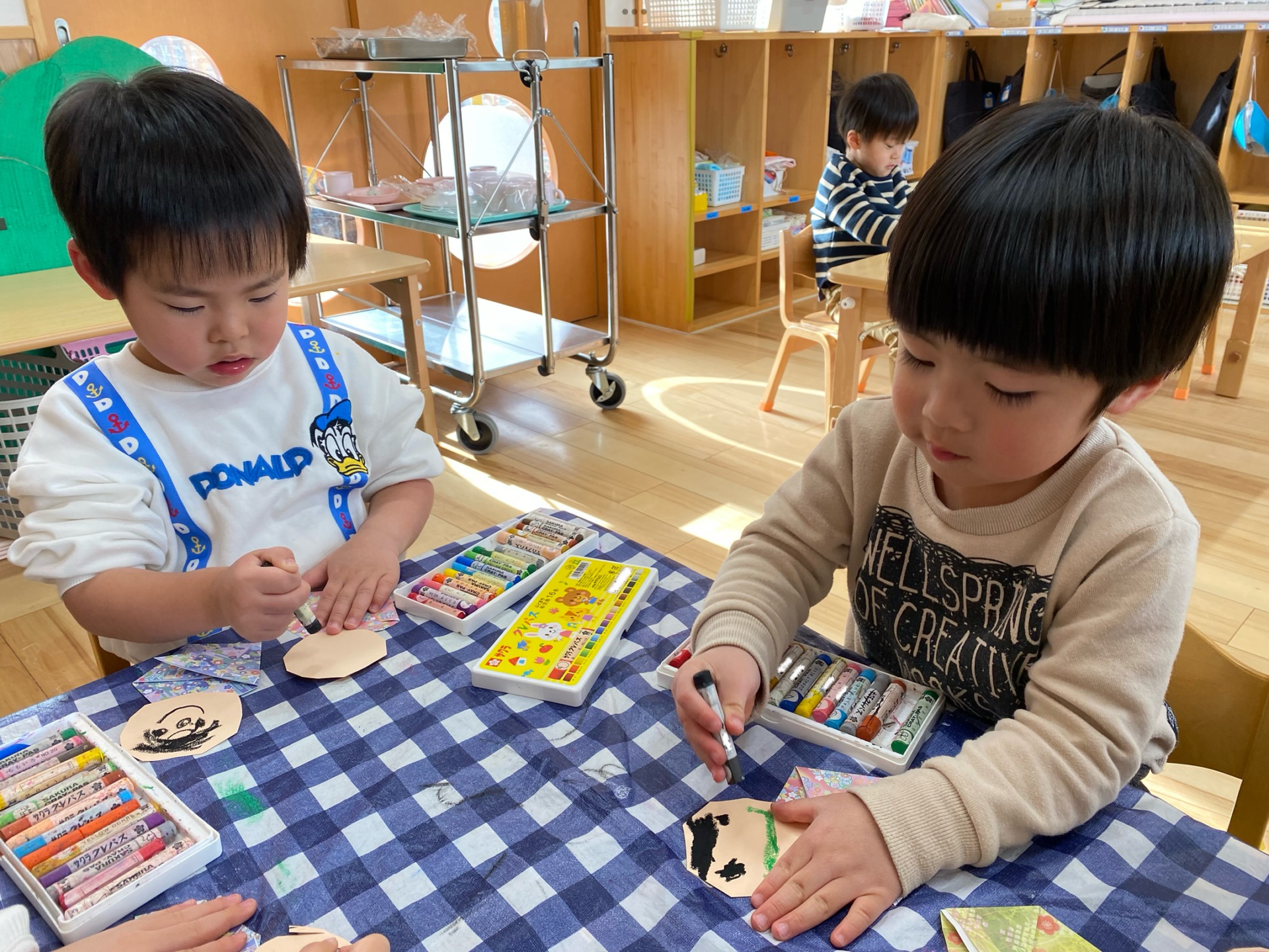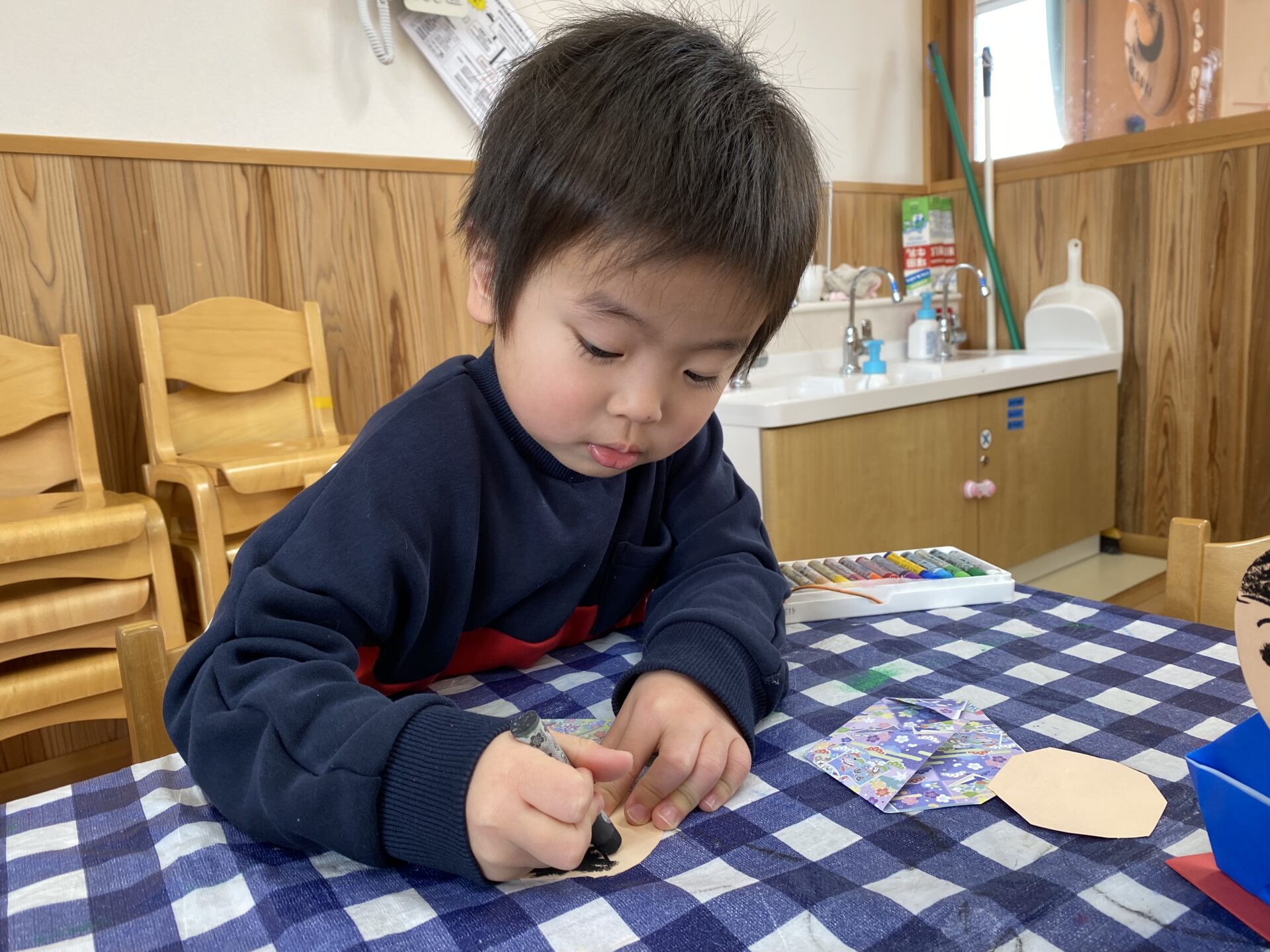 クレヨンや色鉛筆で自由に塗ったり、保育者と一緒に折り紙を折ったり、空き箱などの廃材を使って、自分のイメージしたものを形にしたりして楽しんでいます🎵