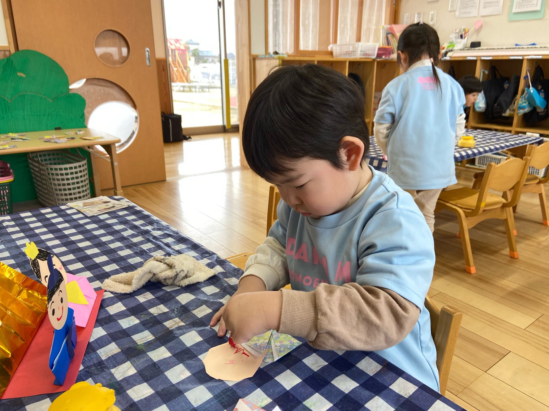 そんな姿を見て、今回はハサミや折り紙を使った、ひなまつりの制作をしました。