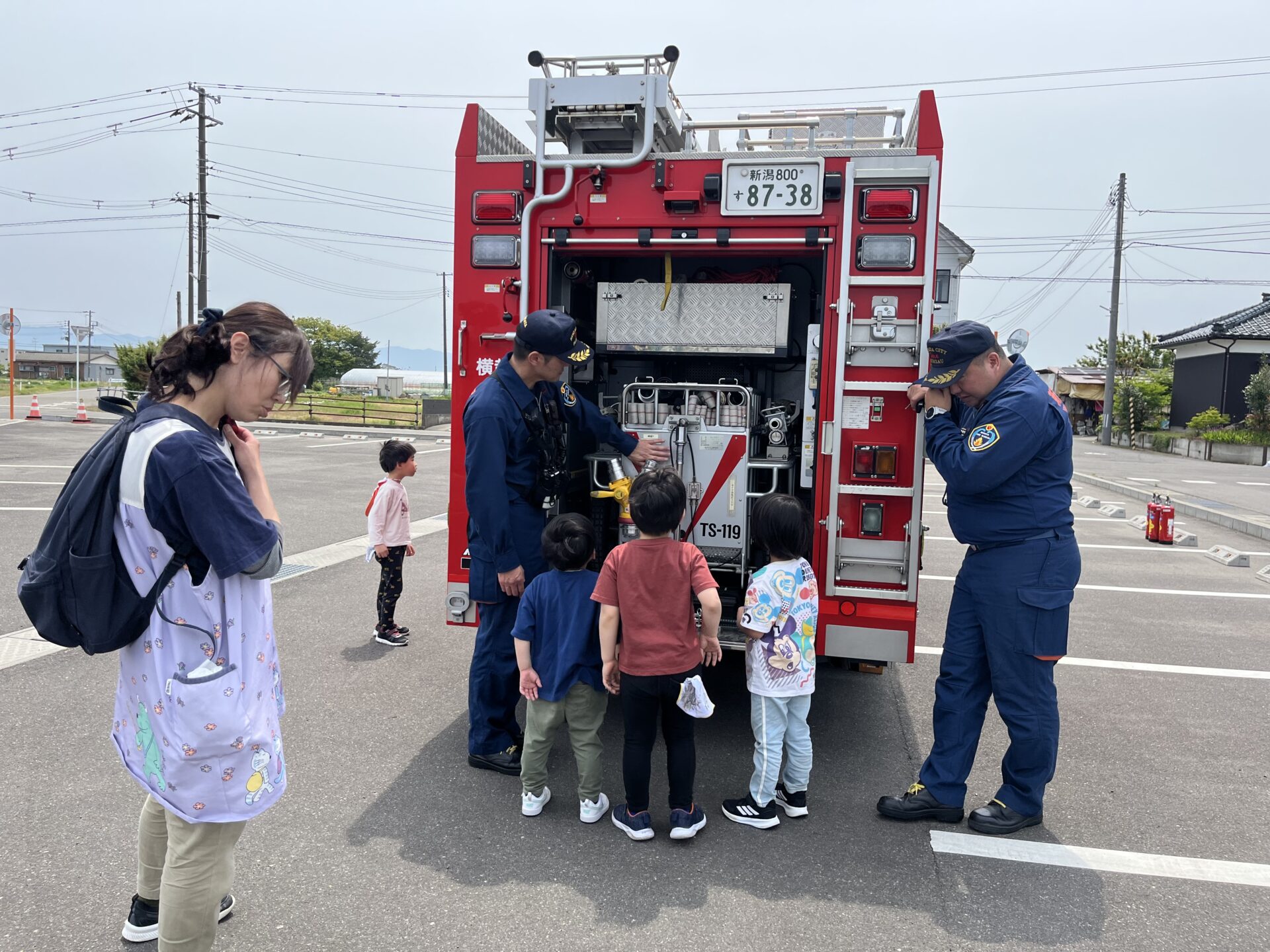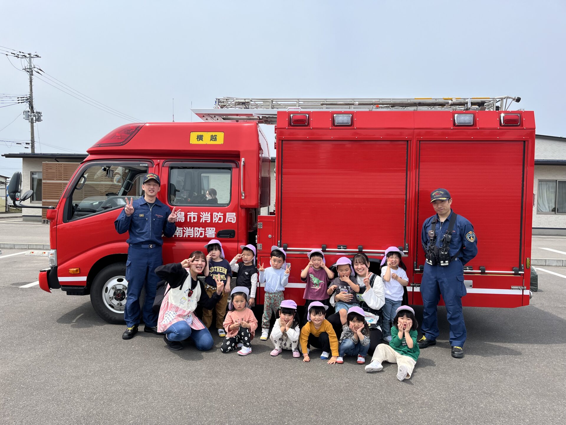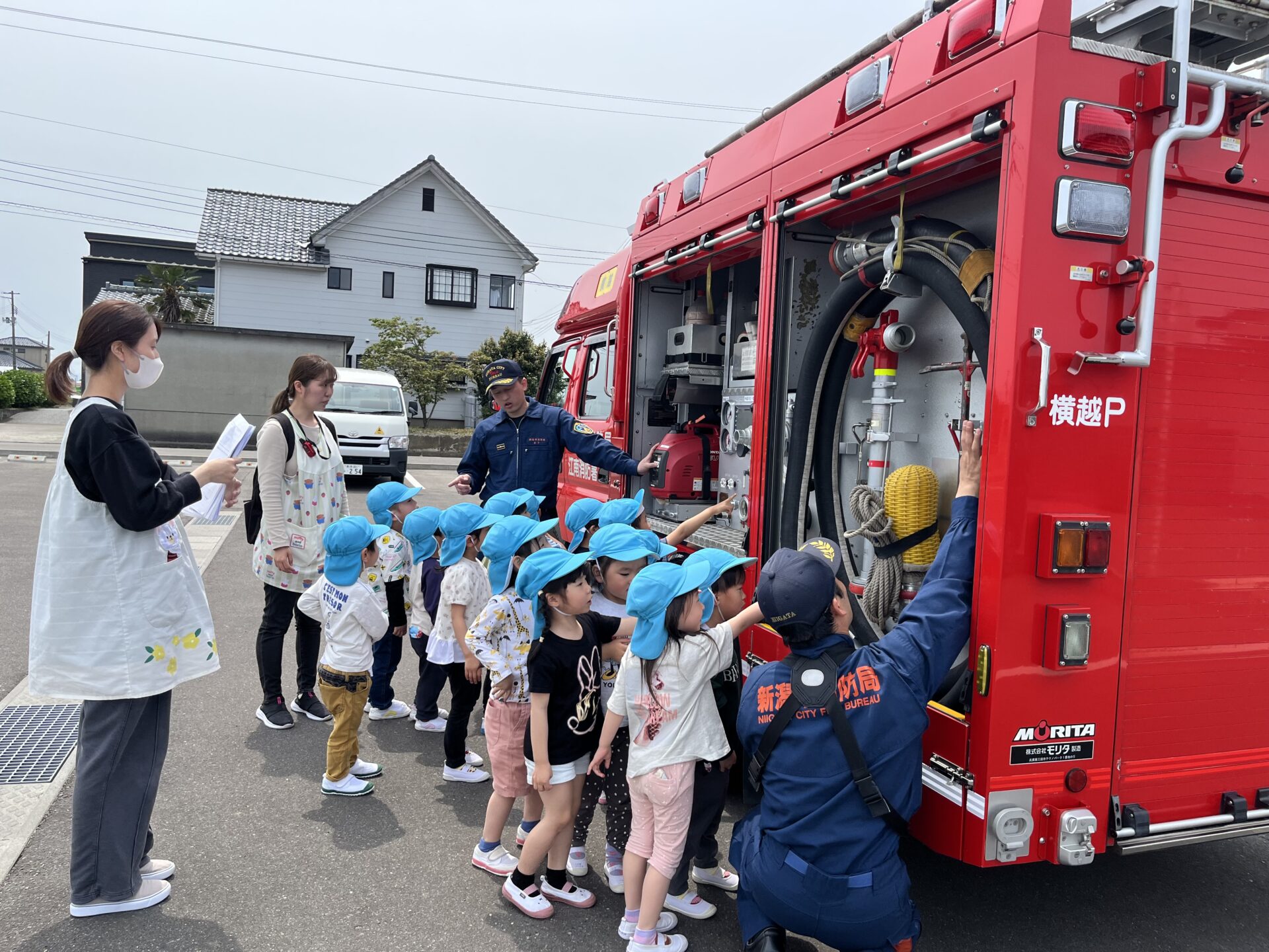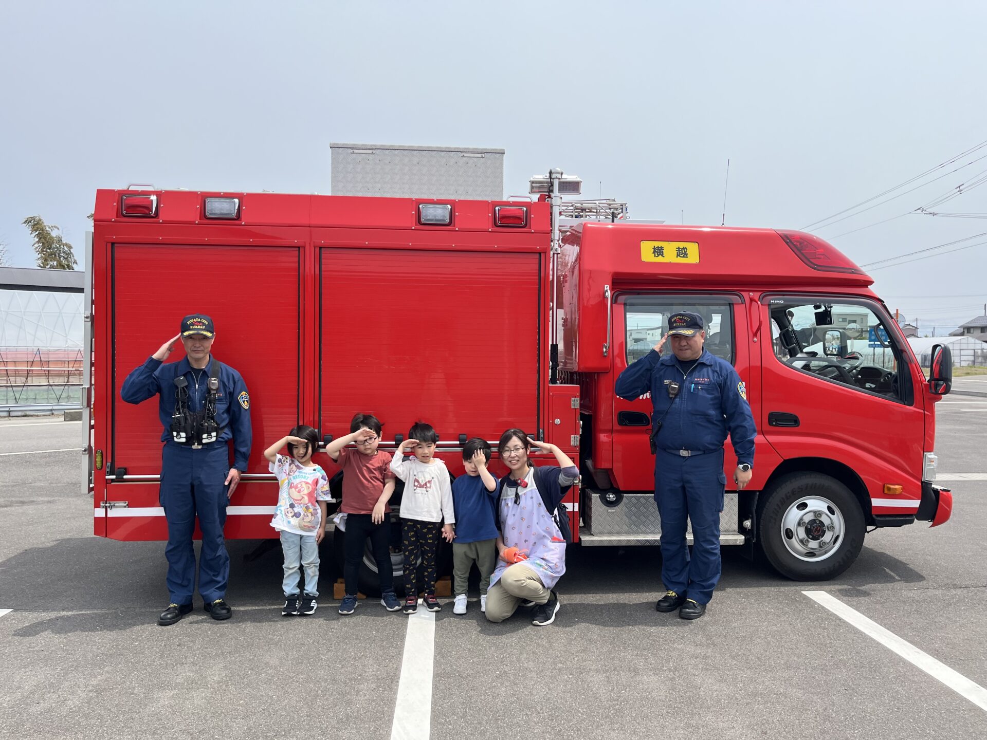 お待ちかねの消防車見学では、子どもたちの目が釘付けになり、「これは、なあに?」「どうやって使うの?」と、質問の嵐でした!