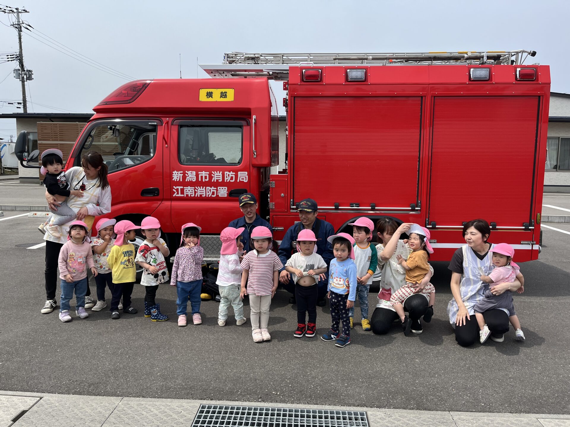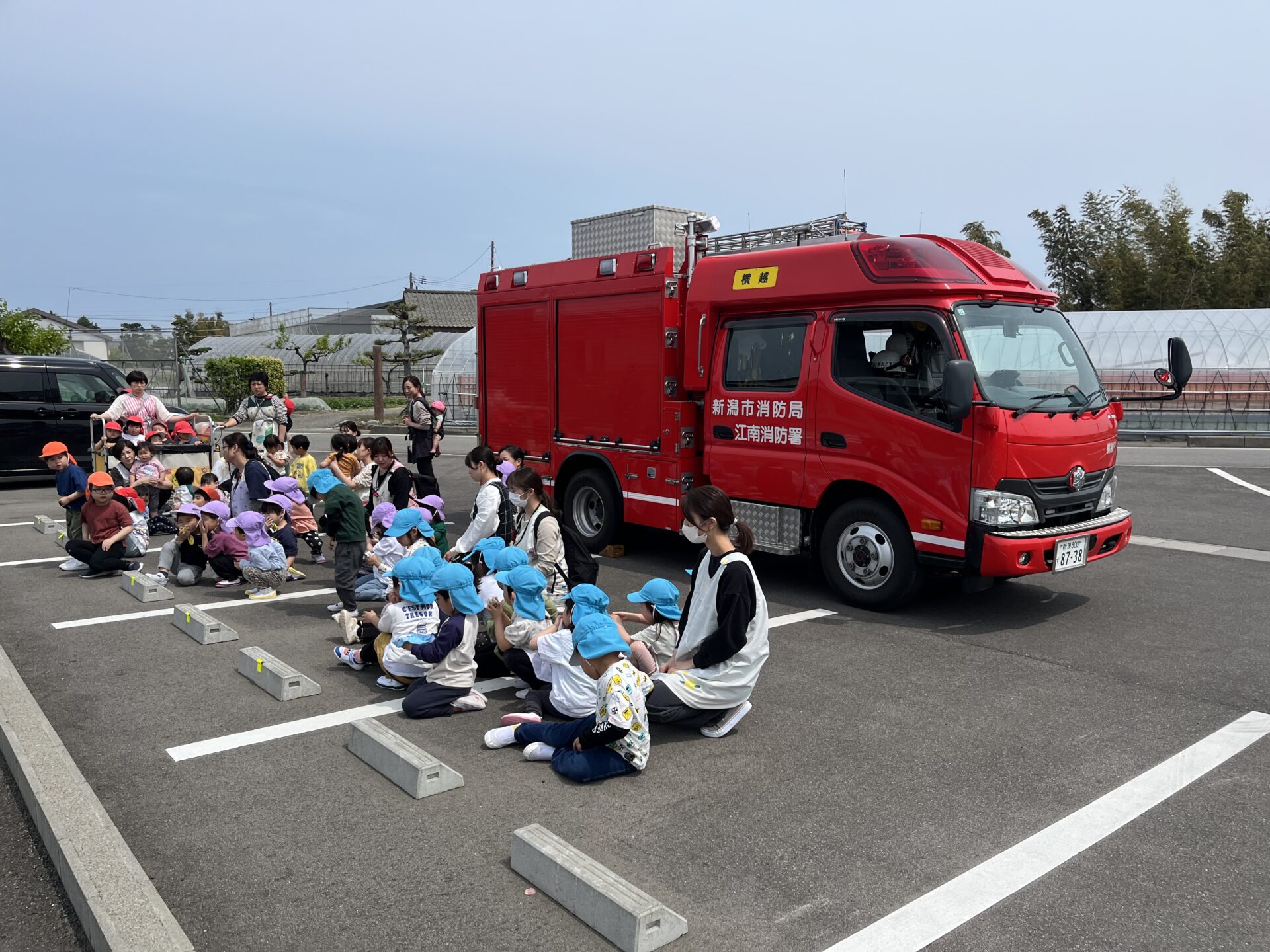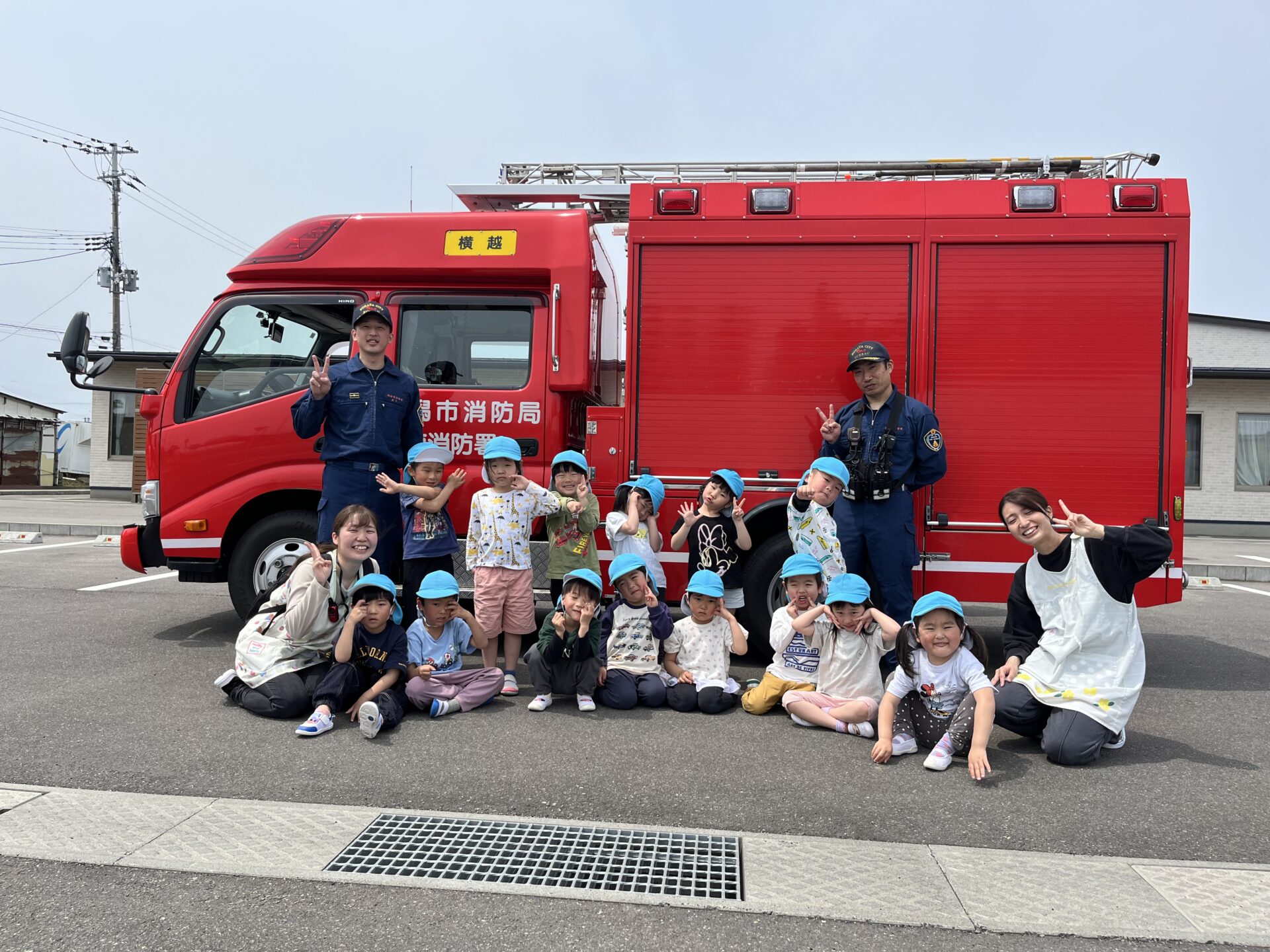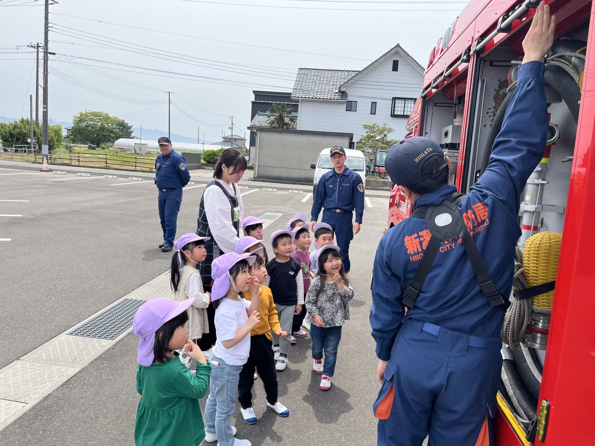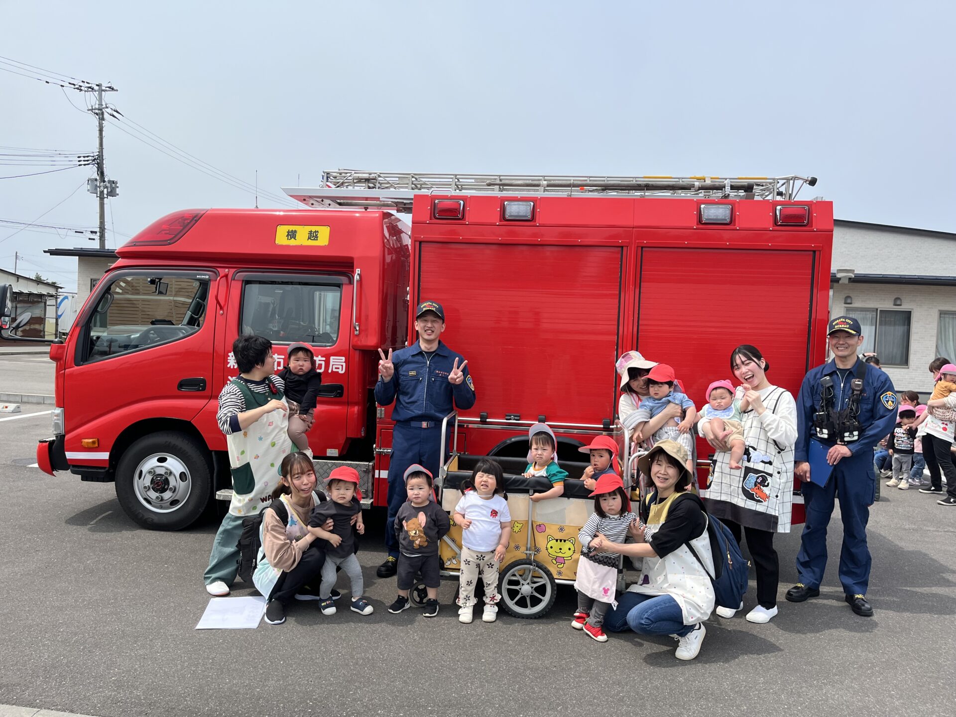 お待ちかねの消防車見学では、子どもたちの目が釘付けになり、「これは、なあに?」「どうやって使うの?」と、質問の嵐でした!