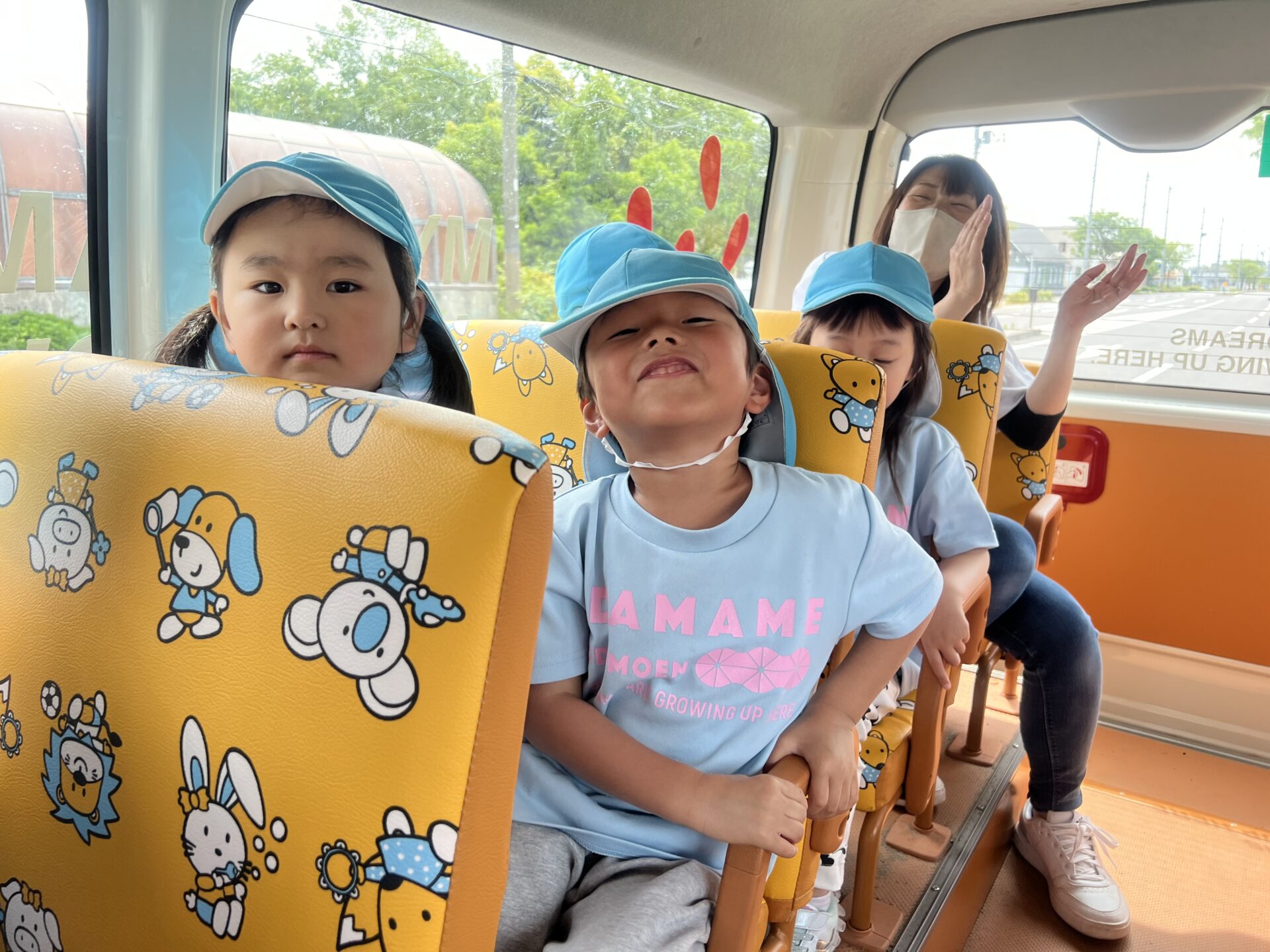 つき組(5歳児)そら組(4歳児)は、『オマチマンコンサート』を観に行くため園バスに乗りこみ、姉妹園のおむすびこども園へ向け出発しました。