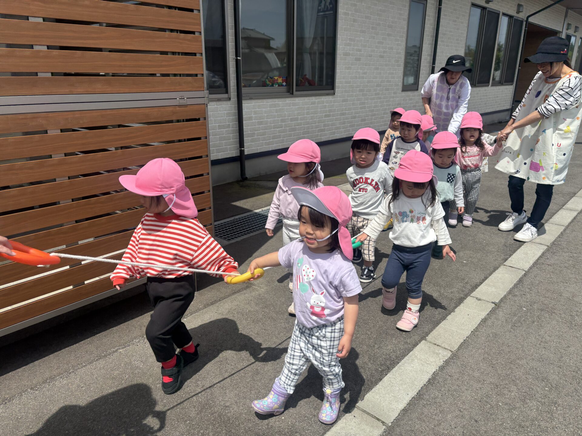 お散歩ロープを握りしめ、「いっちに!いっちに!」と、みんなで掛け声をかけながら歩きます☆