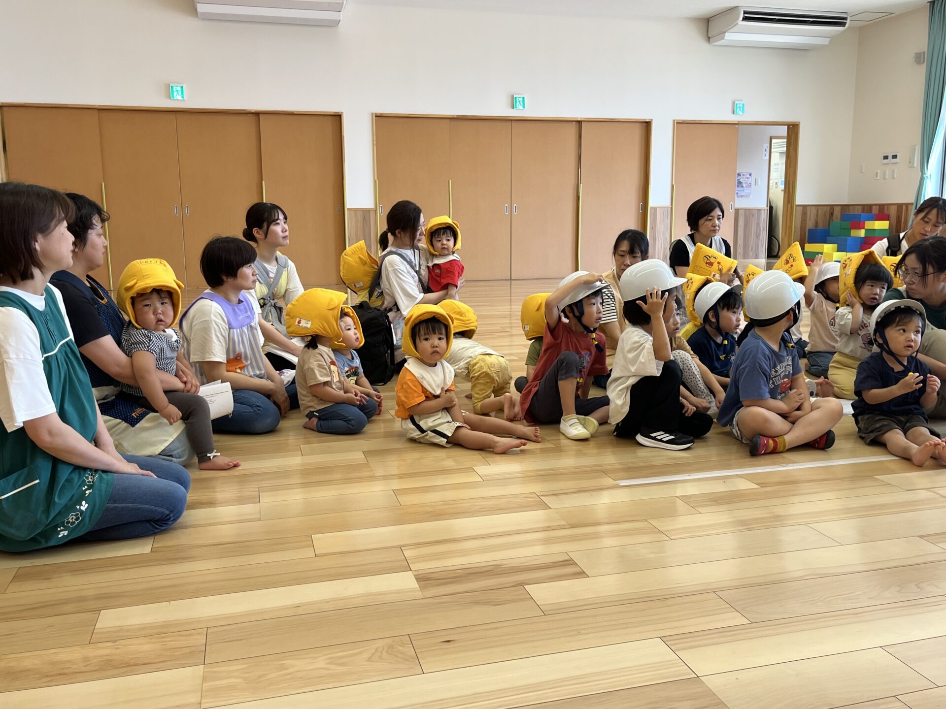その際、防災用品として各保育室に常備してある防災頭巾やヘルメットも、着用してみました。