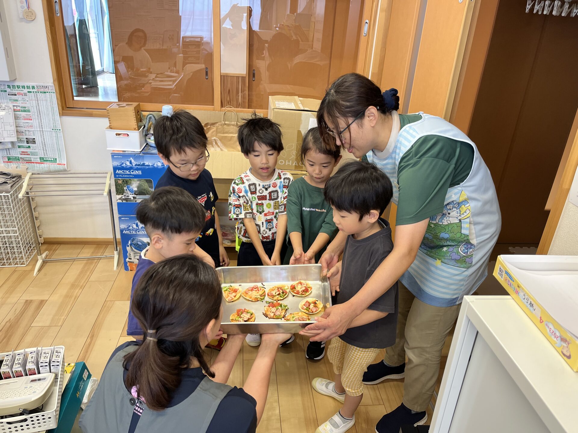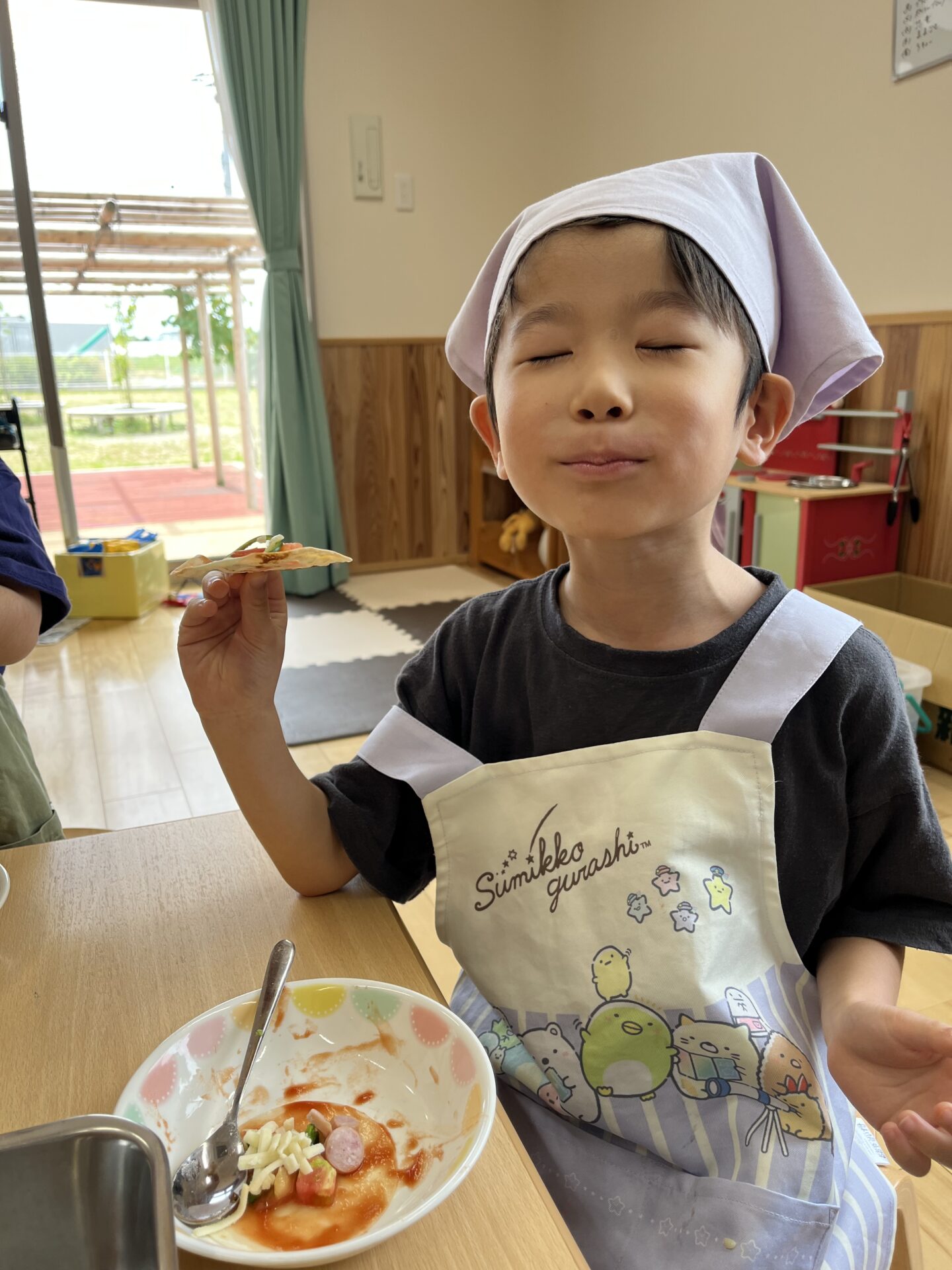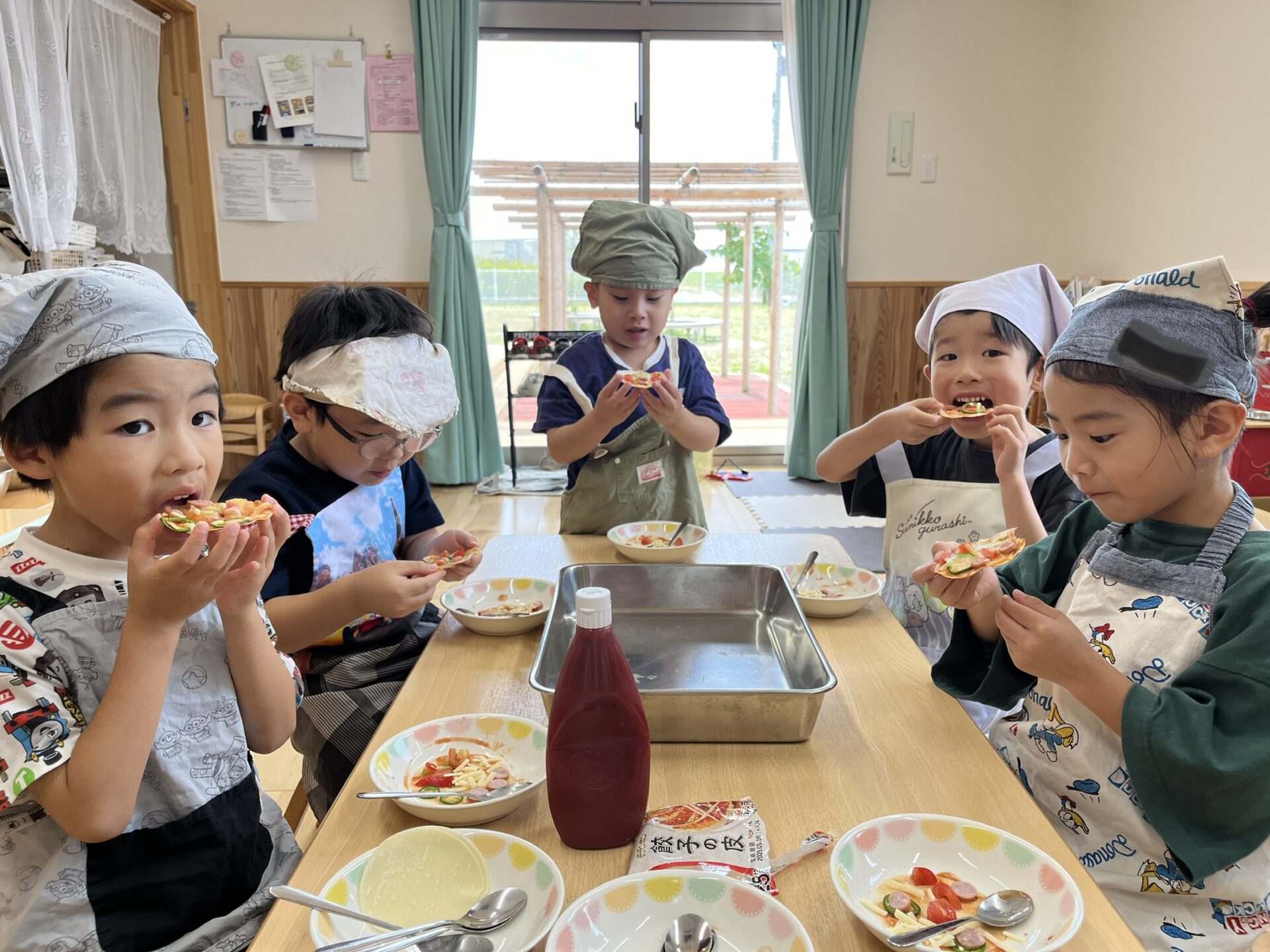 夏野菜を植えるときに、みんなで『野菜ができたら何を作って食べようか?』と考えた中に、ピザがありました。今回は、おいしそうに実った採れたて野菜で、ピザ作りに挑戦です🍕