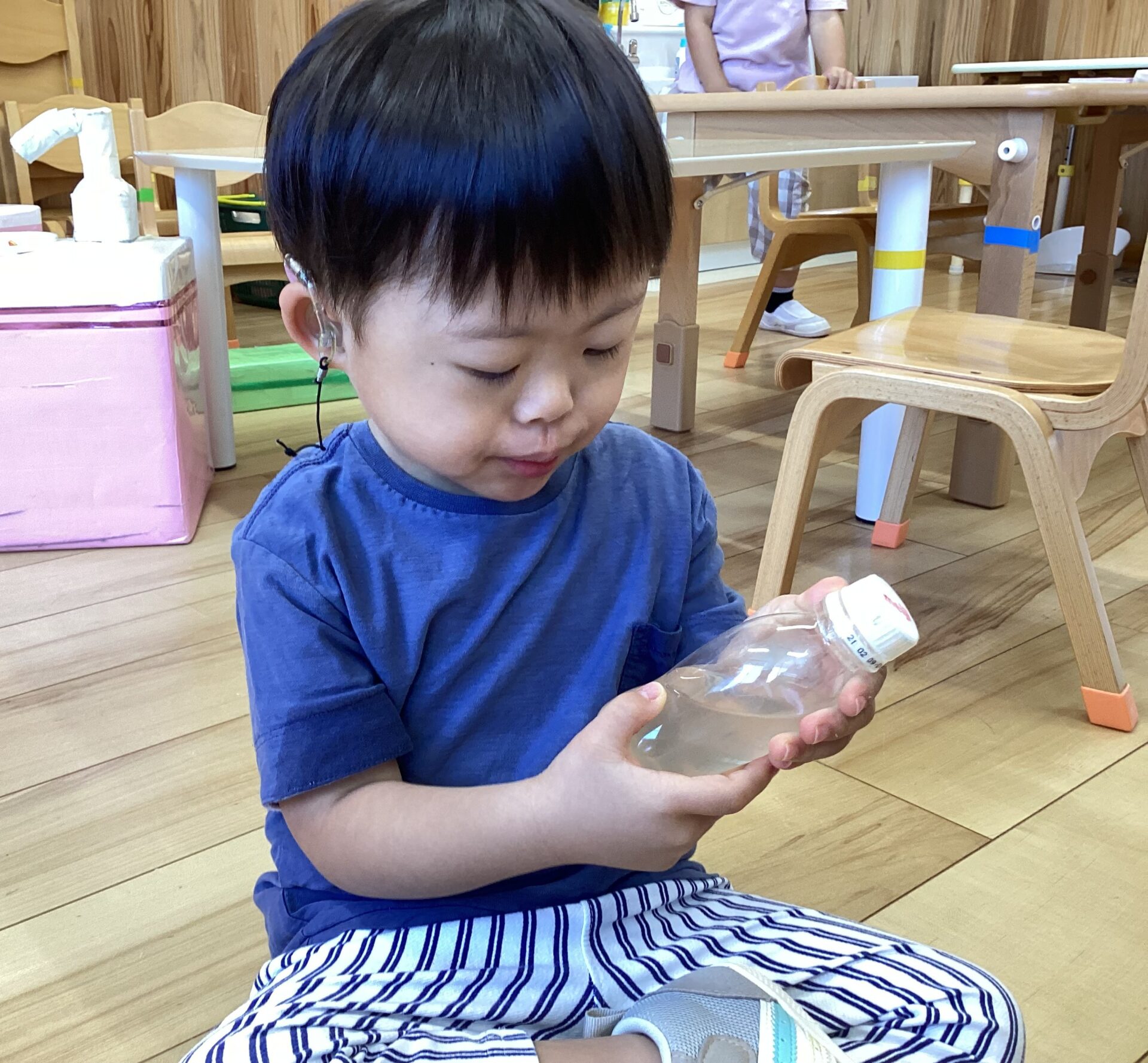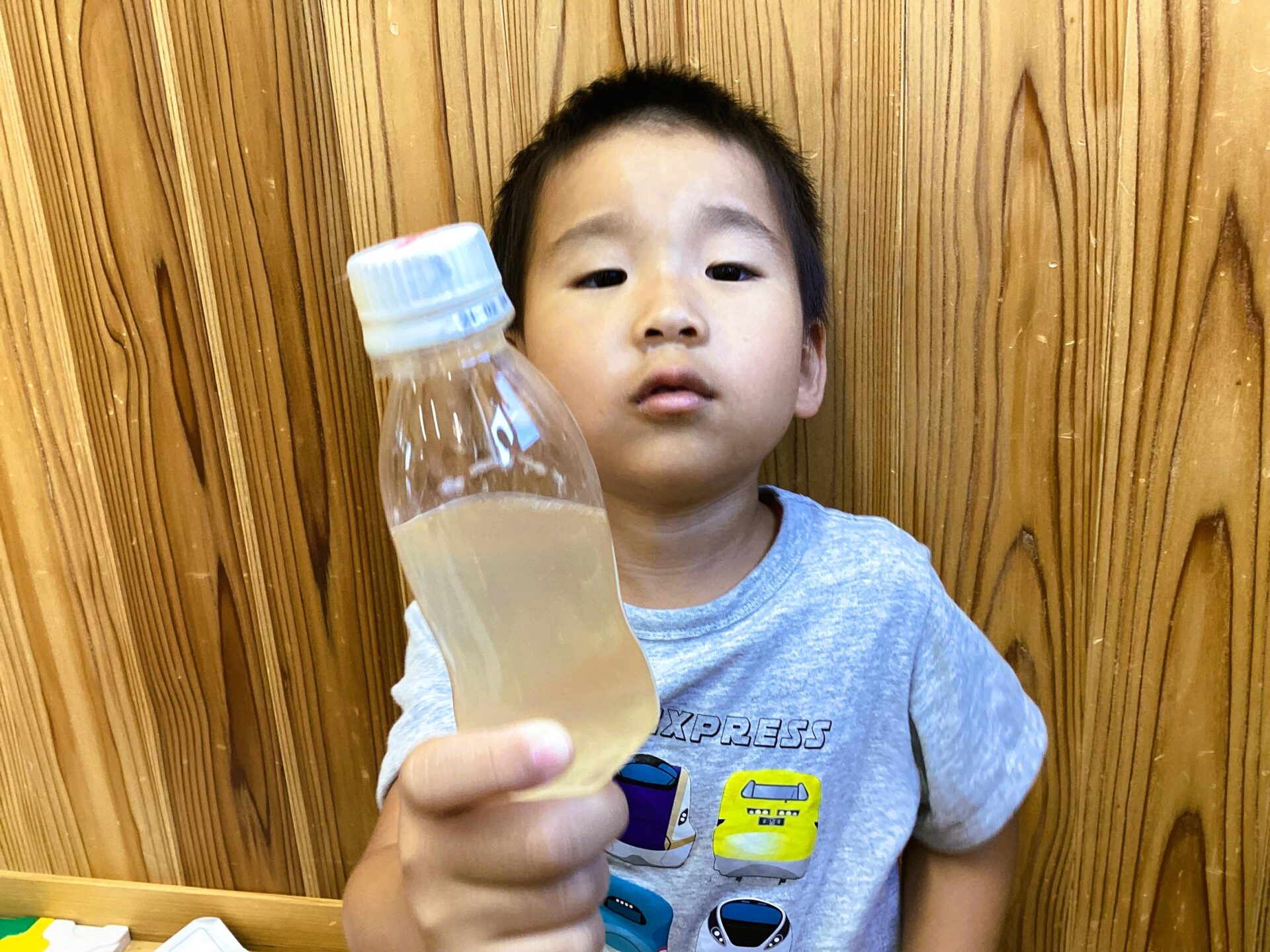 色水をボトルに移し替えて、あさがおジュースのできあがり🍹