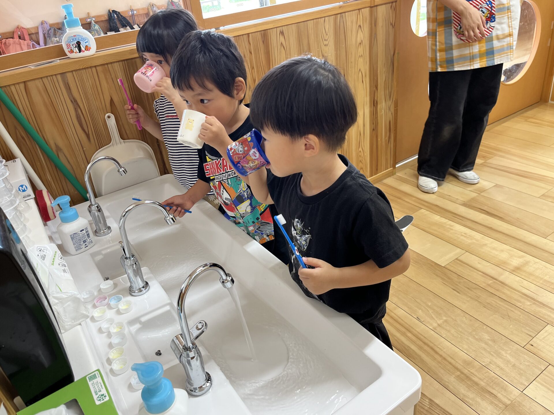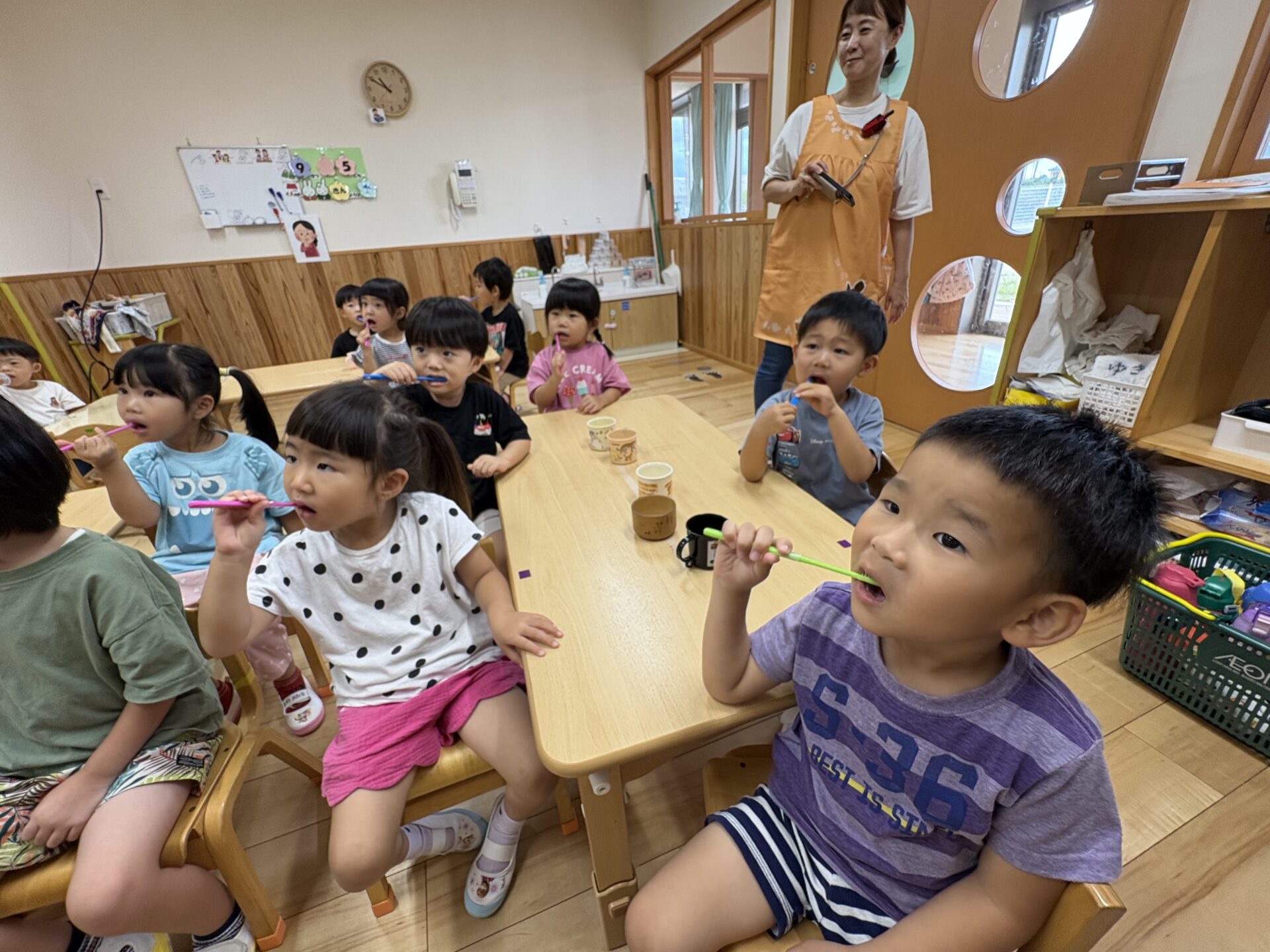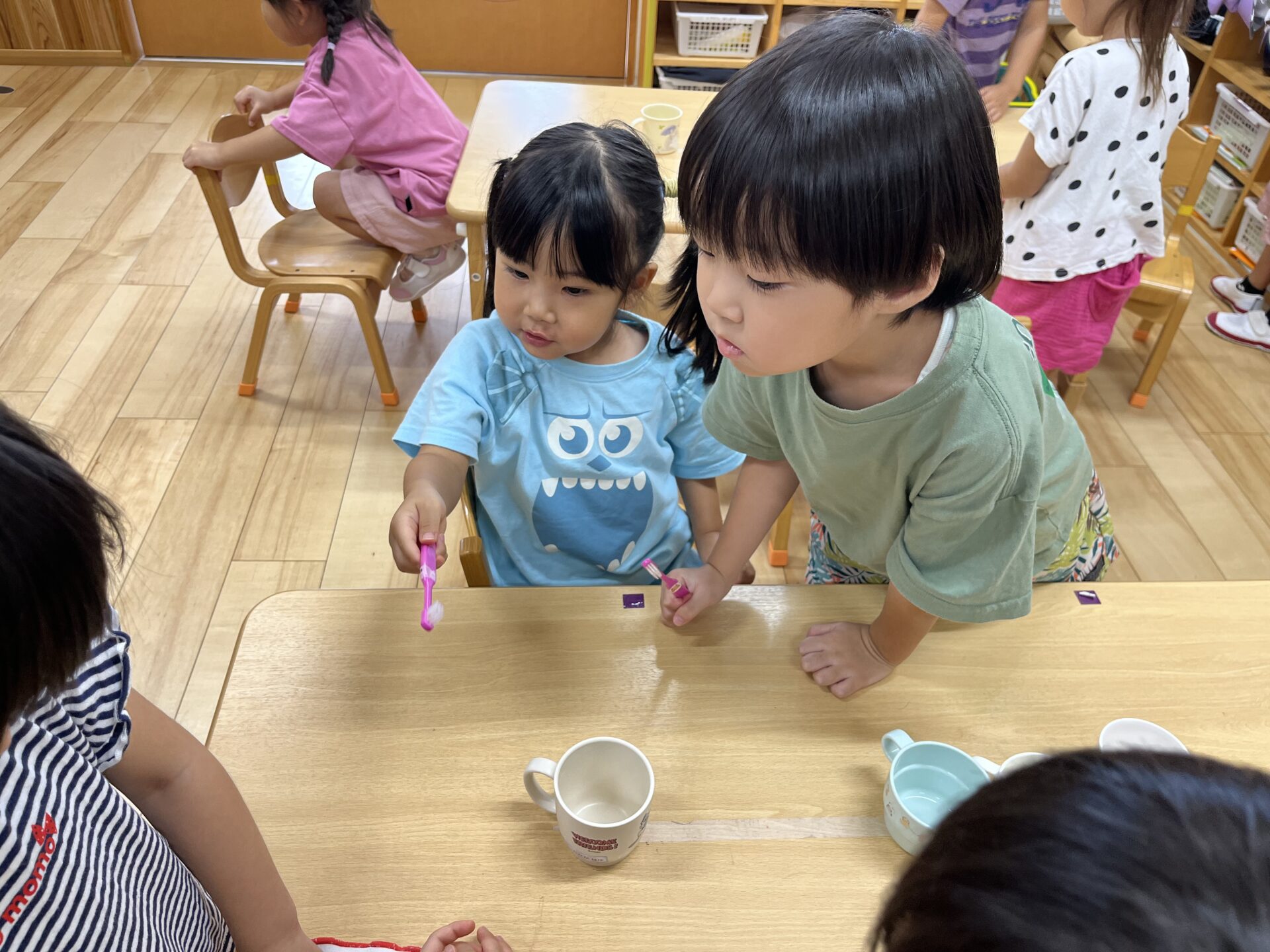 ひと回り大きくなったゆき組(3歳児)の子どもたちも、給食後の歯みがきを始めました。