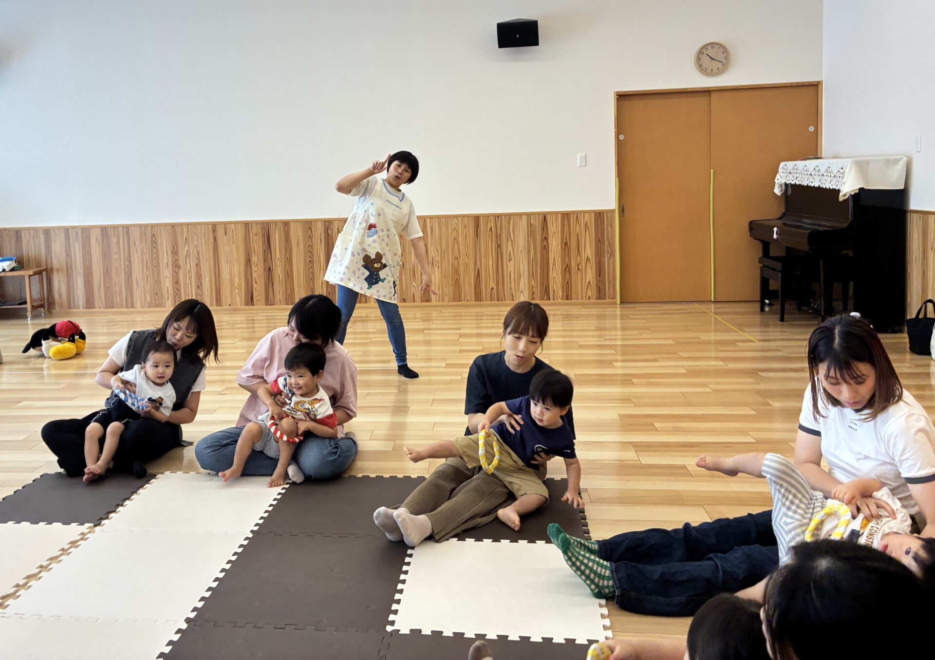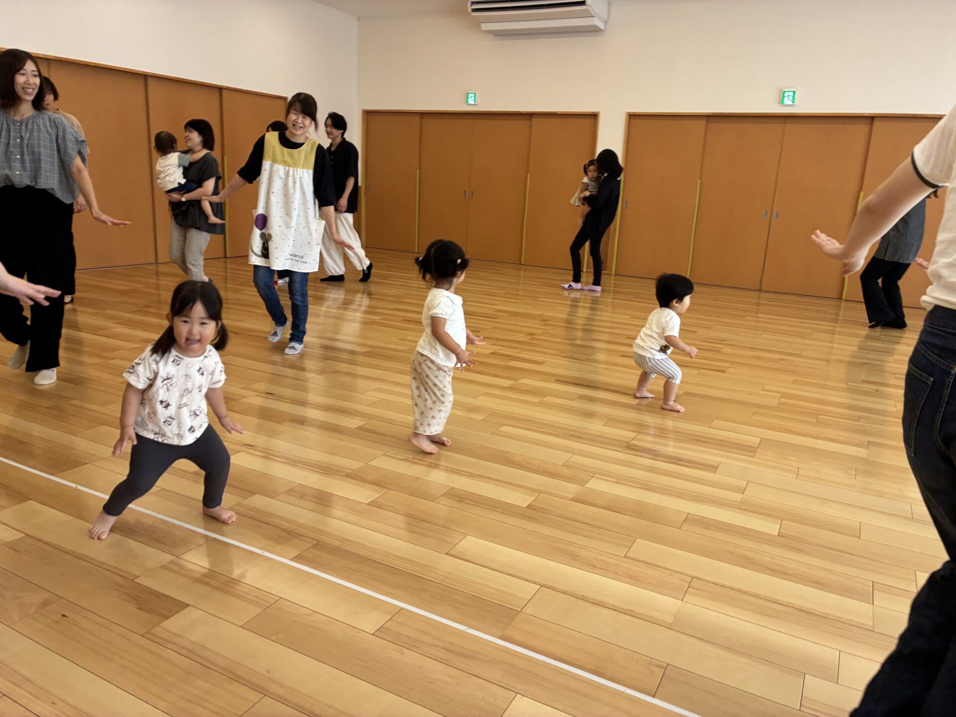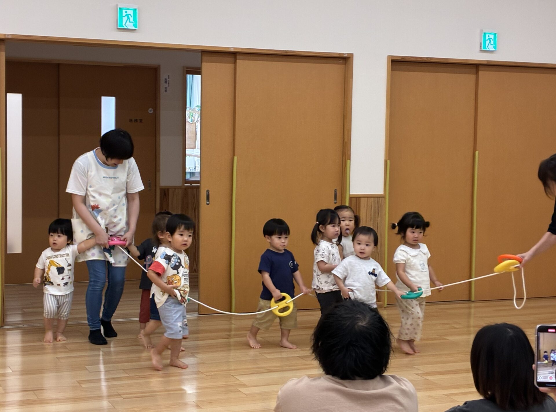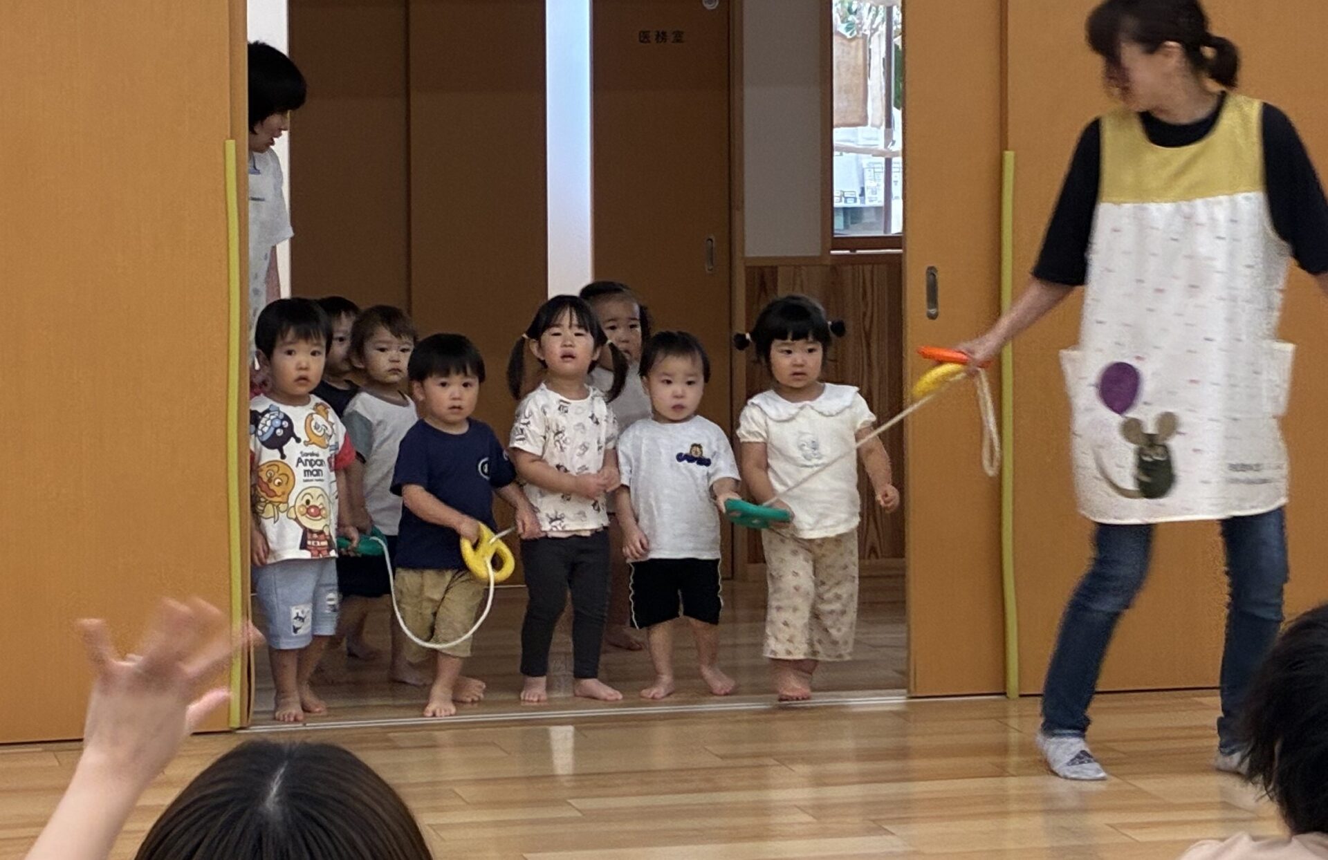 音楽に合わせて歩いたり止まったりするのが、とても上手なうみ組です♪今日は、お家の方に抱っこをしてもらって、嬉しそうでした😊