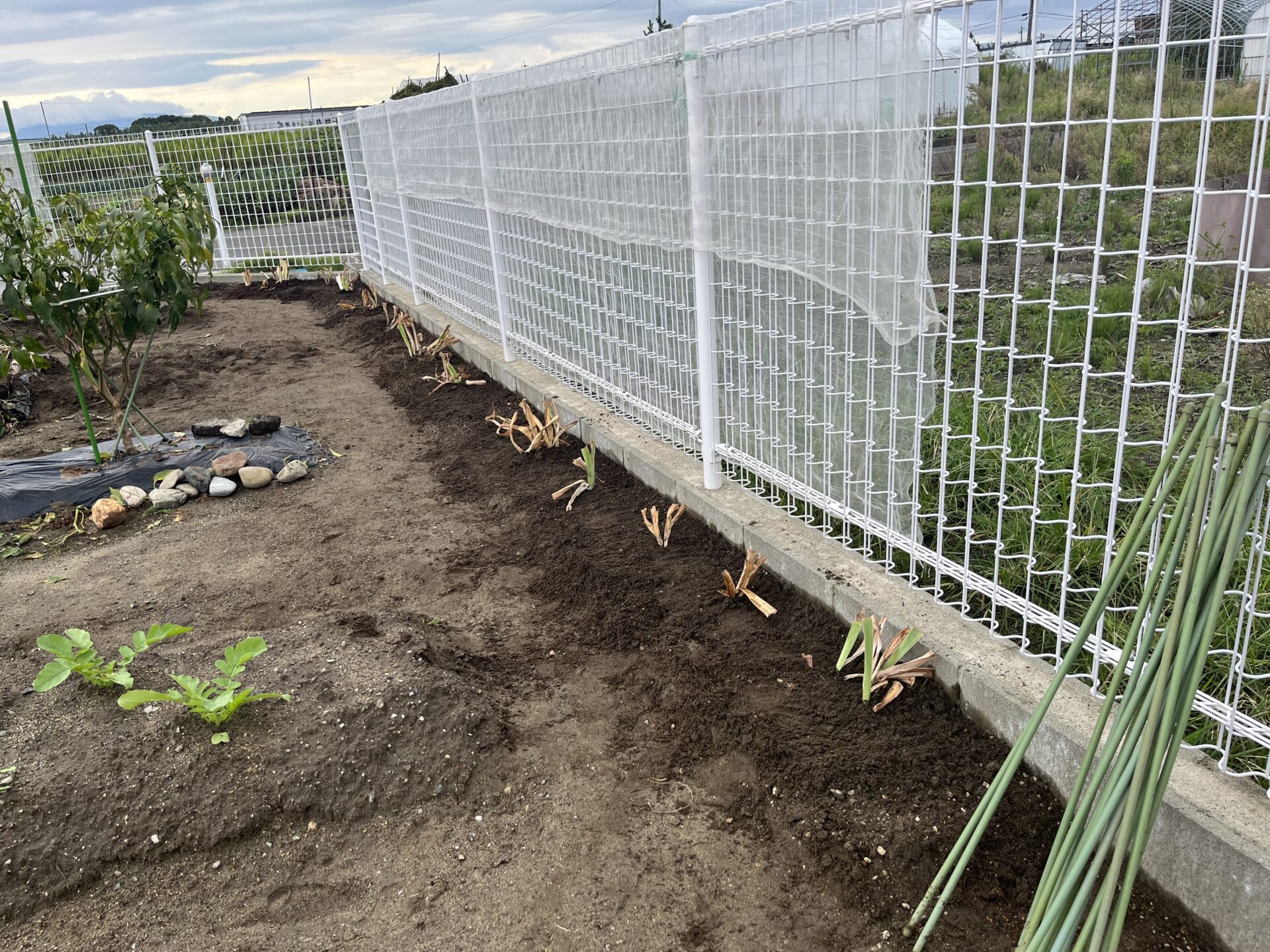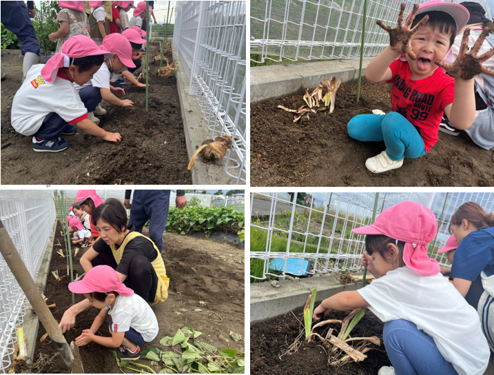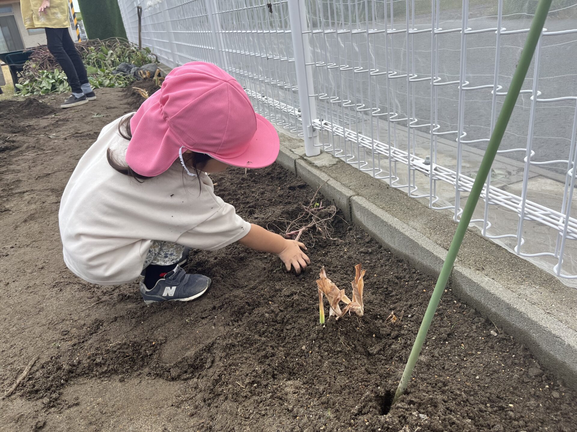 そんなジャーマンアイリスに、『ド根性姫』という名前を付けた地域の方が、株分けをしてくださり、にじ組(2歳児)の子どもたちが畑の隅に植えてくれました。