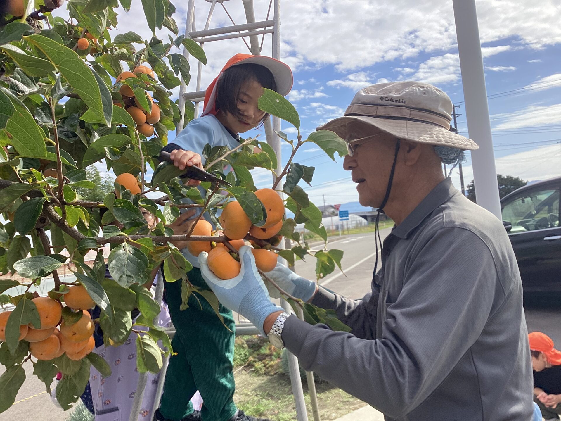 地域の方に手伝っていただきながら、脚立に上り、ヘタの近くをハサミで切って収穫しました。