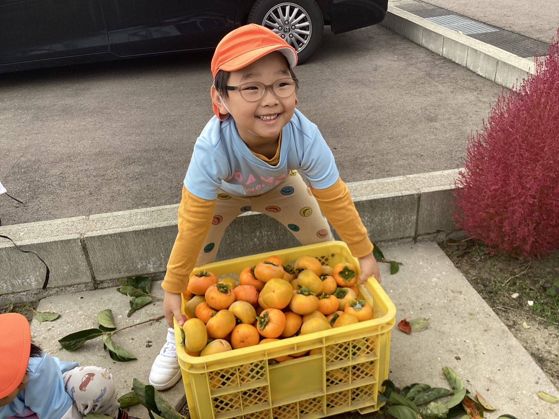 この作戦が功を奏して、カゴの中はどんどん柿の実でいっぱいになっていきました!