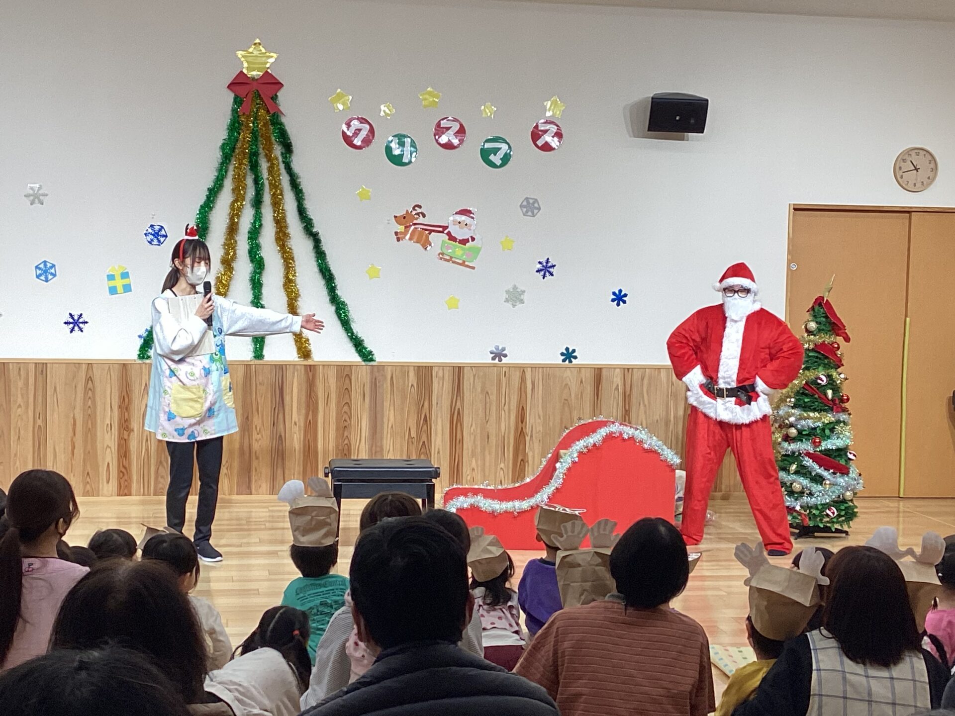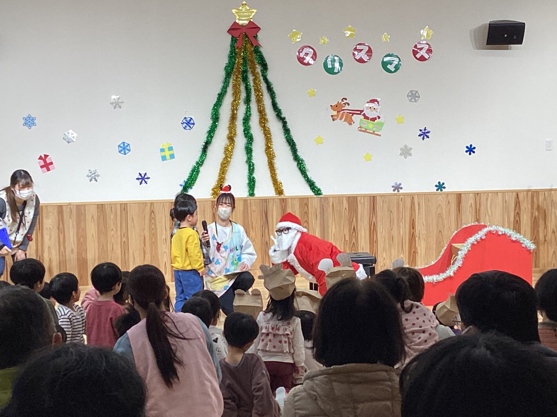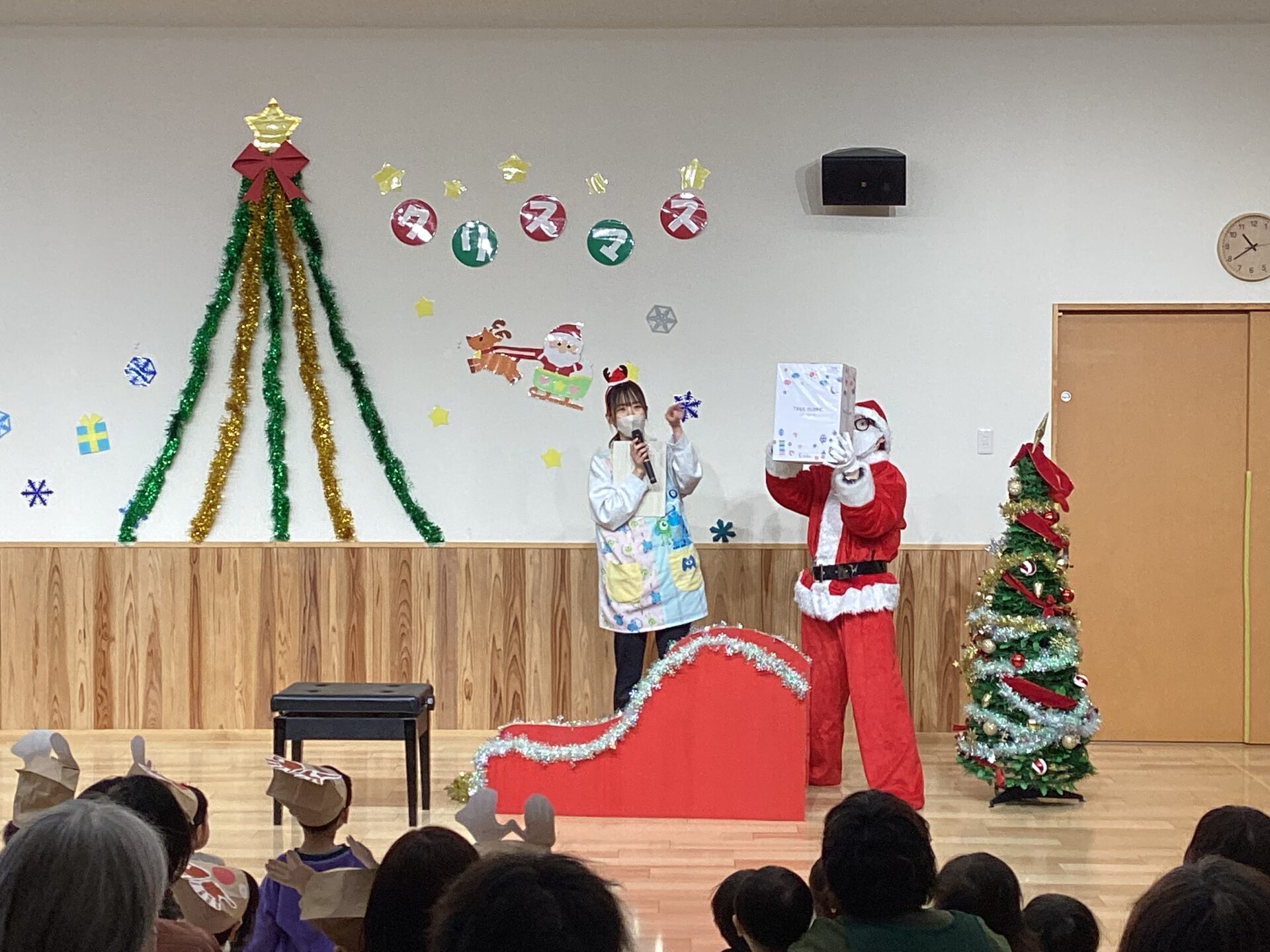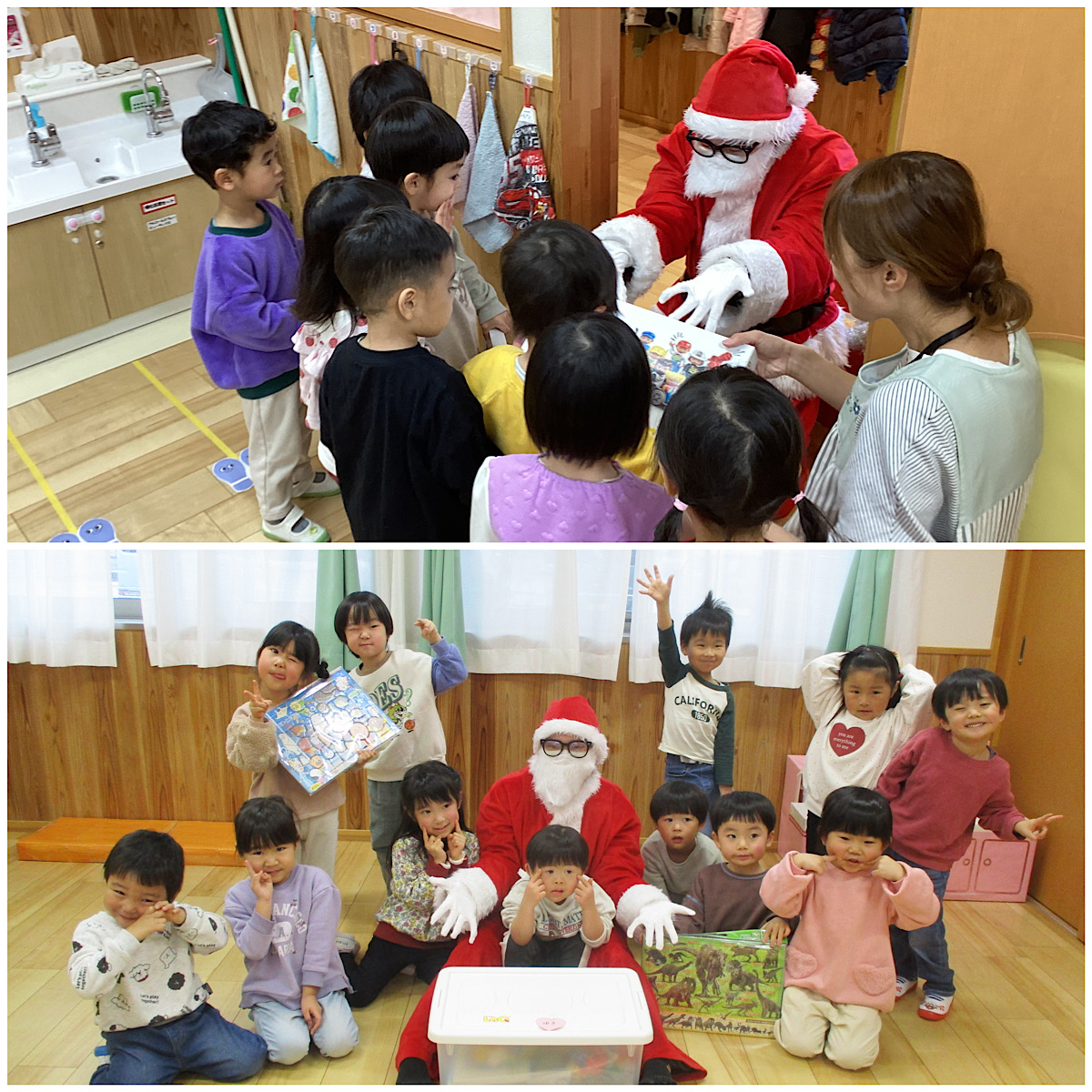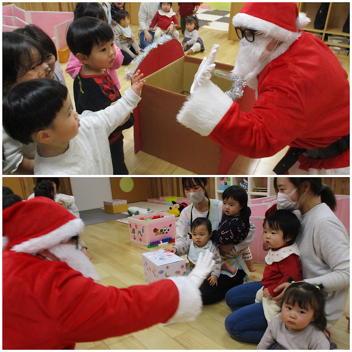 クリスマス会終了後、各クラスにプレゼントをお届けに来てくれたサンタさん。