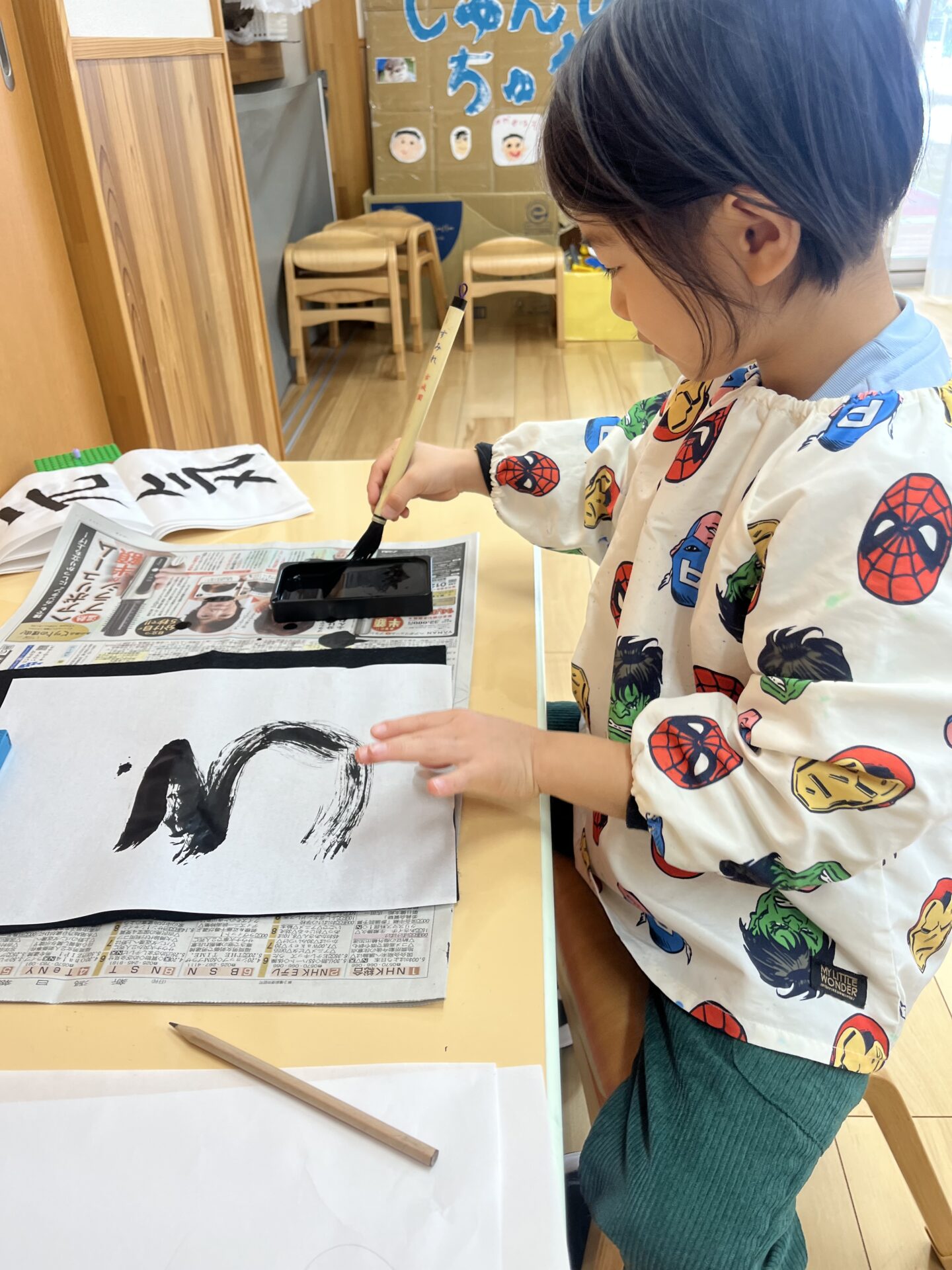 習字の筆で字を書くことは、初体験でしたが、『自分の名前』と『大好きなもの』を一画一画、真剣な表情で、書き上げていました!