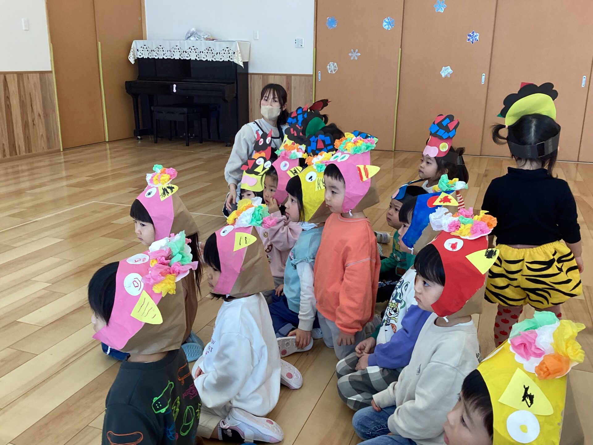 にじ組(2歳児)、ゆき組(3歳児)、そら組(4歳児)、つき組(5歳児)が、すてきなオニのお面をかぶり、少し緊張した表情でホールに集合しました。