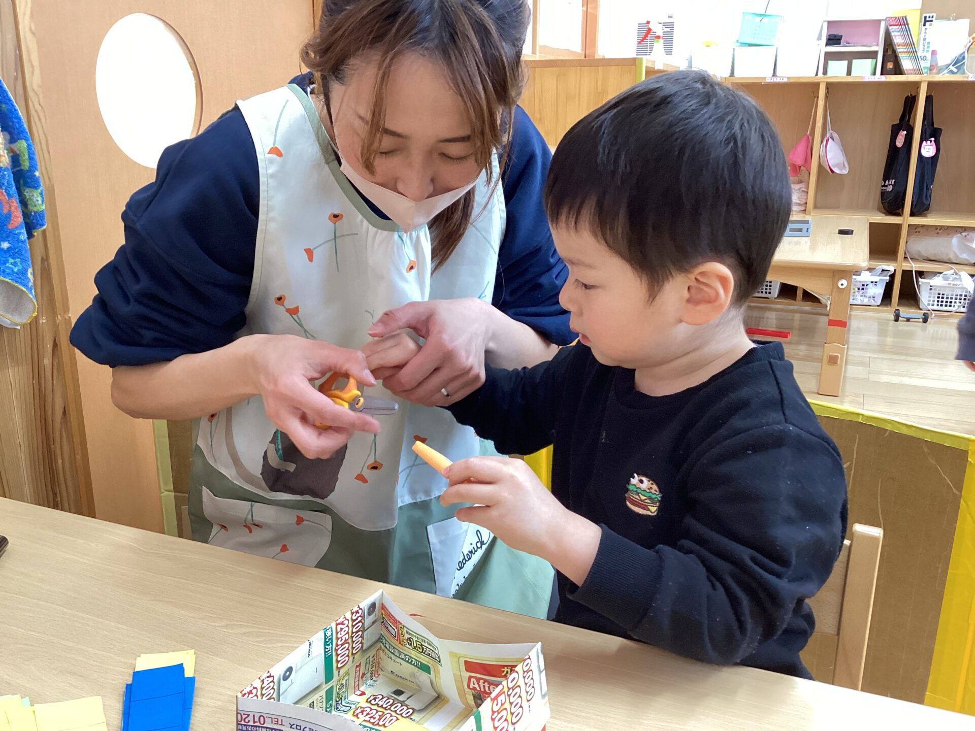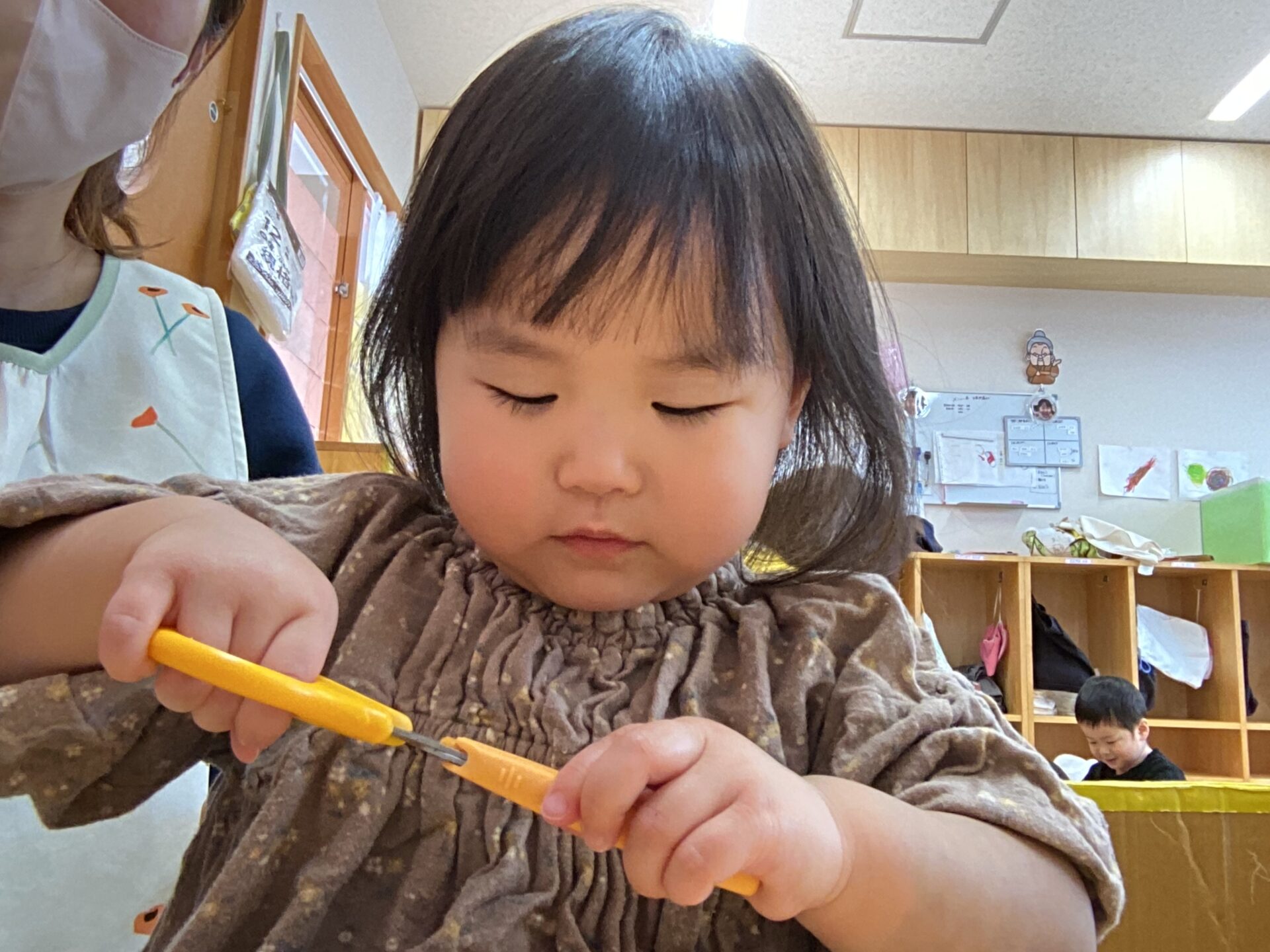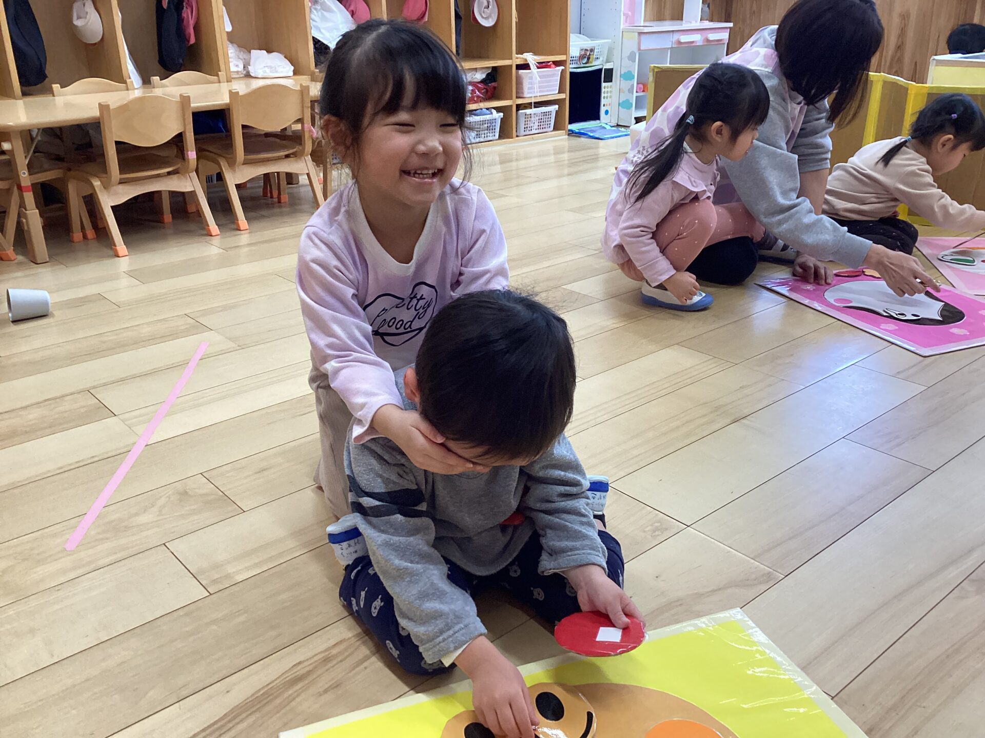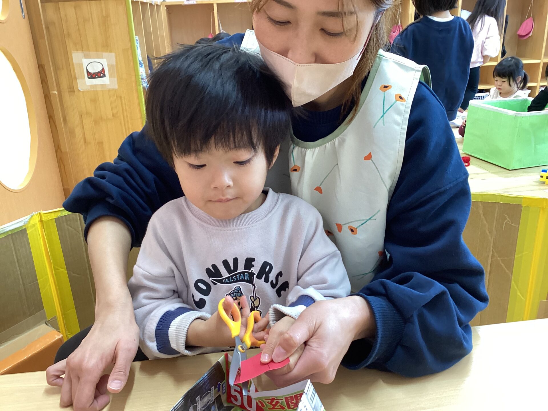 鬼のお面つくりでは、ハサミにも挑戦!「お家で使ったことある~」と話す子も多く、紙に描いてある線に沿って上手に切り、最後はしっかり蓋をして片付けました。