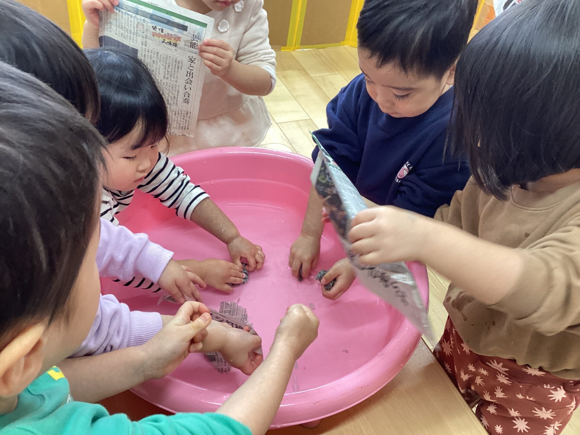 色々なことを体験しています。節分の時は、みんなで「豆」作りをしました。新聞紙を水に浸し、ぎゅ~っとしぼって丸めます。水に濡れた新聞紙の感触が楽しかったようで、予定していたよりもたくさんの豆が出来上がりました。