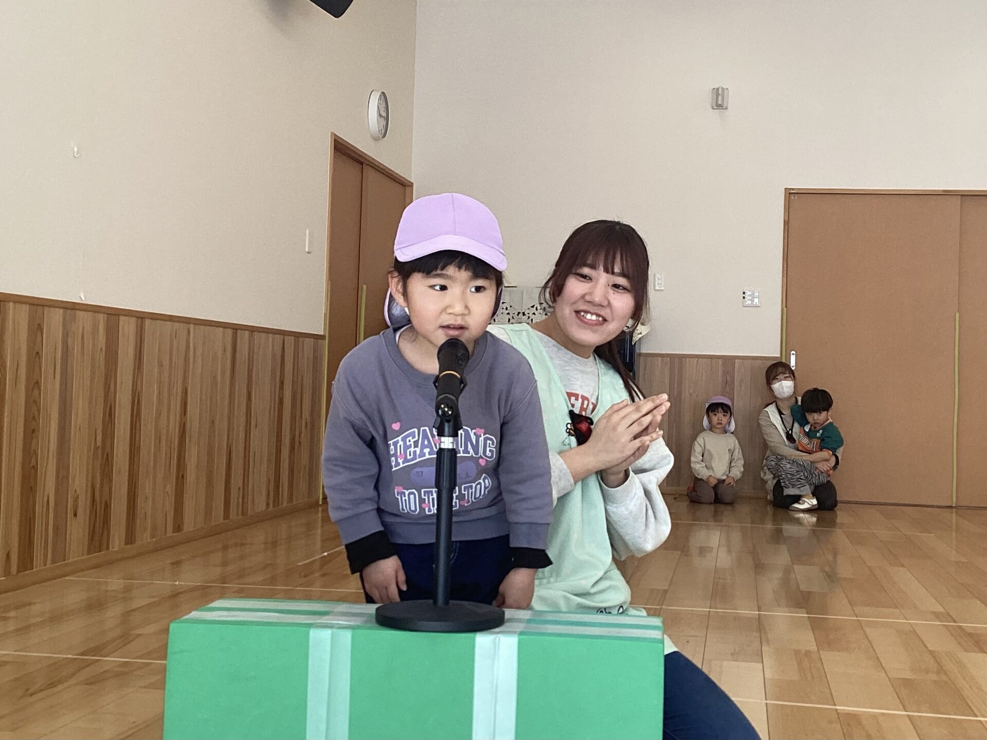 ホールに設置されていたマイクを見て、「何するんだろね?」「歌ってもいいんじゃない?」と、楽しみにする子どもたち。