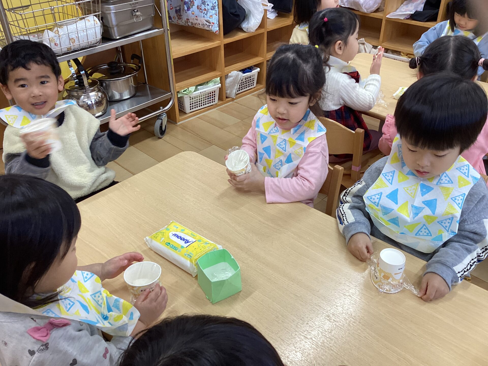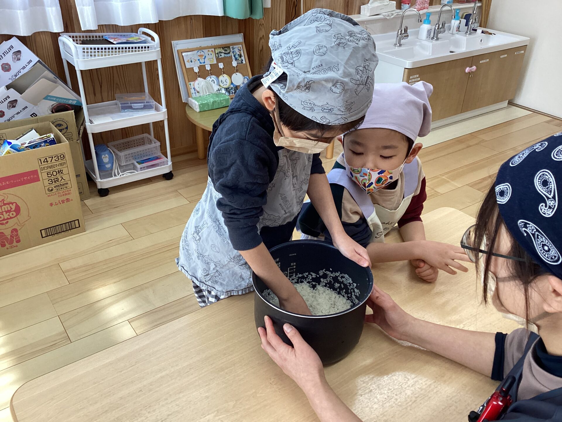 お米の感触などを感じながら、冬場に冷たい水での米研ぎを体験し、「お湯で研ぎたいよね~」と話したり、研ぎ汁を見て「なんでお水が白くなるの?」と話したり、いろんな感想がきかれました🤭