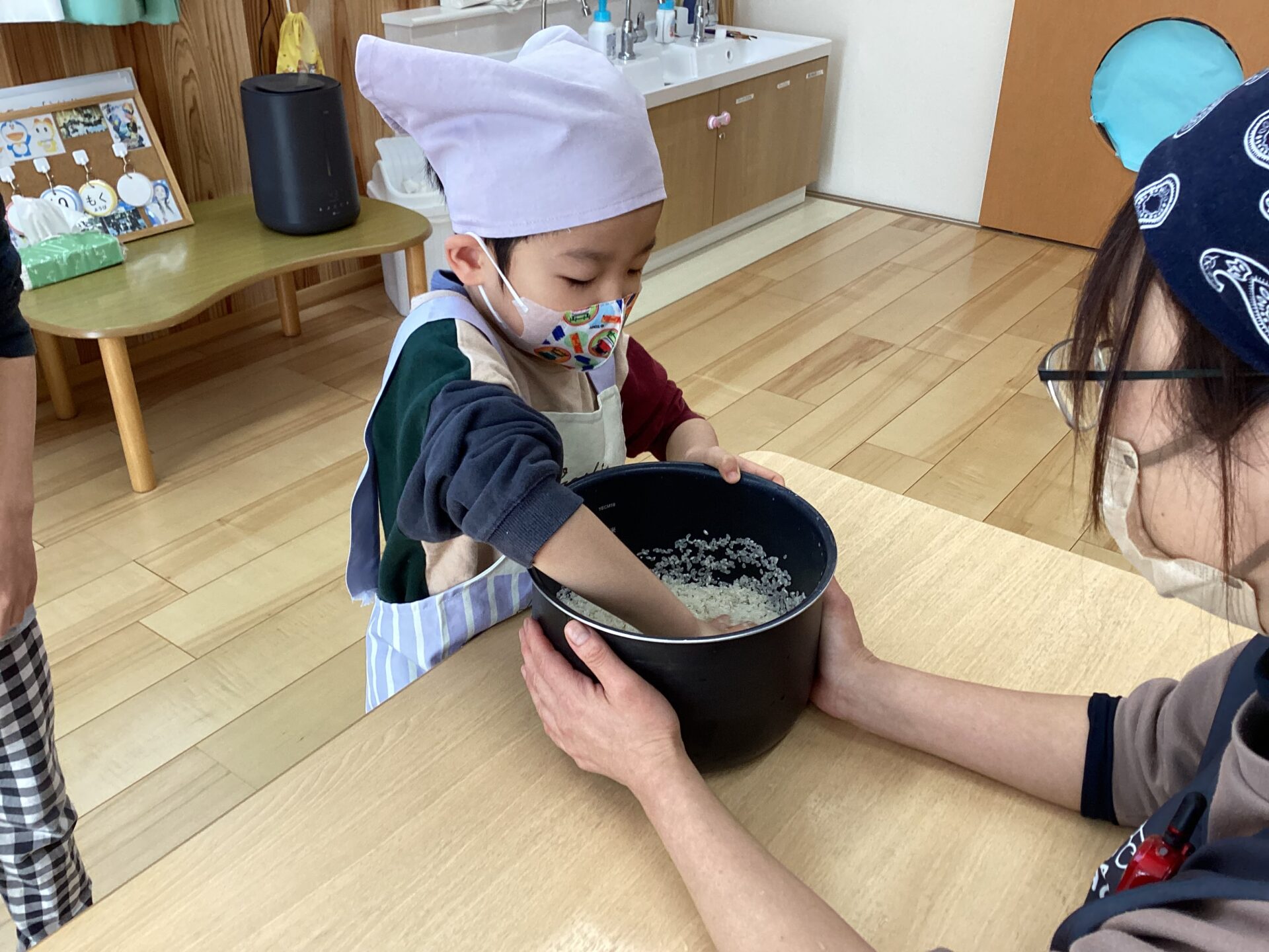 じつは・・・つきぐみさん(5歳児)は、朝、米研ぎ体験もしていました。