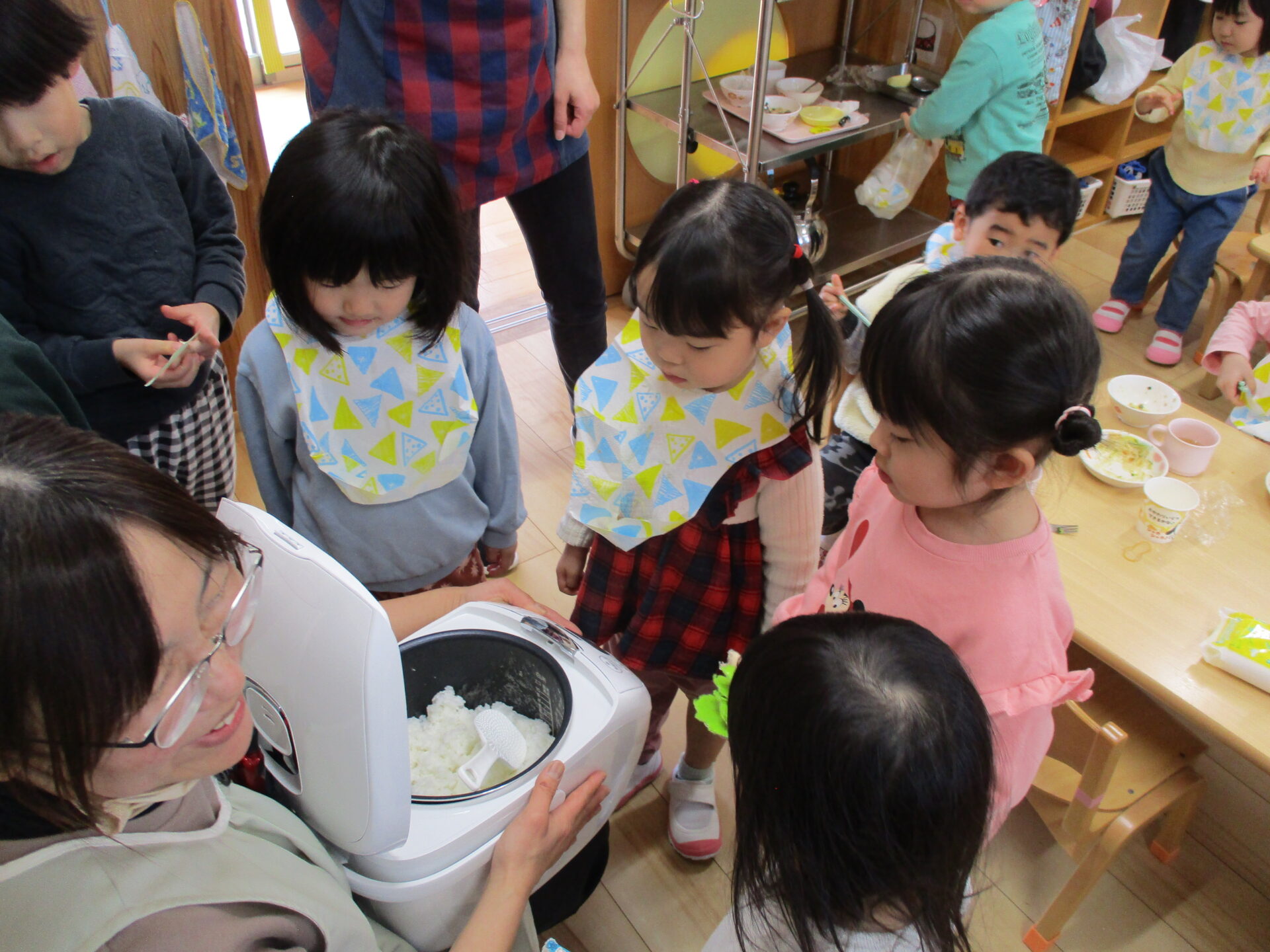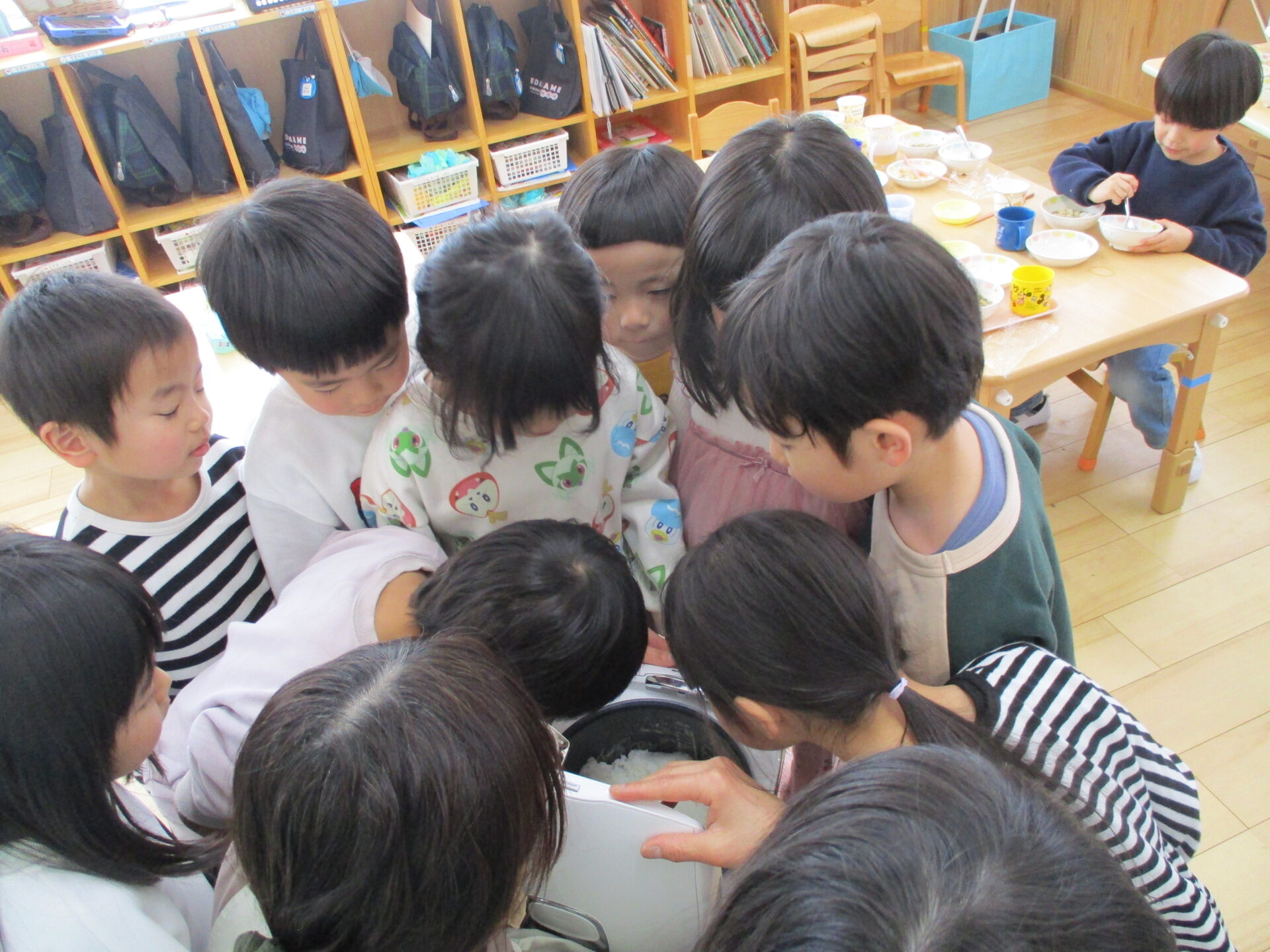 「いい匂い~」「あったかくておいしそう!」と炊飯器をのぞきこんで、みんな興味津々に見ていました。