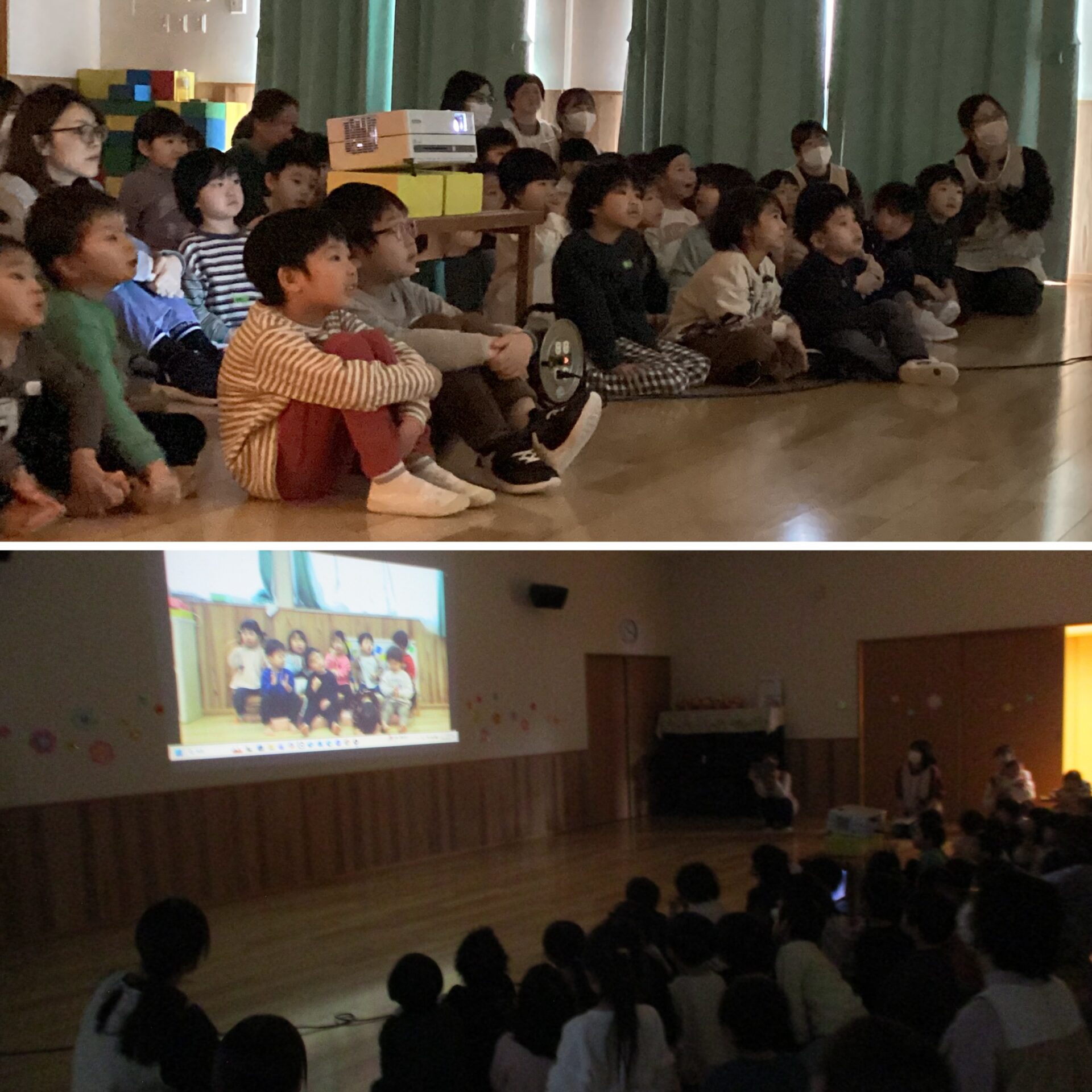 えだまめ組(0歳児)、うみ組(1歳児)、にじ組(2歳児)から、『ありがとう』の気持ちを込めた、手あそび、先生たちから『ありがとう』の気持ちを込めたメッセージを、ぎゅぎゅっと集めた動画のプレゼント🎁を鑑賞しました。