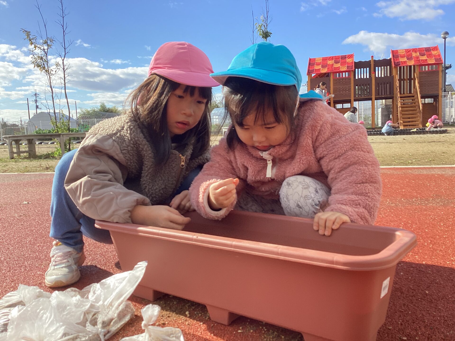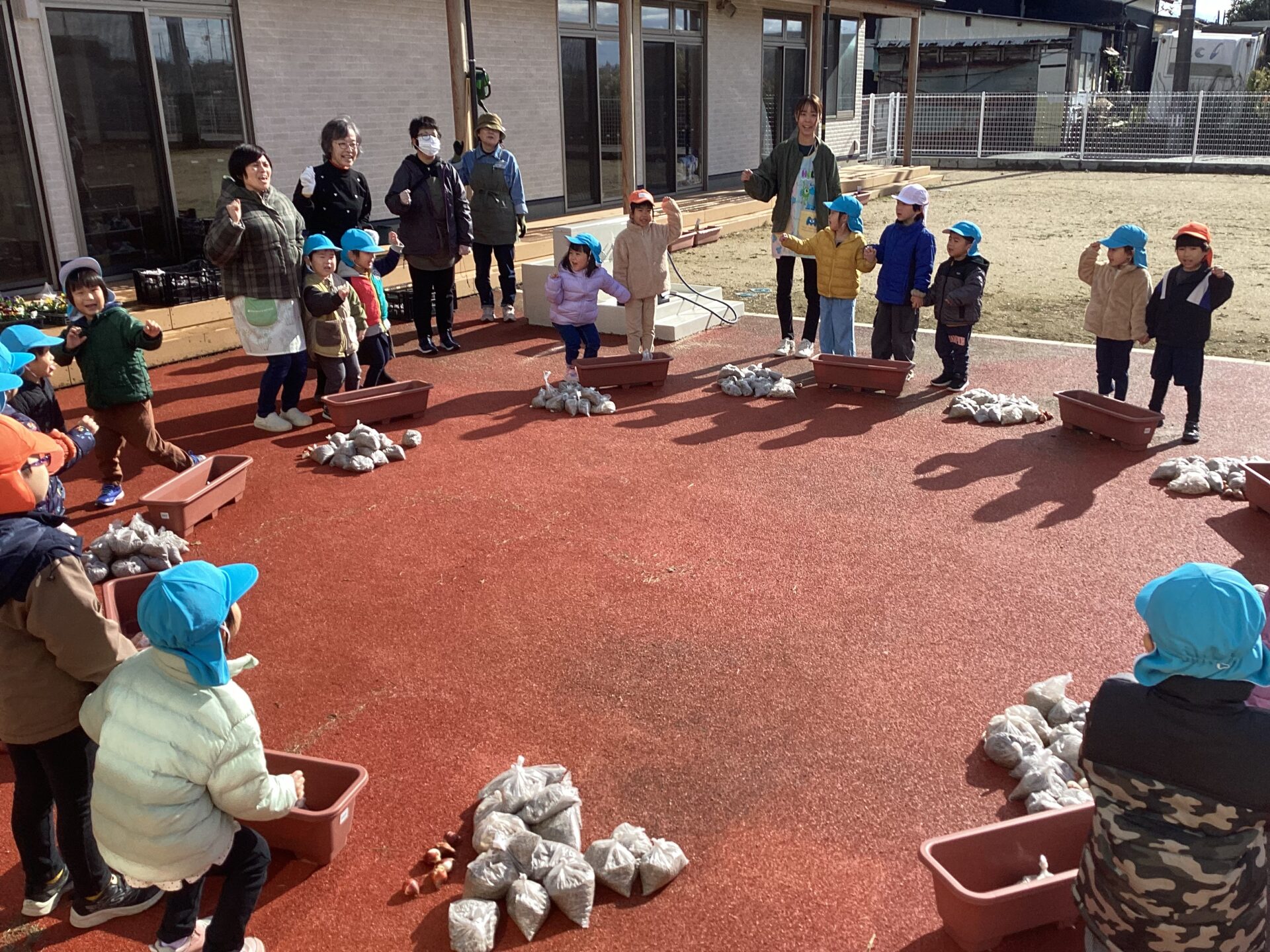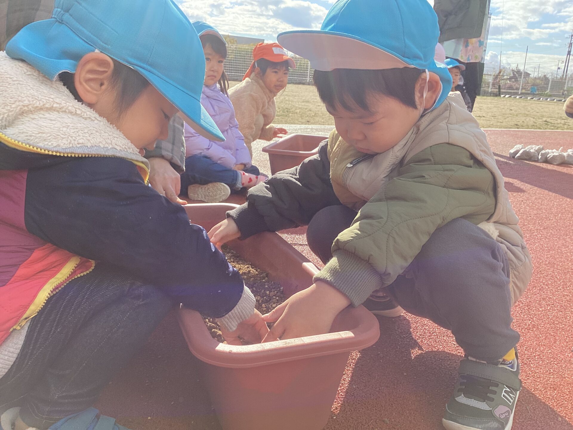 ゆき・そら・つき組、縦割りのチームになり、相談し合いながら、プランターに土を入れ、球根、花苗を植えました。